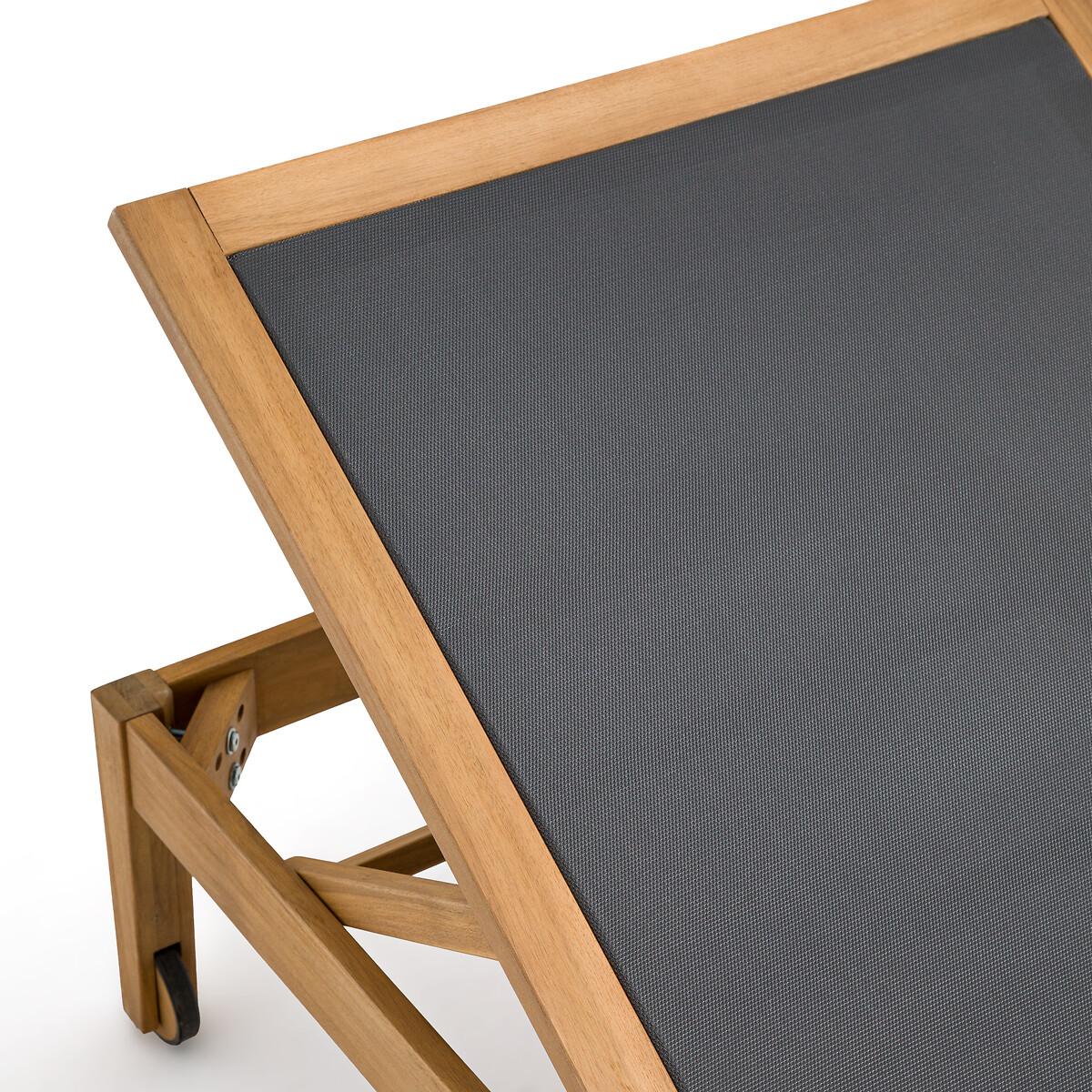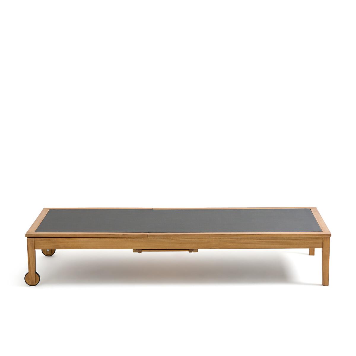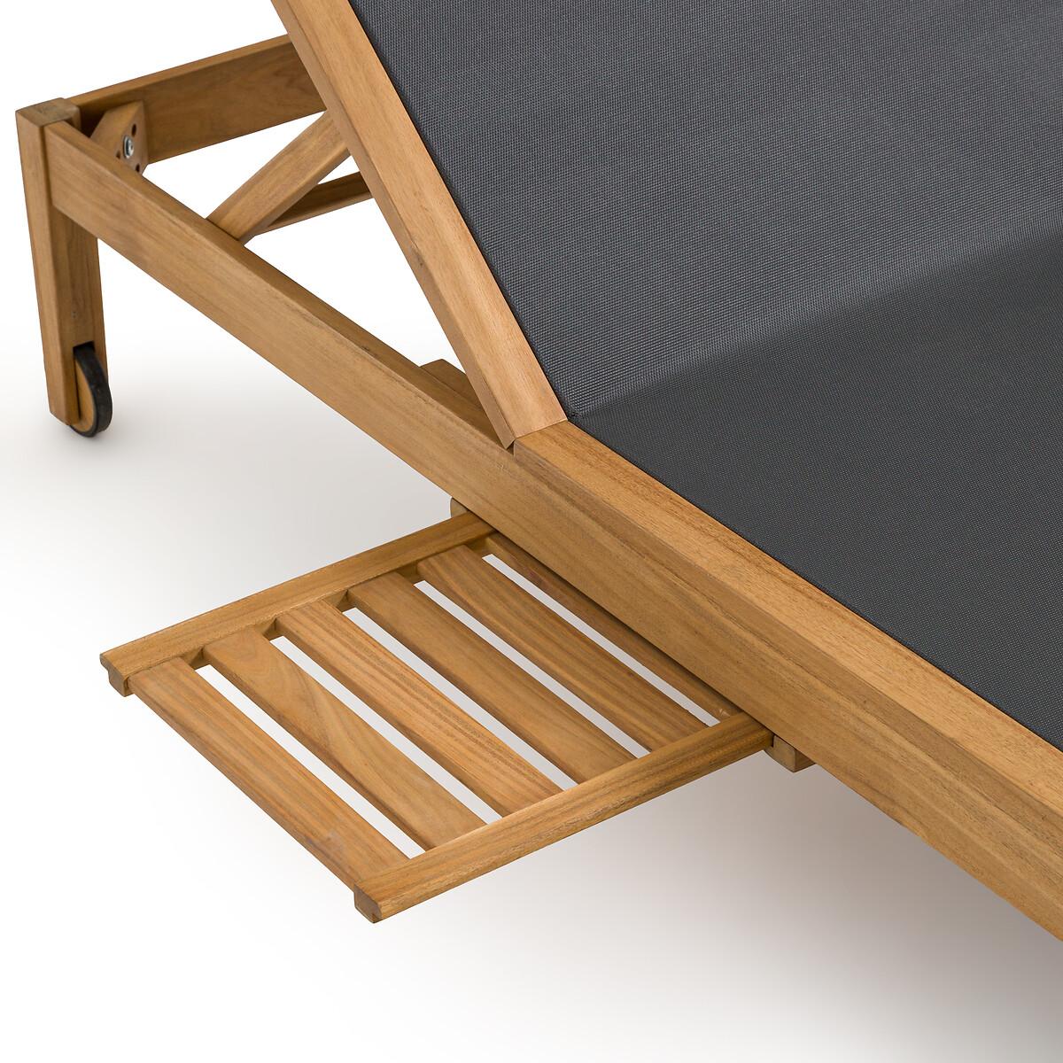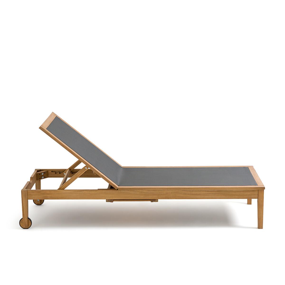 Enjoy the sun with the Limbo sun lounger. Get comfortable with its 4-position adjustable backrest. Clever, it has a retractable shelf under the seat to store your belongings. Product Details • FSC® acacia structure with oiled finish • 100% polyester canvas • Extendable, retractable side table under the seat • Backrest adjustable to 4 positions • 2 wheels. Quality Info • Acacia is a wood that offers good mechanical properties (good resistance to insects and fungi) and is resistant to bad weather (alternation of dry and humid periods).Dimensions • Length: 195cm • Height: 35cm • Width: 75cm • Weight: 17kgDelivery:. This product is sold ready to assemble. Note! Please check that all access points are large enough to accommodate your delivery (doors, stairs, lifts). • WOOD FROM SUSTAINABLY MANAGED FORESTS. FSC® certified wood comes from forests that are environmentally, socially and economically well managed. Dimensions and weight of parcel1 parcel • L202 x H13.5 x D79.5cm. 21.5kg.