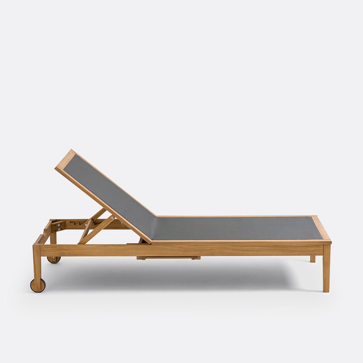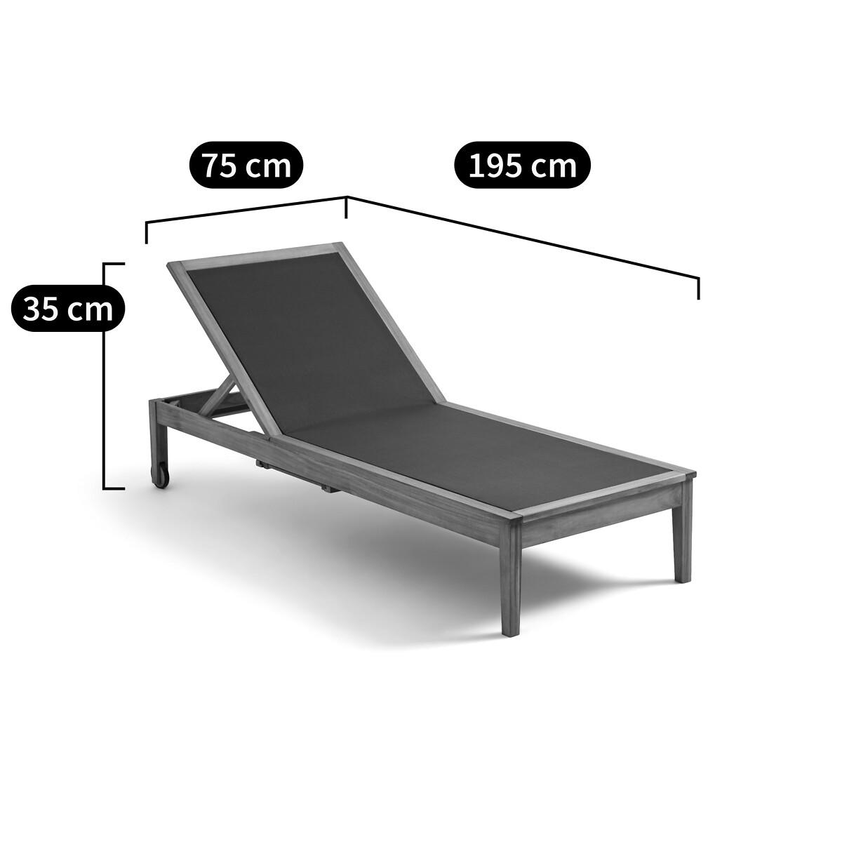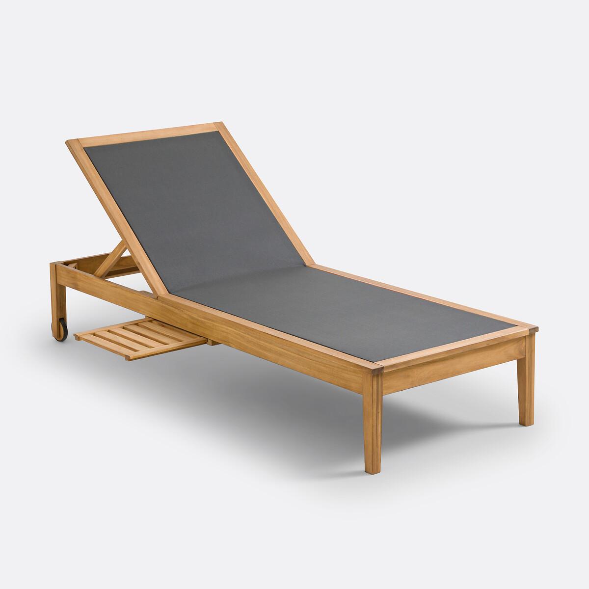 Enjoy the sun with the Limbo sun lounger. Get comfortable with its 4-position adjustable backrest. Clever, it has a retractable shelf under the seat to store your belongings. Product Details • FSC® acacia structure with oiled finish • 100% polyester canvas • Extendable, retractable side table under the seat • Backrest adjustable to 4 positions • 2 wheels. Quality Info • Acacia is a wood that offers good mechanical properties (good resistance to insects and fungi) and is resistant to bad weather (alternation of dry and humid periods).Dimensions • Length: 195cm • Height: 35cm • Width: 75cm • Weight: 17kgDelivery:. This product is sold ready to assemble. Note! Please check that all access points are large enough to accommodate your delivery (doors, stairs, lifts). • WOOD FROM SUSTAINABLY MANAGED FORESTS. FSC® certified wood comes from forests that are environmentally, socially and economically well managed. Dimensions and weight of parcel1 parcel • L202 x H13.5 x D79.5cm. 21.5kg.