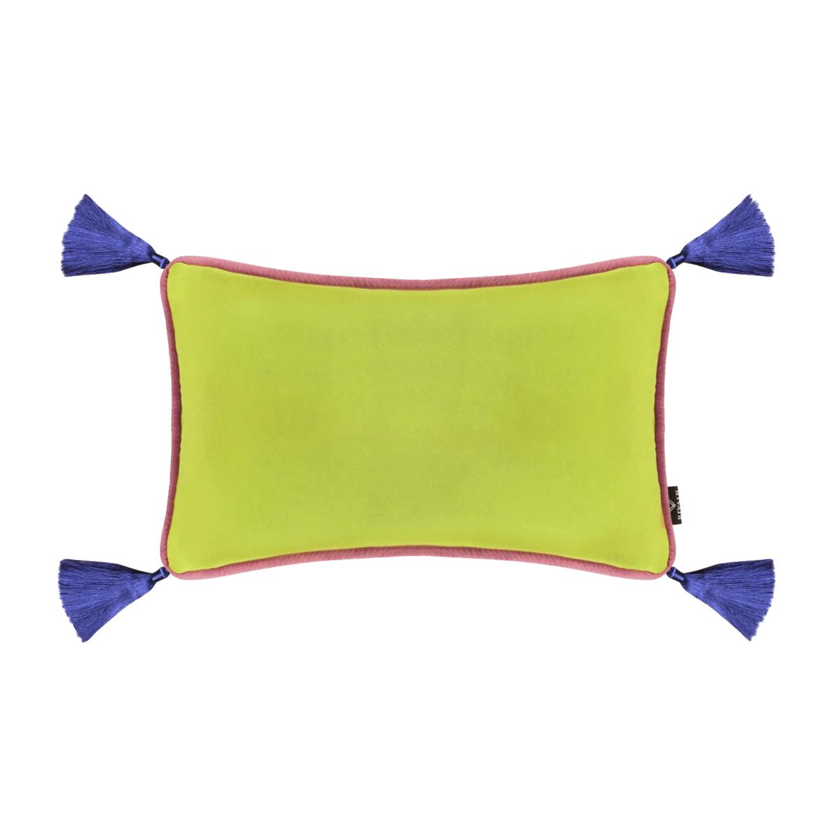 Lime green velvet rectangular cushion with pink piping and blue tassels This rectangular velvet lumbar cushion adds a touch of luxe and cosiness to any room. Handcrafted in small batches, this scatter cushion is made in a lime green velvet with luxurious feel and finished with a pale pink piping and silky royal blue tassels. Composition: Velvet front and back, velvet piping, polyester tassels Includes feather pad Removable cover Discreet zip closure Dry clean only
