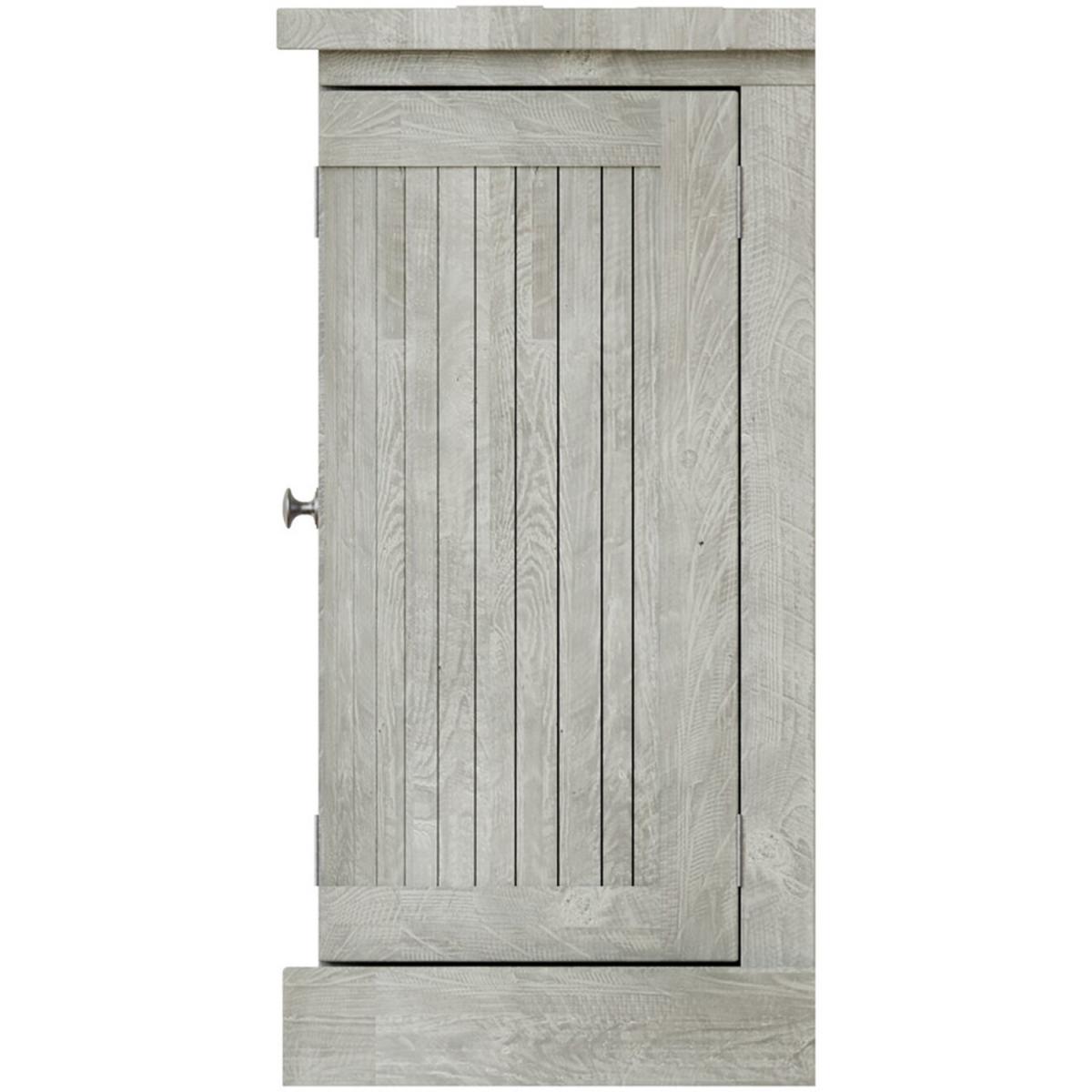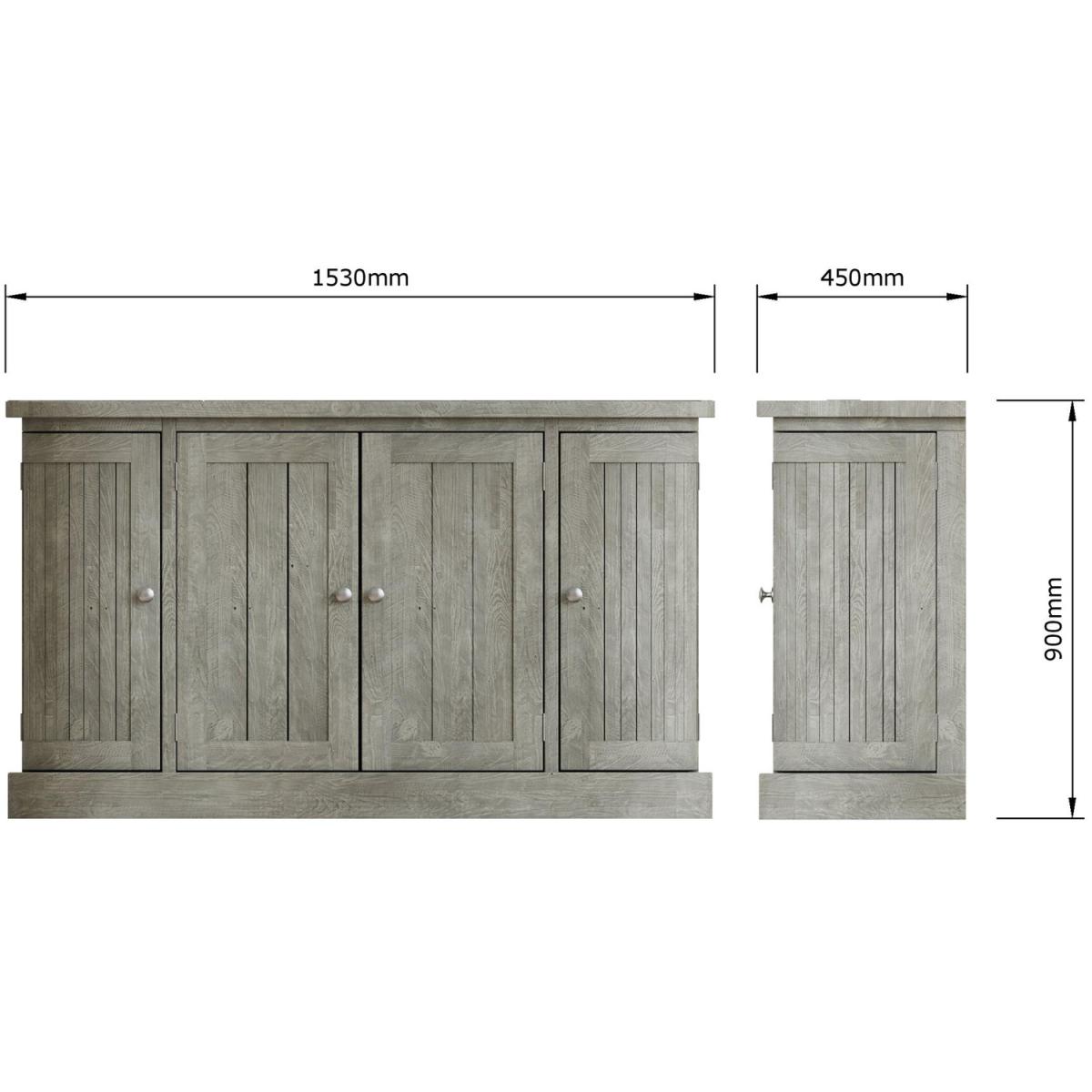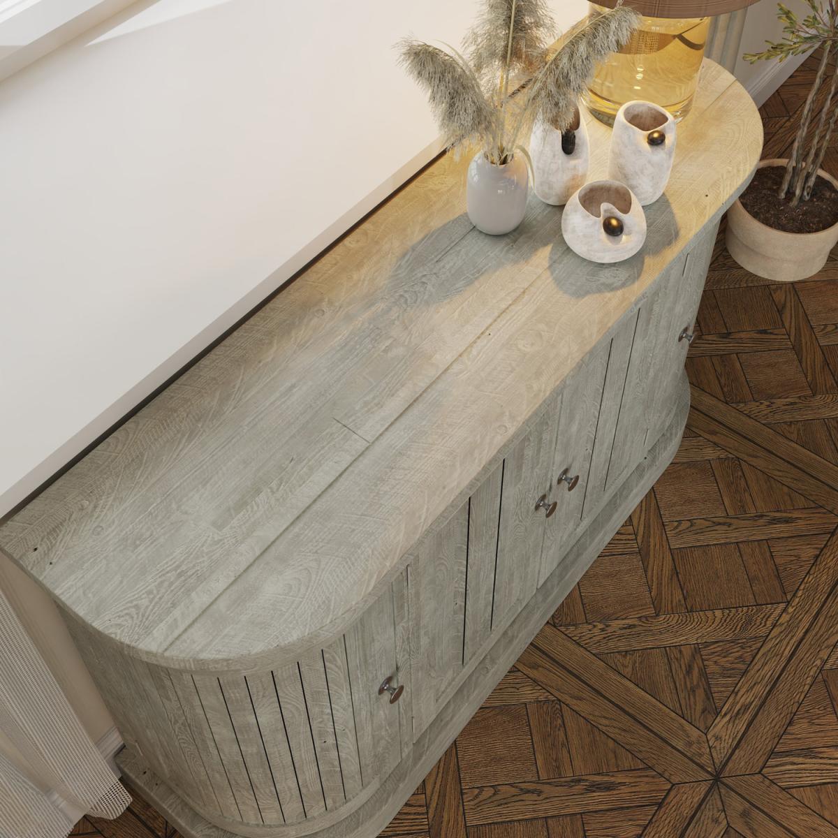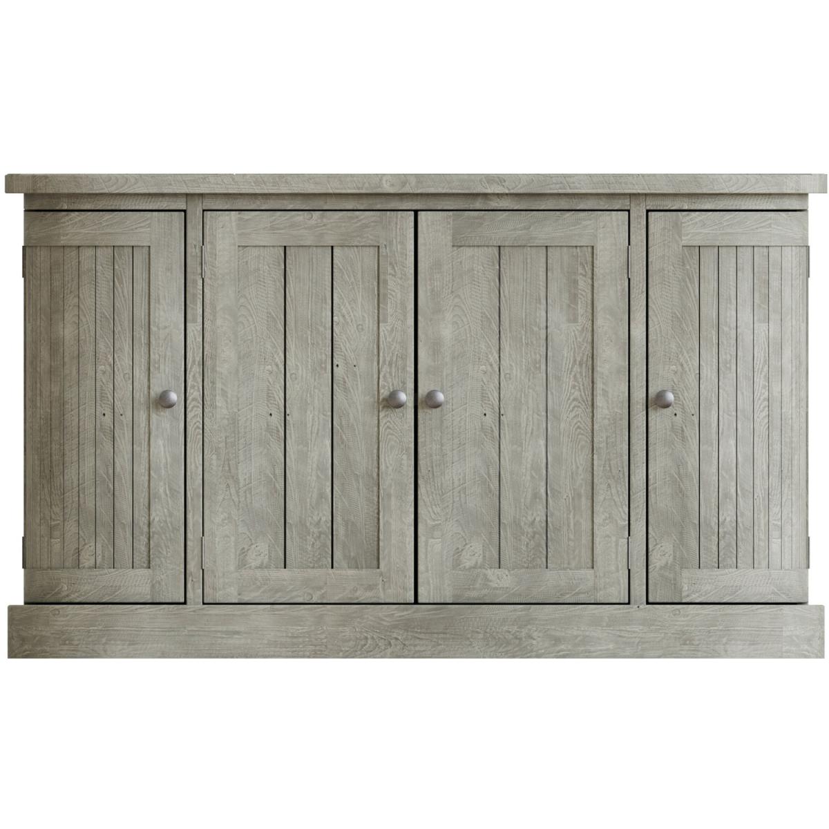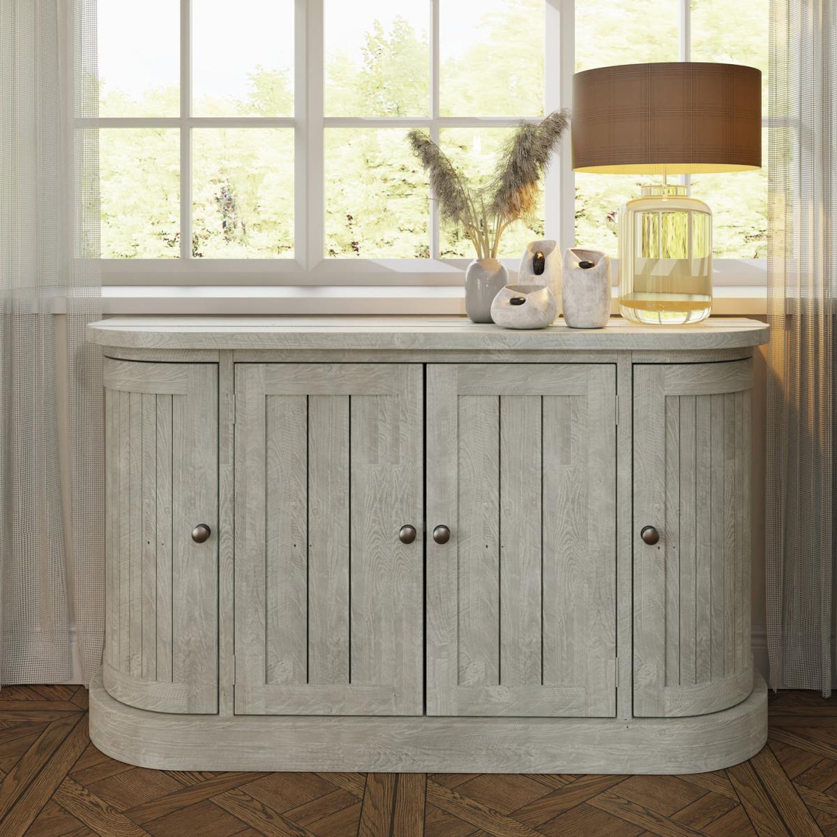 Introducing our exquisite Large 4 Door Sideboard, crafted from the finest Lime Washed Reclaimed Pine. This stunning piece combines functionality with timeless beauty, making it a perfect addition to any home. Handmade and handfinished, each sideboard is truly unique, showcasing the natural variations and character of the wood. With four large doors and a spacious interior, this sideboard offers ample storage space for all your belongings. The middle shelf divides the interior into six compartments, providing organization and convenience. The Pewter Style Metal Handles add a touch of sophistication, while the curved design lends an elegant and graceful appearance. Delivered pre-assembled, this sideboard is ready to enhance your living space with its charm and practicality.