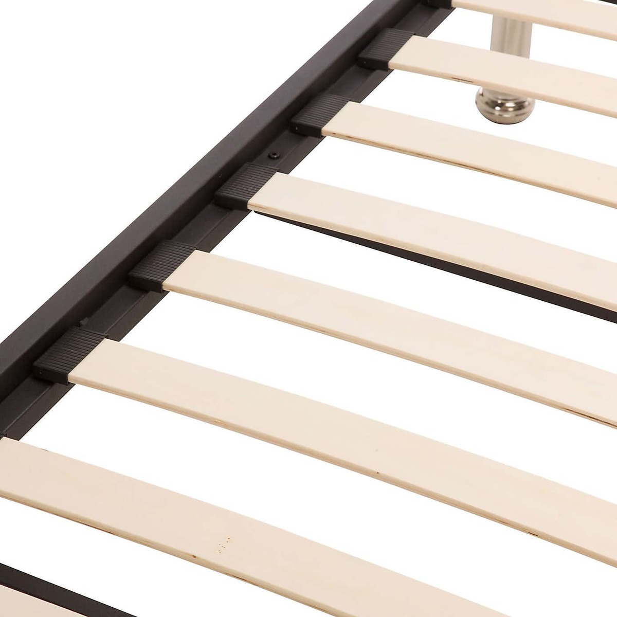 I’d call this the Callisto bedstead - its slim chrome frame and faceted crystal finials bring a hint of sparkle without feeling over-the-top. It works well in both contemporary and transitional bedrooms, pairing neatly with neutral linens and a soft grey or blush accent wall. For a cohesive look, layer textured throws and cushions in muted tones, add a simple wooden or marble-topped bedside table, and choose a low-profile rug to ground the space.