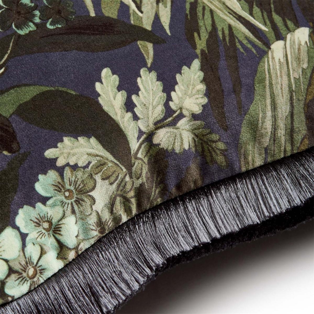 Introduce a tropical vibe with the Limerence print cushion from House of Hackney, crafted from sumptuous velvet and finished with a fringed border. Inspired by the botanical vistas of Sri Lanka with luscious palms, flowers and foliage used to sublime effect, it will bring a touch of paradise to your interiors. Each item sold enables House of Hackney to purchase and protect 35 sqm of forest through its partnership with the World Land Trust.