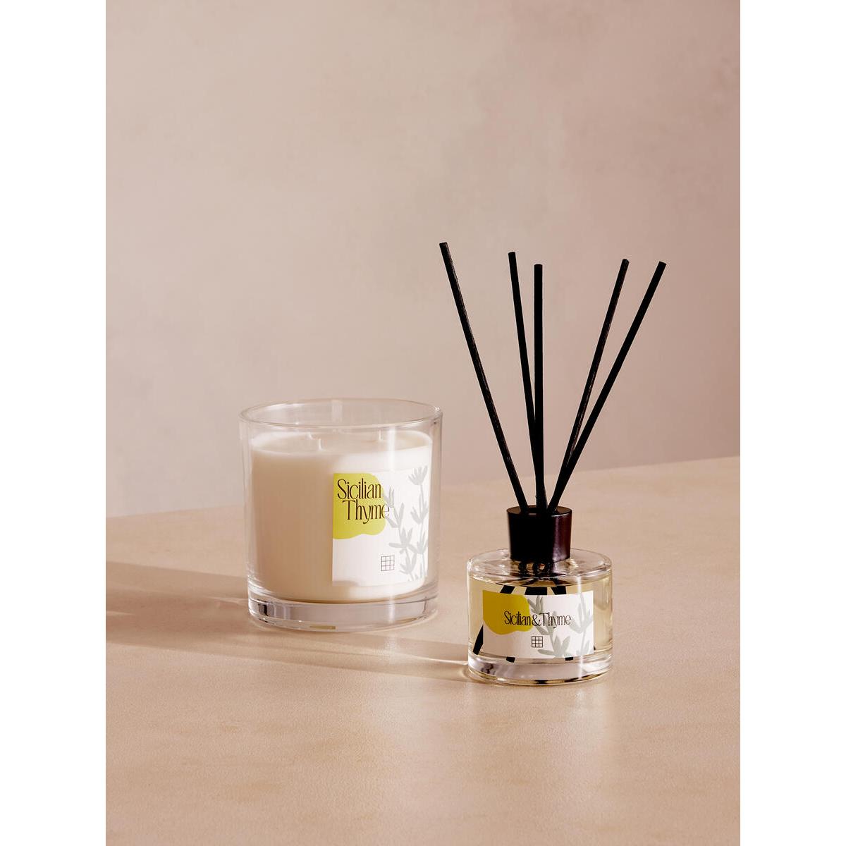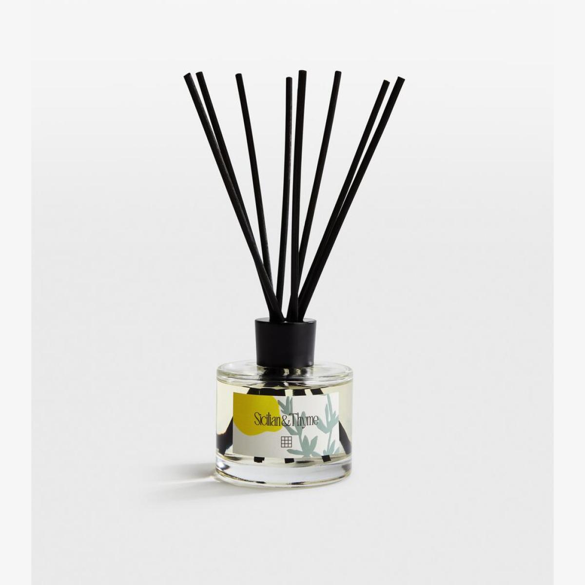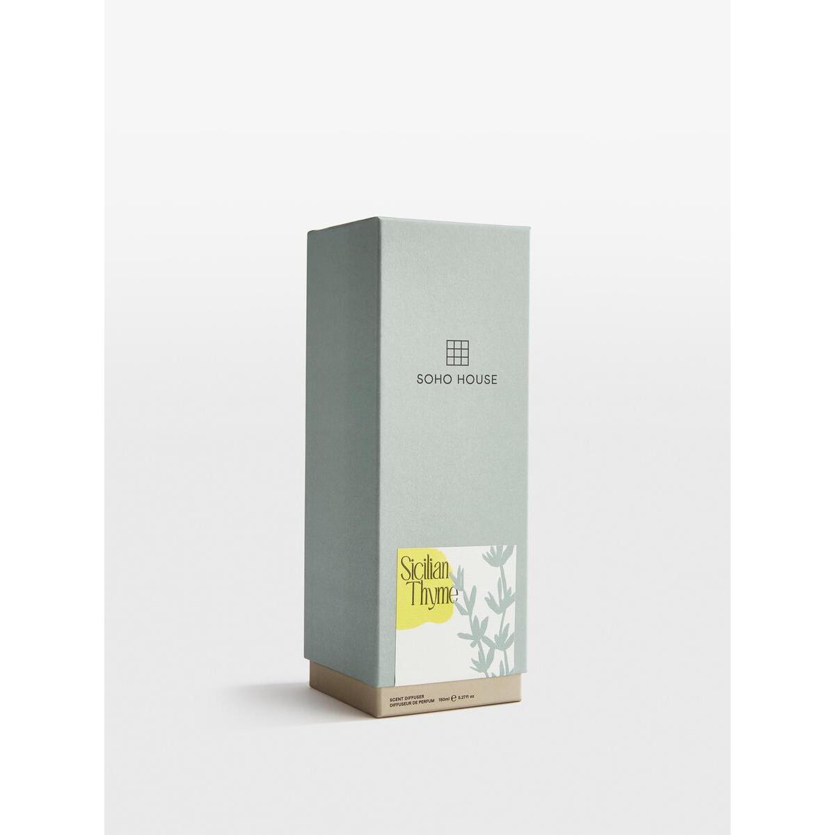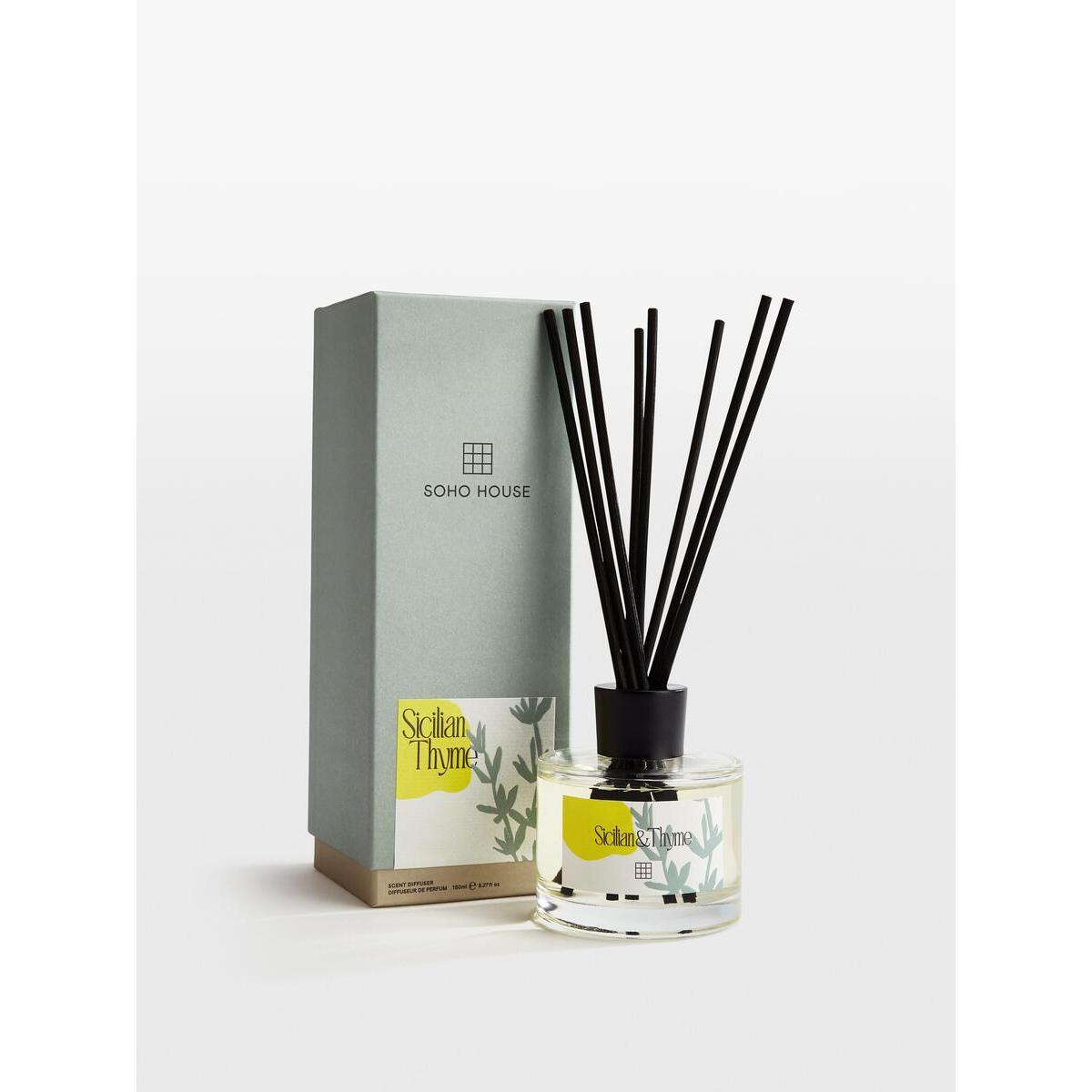 Aromatic, warm and bright, the limited-edition Sicilian Thyme Bassett diffuser blends top notes of Lemon, Thyme, Pine, Lavender, and a hint of red fruit. Undertones of Patchouli and Amber round it off to capture the essence of Italian breakfasts on the morning terrace at Soho House Rome. The glass vessel features a bespoke label designed by our in-house creative team, with abstract motifs that depict the signature scent and reference the cut-outs Henri Matisse created in the last decade of his life. Use the diffuser to fill your home with an uplifting, long-lasting aroma. Scent notes Top: Thyme Middle: Pine Base: Amber Limited-edition diffuser with Sicilian Thyme fragrance Glass vessel Porous black rattan reeds soak up and emit fragrance Lasts up to 12 weeks Bespoke label designed in-house Abstract motifs of each scent 150ml/ 5.27fl oz Inspired by Soho House Rome