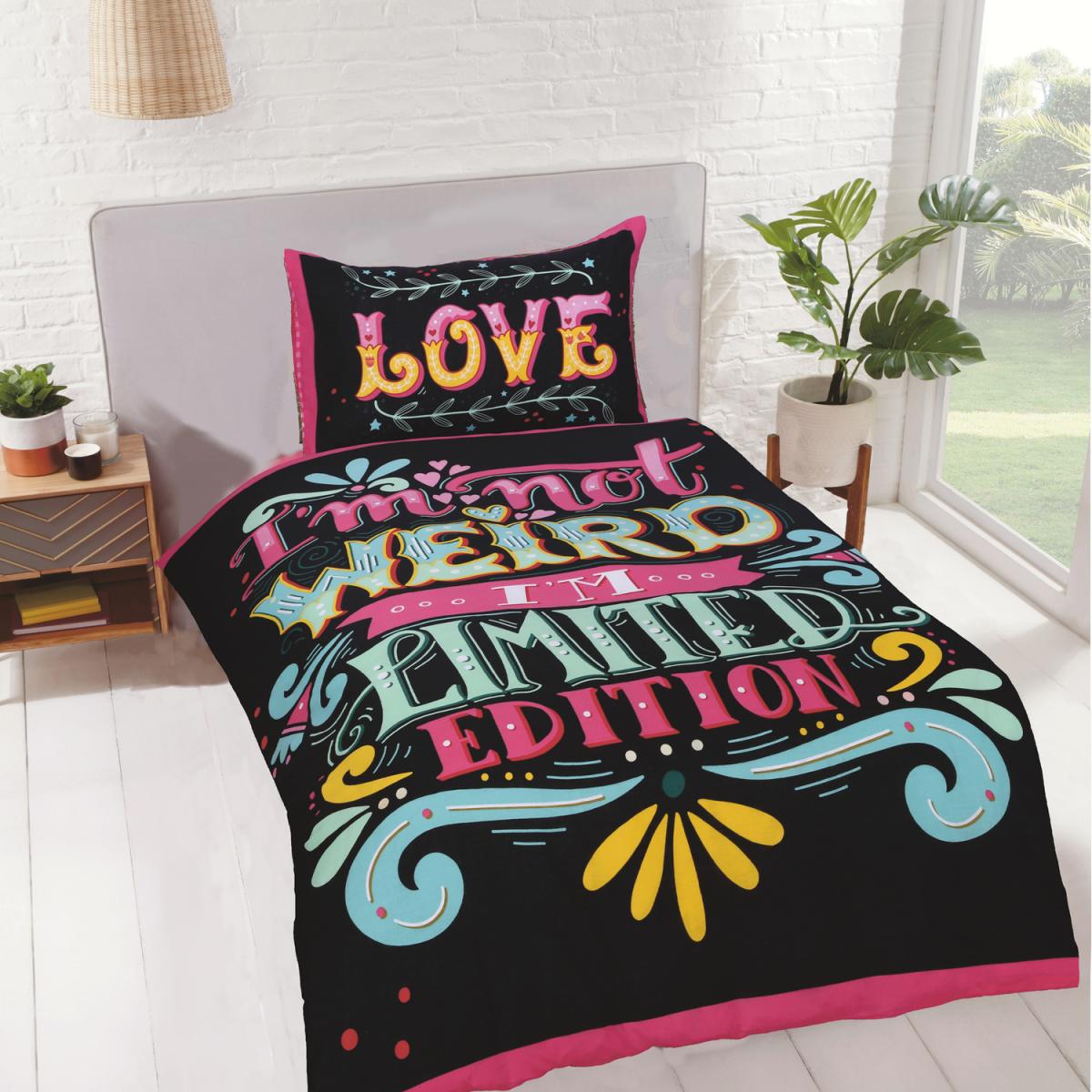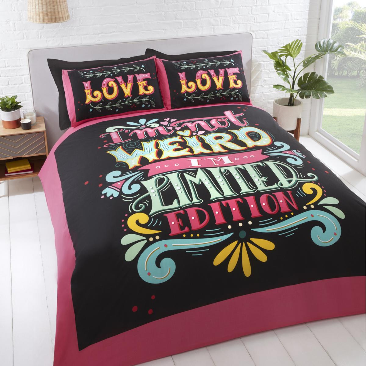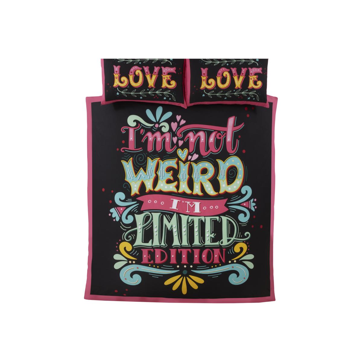 Add some fun to your bedroom and create a bold look with our limited edition bedding. This design features the words im not weird im limited edition beautifully printed in on trend colours, this range is simply gorgeous and creates an overall look that is fun and colourful.
