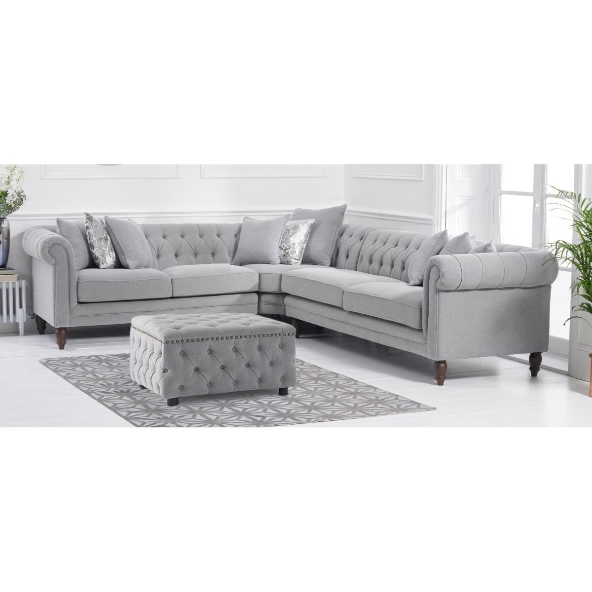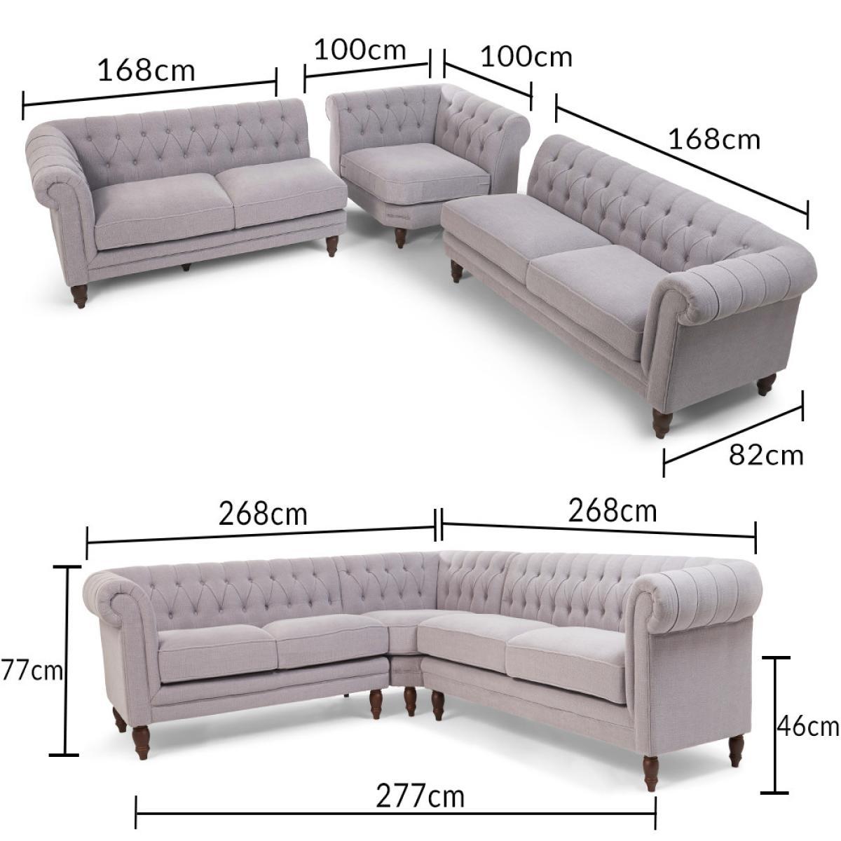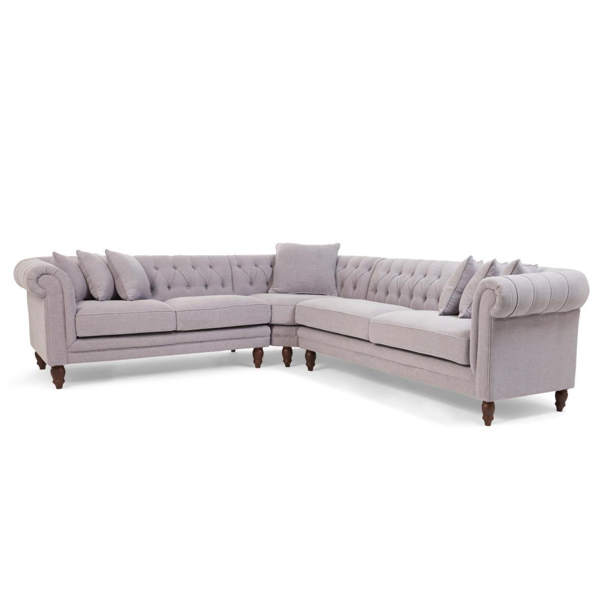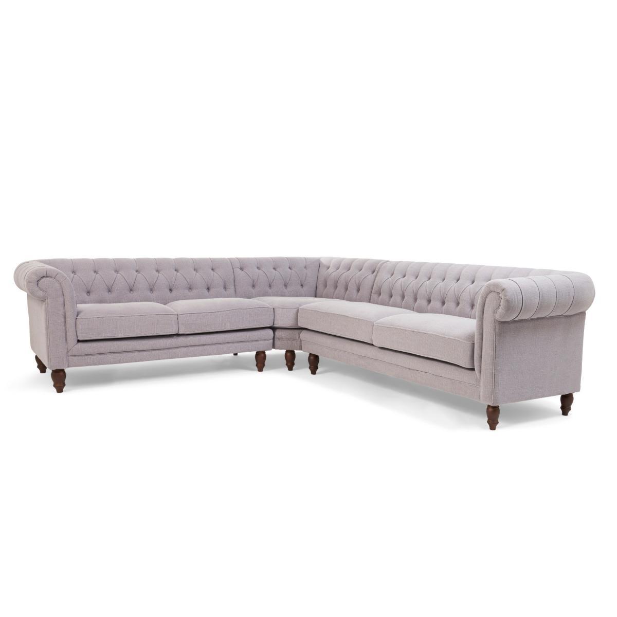 The Limoges Medium Grey Linen Corner Sofa features a classic design to complement any home. With smooth linen in a suit-all grey shade, the corner sofa features deep buttoning on the backrest and elegant scrolled armrests and is complete with ornate dark wood feet. Stylish linen sofa makes an impression. Cosy and comfortable with classic Chesterfield features. Smooth grey linen flatters every interior Deep buttoning and scrolled armrests. Space-saving corner design. Complete with ornate dark wood feet