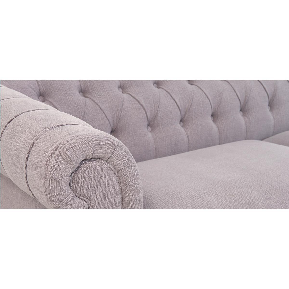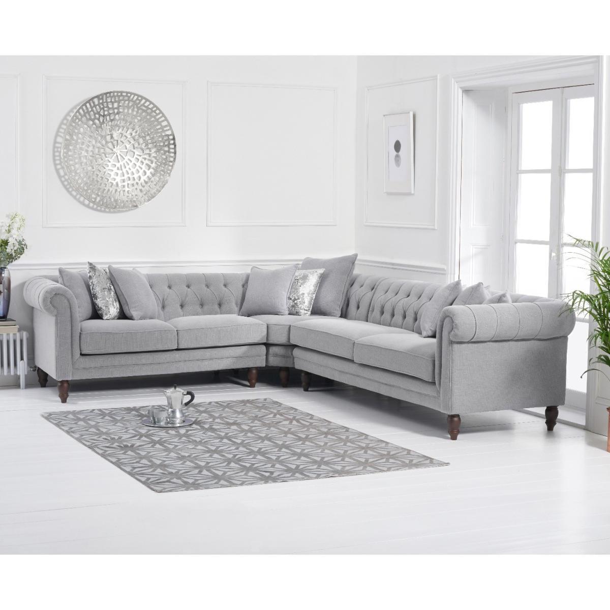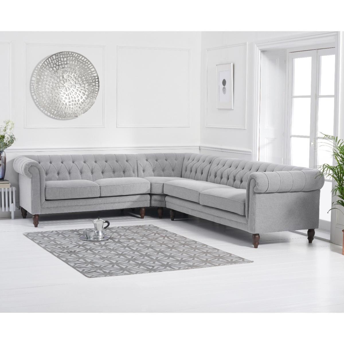 The Limoges Medium Grey Linen Corner Sofa features a classic design to complement any home. With smooth linen in a suit-all grey shade, the corner sofa features deep buttoning on the backrest and elegant scrolled armrests and is complete with ornate dark wood feet. Stylish linen sofa makes an impression. Cosy and comfortable with classic Chesterfield features. Smooth grey linen flatters every interior Deep buttoning and scrolled armrests. Space-saving corner design. Complete with ornate dark wood feet