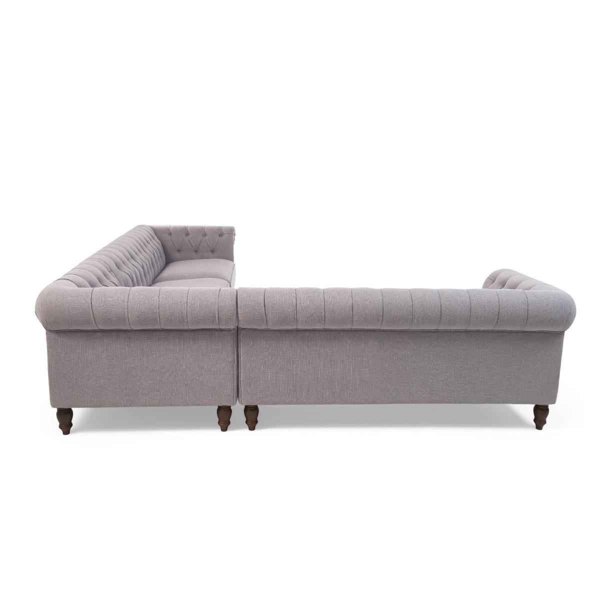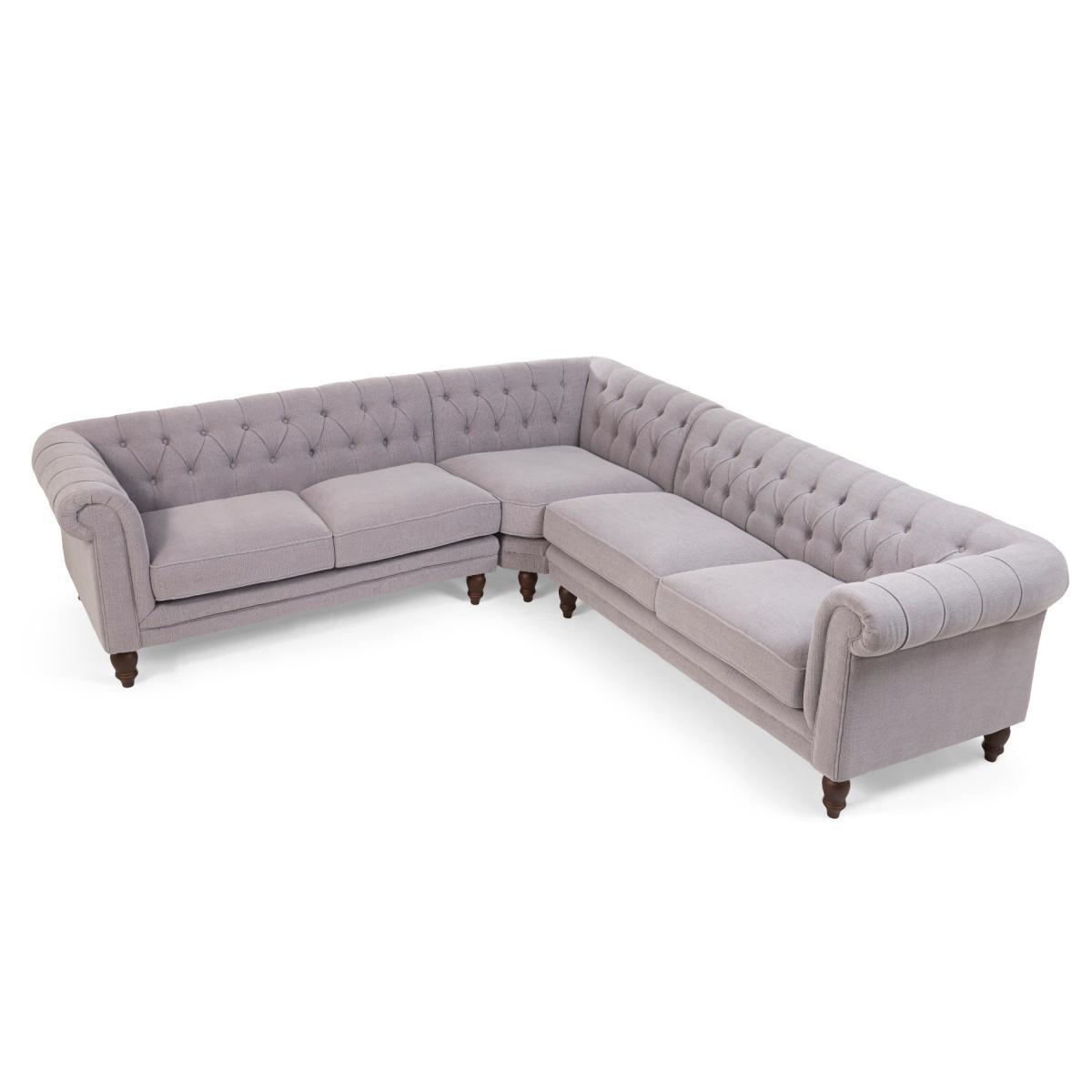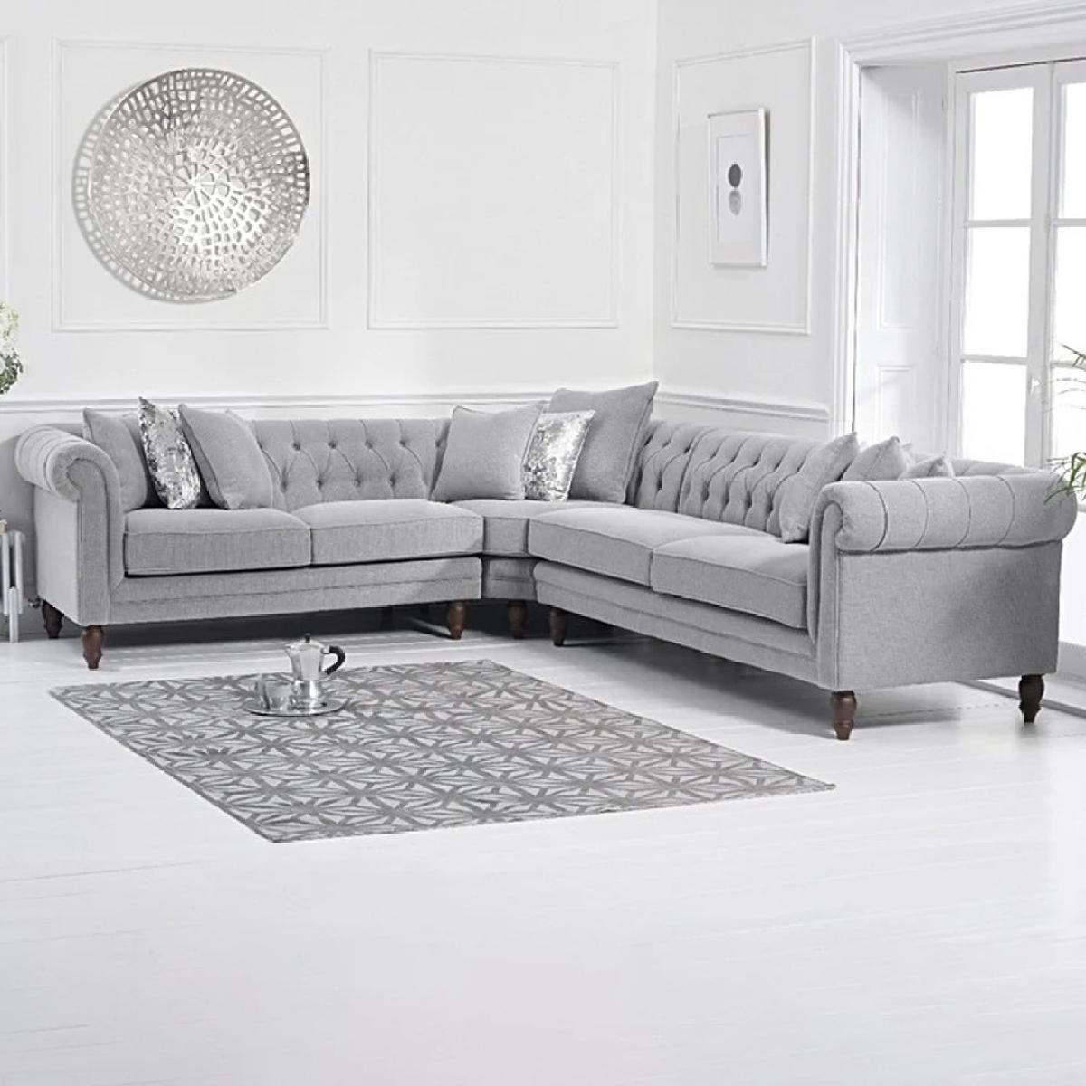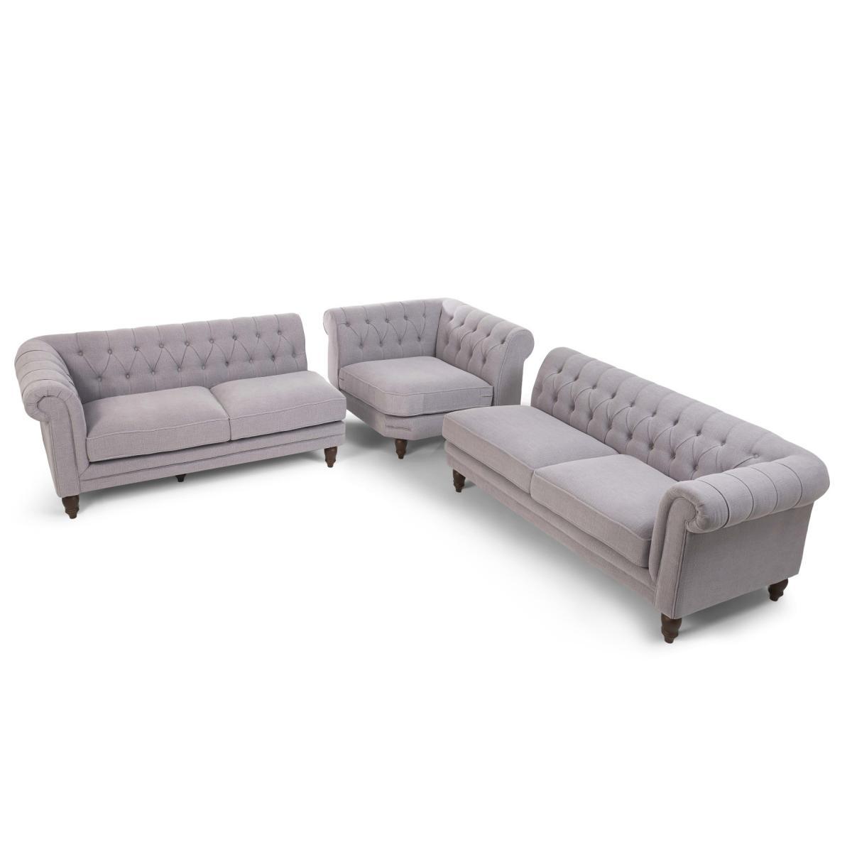 The Limoges Medium Grey Linen Corner Sofa features a classic design to complement any home. With smooth linen in a suit-all grey shade, the corner sofa features deep buttoning on the backrest and elegant scrolled armrests and is complete with ornate dark wood feet. Stylish linen sofa makes an impression. Cosy and comfortable with classic Chesterfield features. Smooth grey linen flatters every interior Deep buttoning and scrolled armrests. Space-saving corner design. Complete with ornate dark wood feet