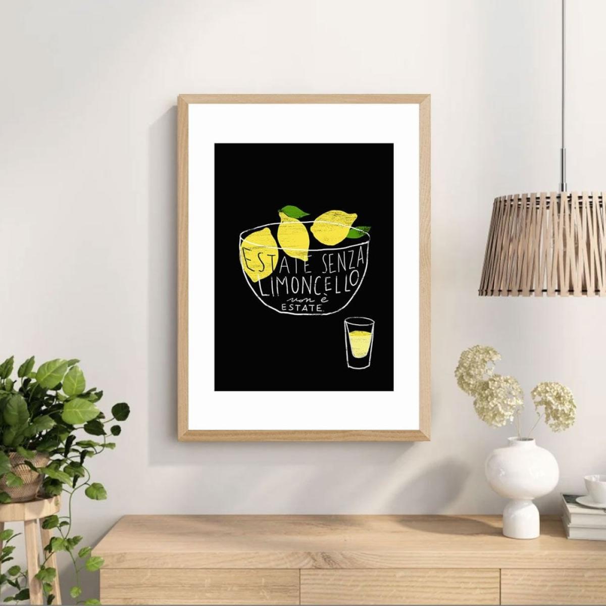 Have that perfect summertime feeling in your kitchen with the Limoncello Summer Art Print. This illustrative design in yellow and white pops on the black background. Only giclée printing processes are used for this print resulting in the highest quality museum-level colours and sharpness. Choose between a number of different coloured frames and three sizes for the perfect print for your space.