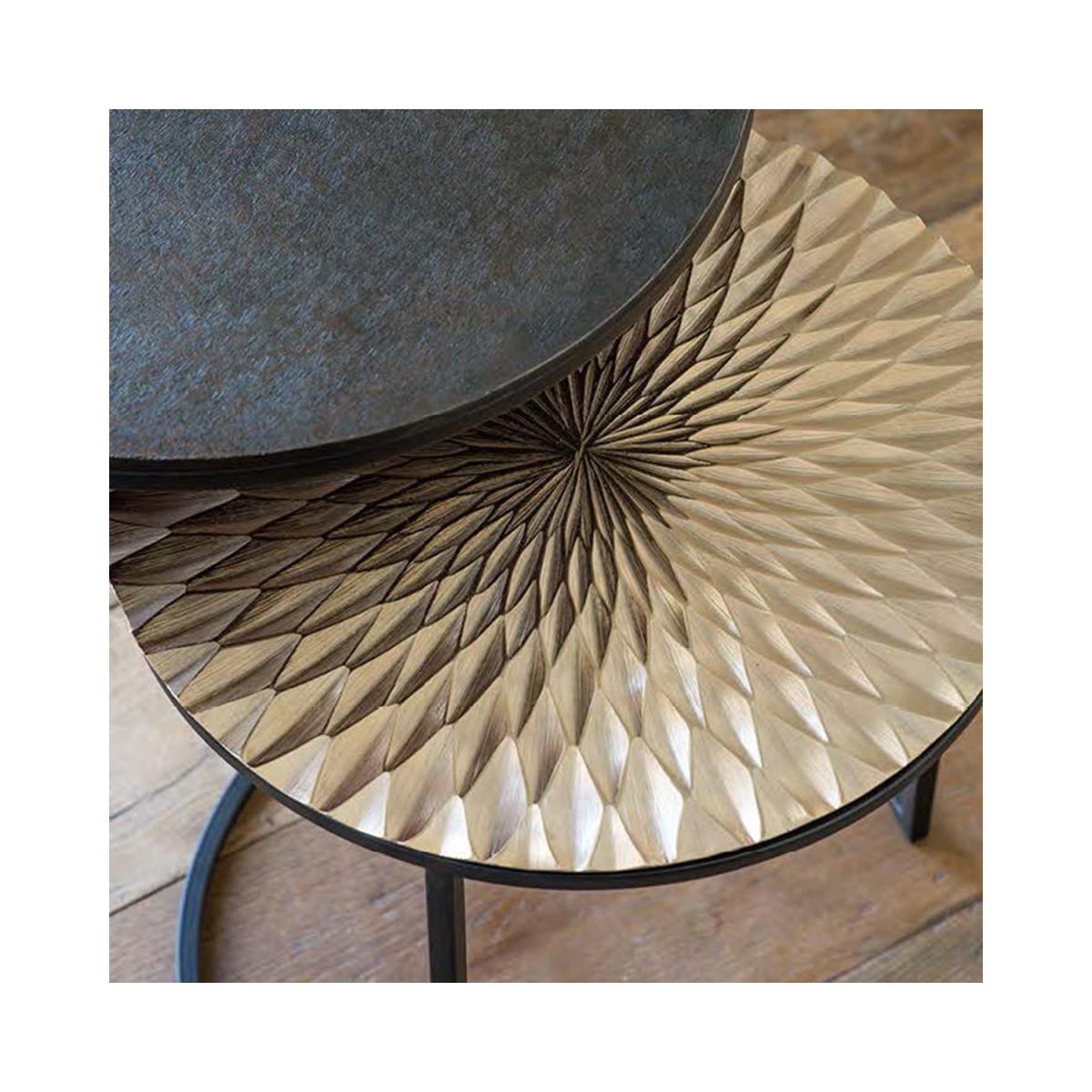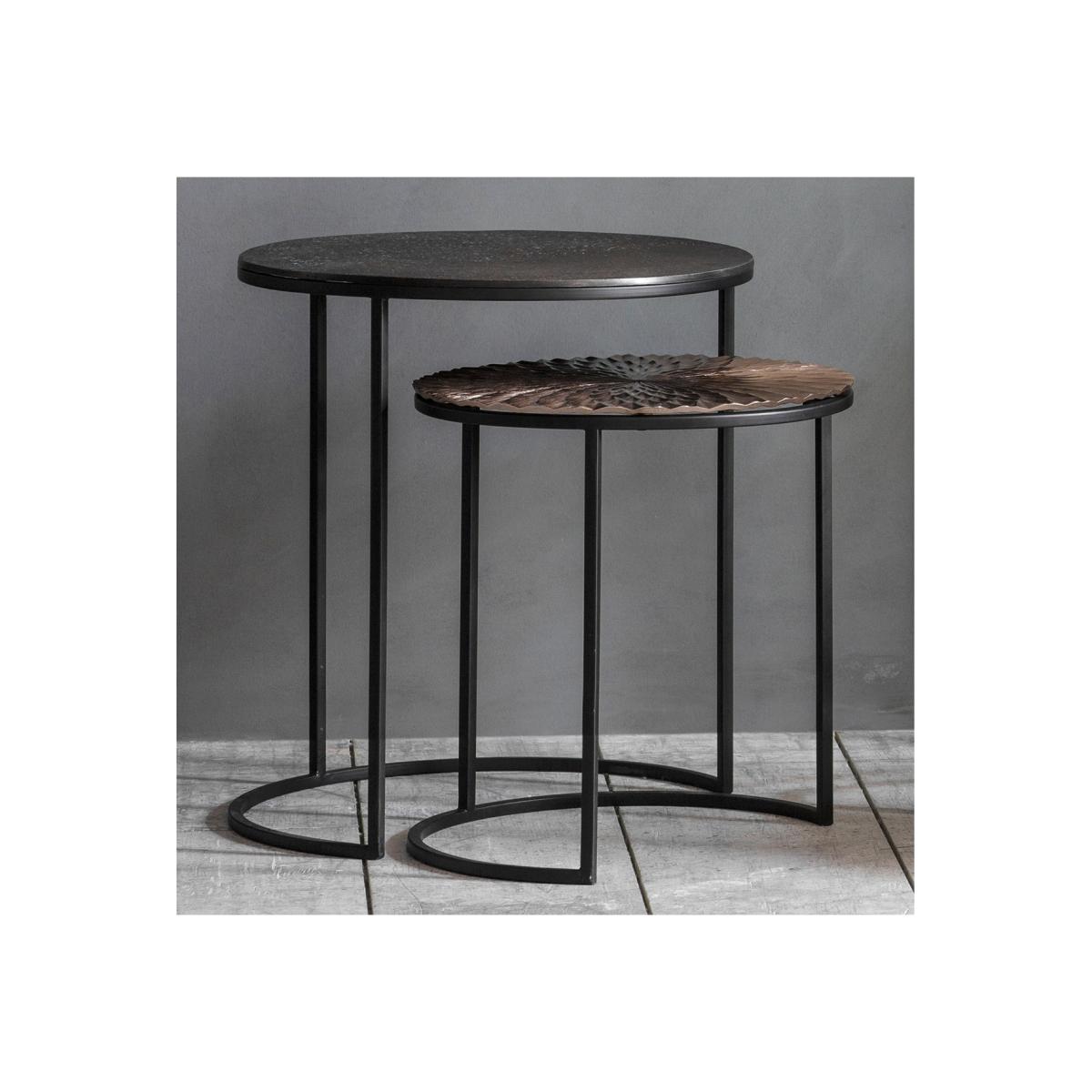 Dimensions W52 x H49 x D52 cm Functional yet stylish side tables with metal and copper finished metal tops set on a metal frame. Features. Nest of 2 tables. Stylish mixture of table top textures Metal frame. Perfect for the side of the sofa. No assembly required..