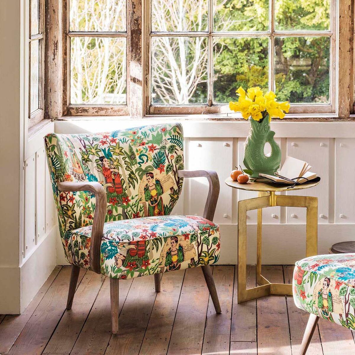 With a wide curved back and teak arms and legs, our Lina Mexicana print armchair has a distinctly mid-century feel. Upholstered in cotton with a vibrant print inspired by the Mexican artist, Frida Khalo, this is a wonderful piece of statement furniture. Exclusive to G&G. H70 x W65 x D75cm. Seat depth: 50cm | seat height: 41cm Made of mango wood and teak wood. Upholstered in cotton. Due to the handmade nature of this product, size, pattern and colour may vary. Exclusive to G&G.
