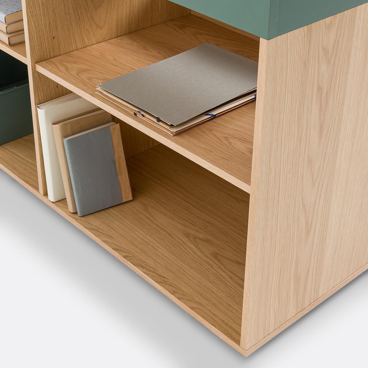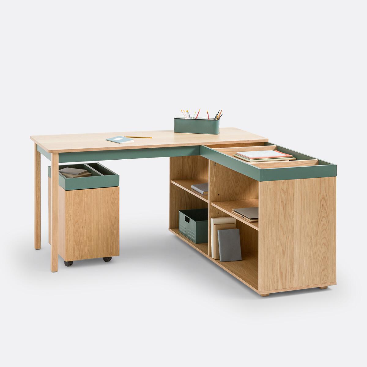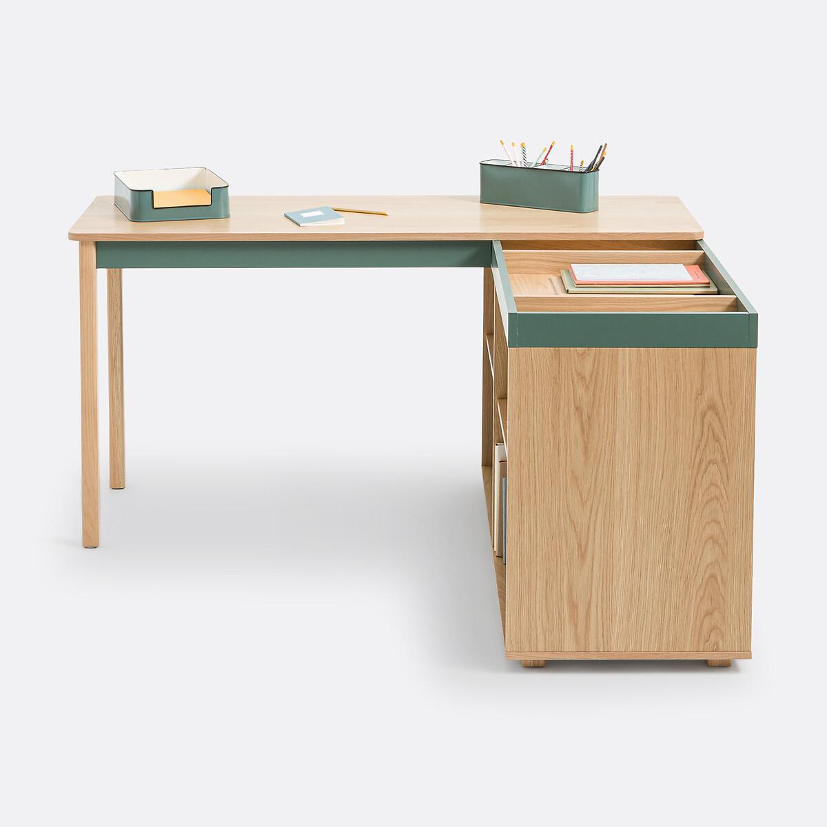The Lina polymorphic desk is part of our Les Ingénieux collection. Creations full of ideas to make life simpler and everyday life more beautiful, imagined by our designers in France.. Modular, reversible and with multiple storage options, the Lina desk combines simplicity of design and a very functional style. For a well-designed space. Why you'll love this product • Adaptable : the unit, with 4 open compartments, can be positioned on the left, right or in the extension of the work surface to adapt to your room. • An optimised office space: for a personalised layout conducive to comfort and productivity • A contemporary and versatile design: to blend into all interior styles and spaces. • Made from FSC® certified MDF and solid oak from sustainably managed forests: yes to reasoned production • A compact and portable unit on wheels (sold separately): to provide additional storage space behind a reversible door. Product Details • Reversible and modular 4-compartment unit • Storage compartments on top of the box • In oak, oak veneered MDF and lacquered MDF • Solid oak legs • FSC® certified wood • Nitrocellulose varnish finish • Matching 1-door office pedestal on casters (sold separately)DimensionsTotal. In corner position: • Width: 150cm • Height: 76cm • Depth: 140cm • Weight: 65kg. In aligned position: • Length: 240.3cm • Height: 76cm • Depth: 47cm. Usable dimensions • Upper compartments:L66.3 x H27.5 x D47cm • Lower compartments: L66.3 x H33.6 x D47cm • Tray height : 76cmDelivery:. This product is sold ready to assemble..Note! Please check that all access points are large enough to accommodate your delivery (doors, stairs, lifts). • WOOD FROM SUSTAINABLY MANAGED FORESTS. FSC® certified wood comes from forests that are environmentally, socially and economically well managed. Dimensions and weight of parcel2 parcels • L147.5 x H19 x D60cm. 38kg • L160 x H17 x D65cm. 37kg