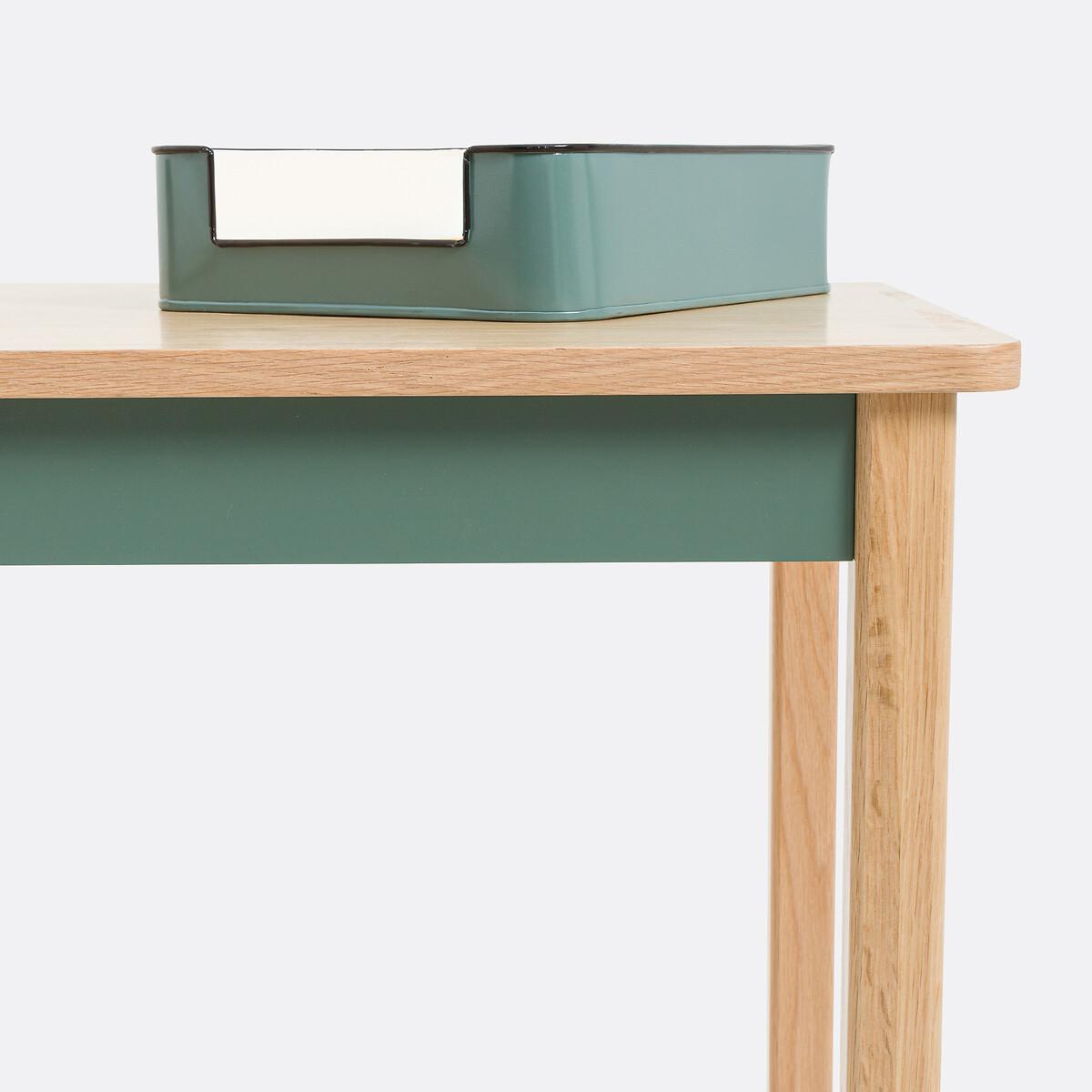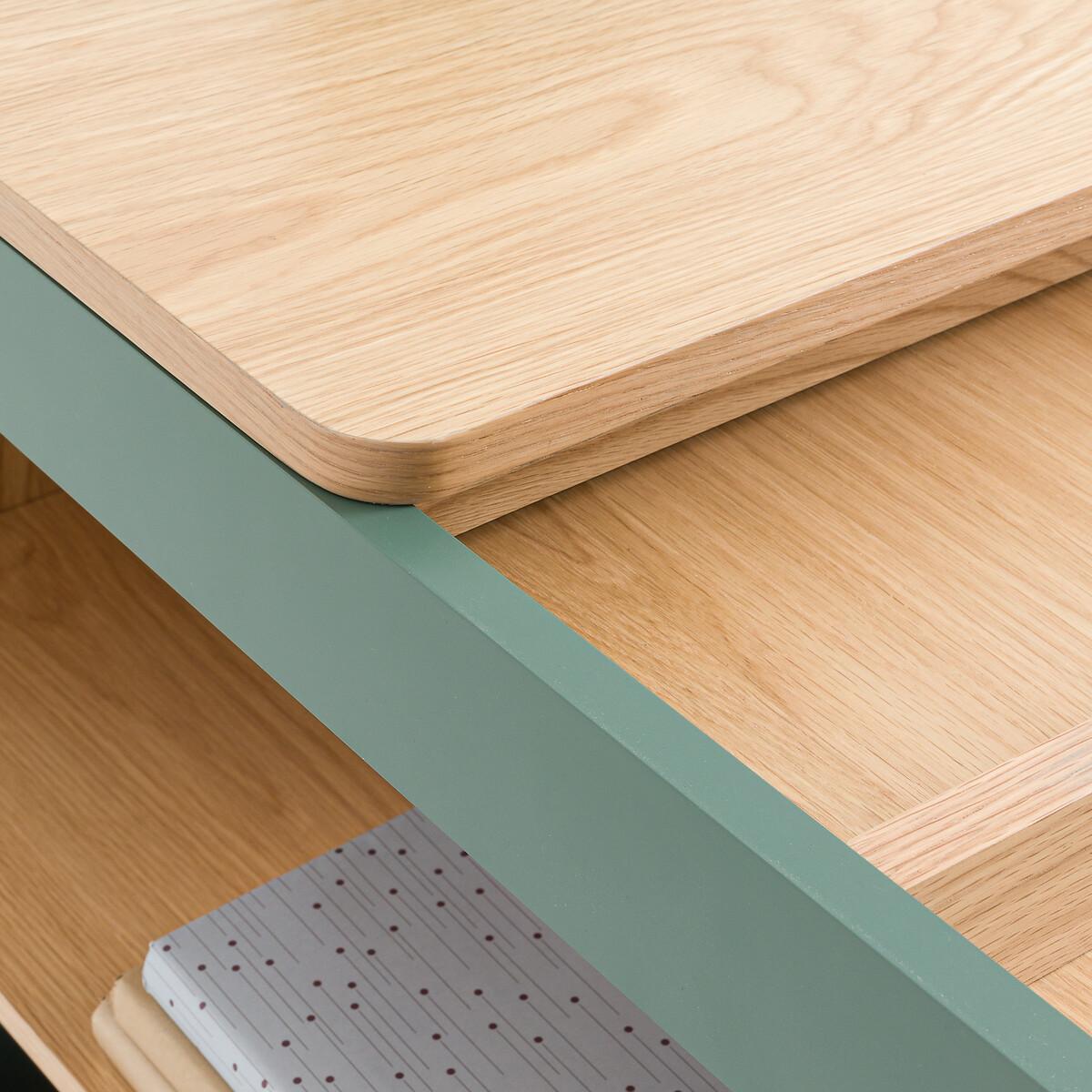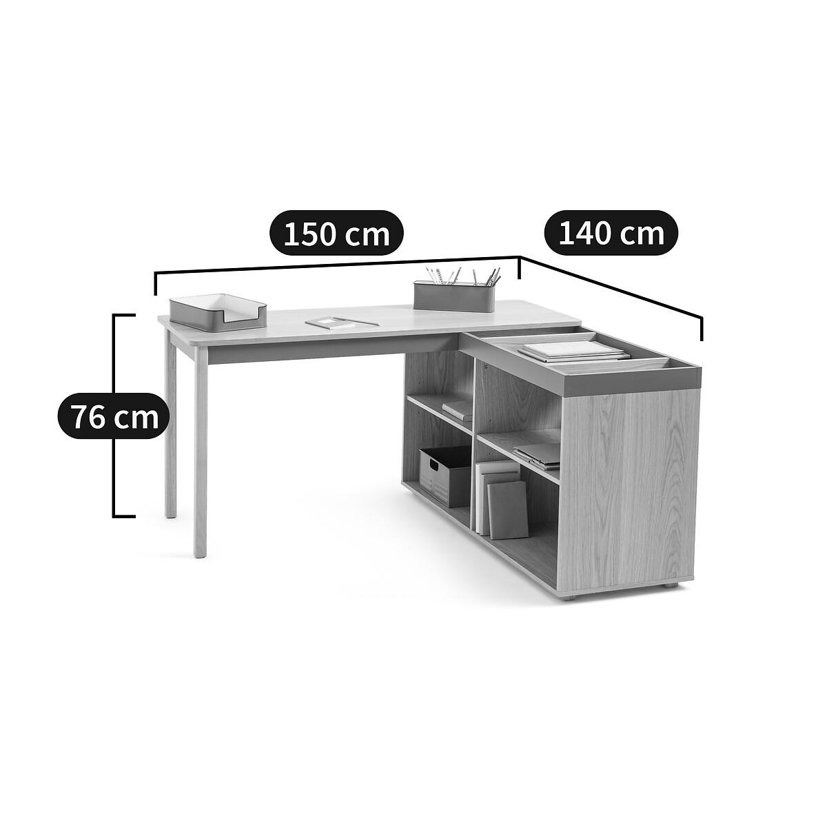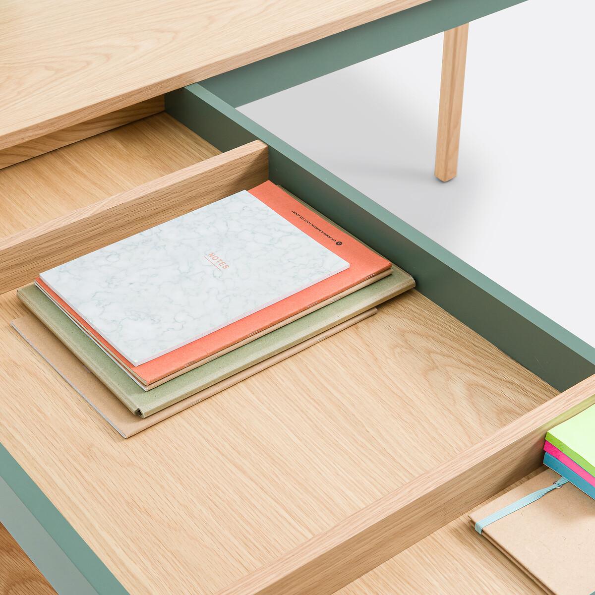 The Lina polymorphic desk is part of our Les Ingénieux collection. Creations full of ideas to make life simpler and everyday life more beautiful, imagined by our designers in France.. Modular, reversible and with multiple storage options, the Lina desk combines simplicity of design and a very functional style. For a well-designed space. Why you'll love this product • Adaptable : the unit, with 4 open compartments, can be positioned on the left, right or in the extension of the work surface to adapt to your room. • An optimised office space: for a personalised layout conducive to comfort and productivity • A contemporary and versatile design: to blend into all interior styles and spaces. • Made from FSC® certified MDF and solid oak from sustainably managed forests: yes to reasoned production • A compact and portable unit on wheels (sold separately): to provide additional storage space behind a reversible door. Product Details • Reversible and modular 4-compartment unit • Storage compartments on top of the box • In oak, oak veneered MDF and lacquered MDF • Solid oak legs • FSC® certified wood • Nitrocellulose varnish finish • Matching 1-door office pedestal on casters (sold separately)DimensionsTotal. In corner position: • Width: 150cm • Height: 76cm • Depth: 140cm • Weight: 65kg. In aligned position: • Length: 240.3cm • Height: 76cm • Depth: 47cm. Usable dimensions • Upper compartments:L66.3 x H27.5 x D47cm • Lower compartments: L66.3 x H33.6 x D47cm • Tray height : 76cmDelivery:. This product is sold ready to assemble..Note! Please check that all access points are large enough to accommodate your delivery (doors, stairs, lifts). • WOOD FROM SUSTAINABLY MANAGED FORESTS. FSC® certified wood comes from forests that are environmentally, socially and economically well managed. Dimensions and weight of parcel2 parcels • L147.5 x H19 x D60cm. 38kg • L160 x H17 x D65cm. 37kg
