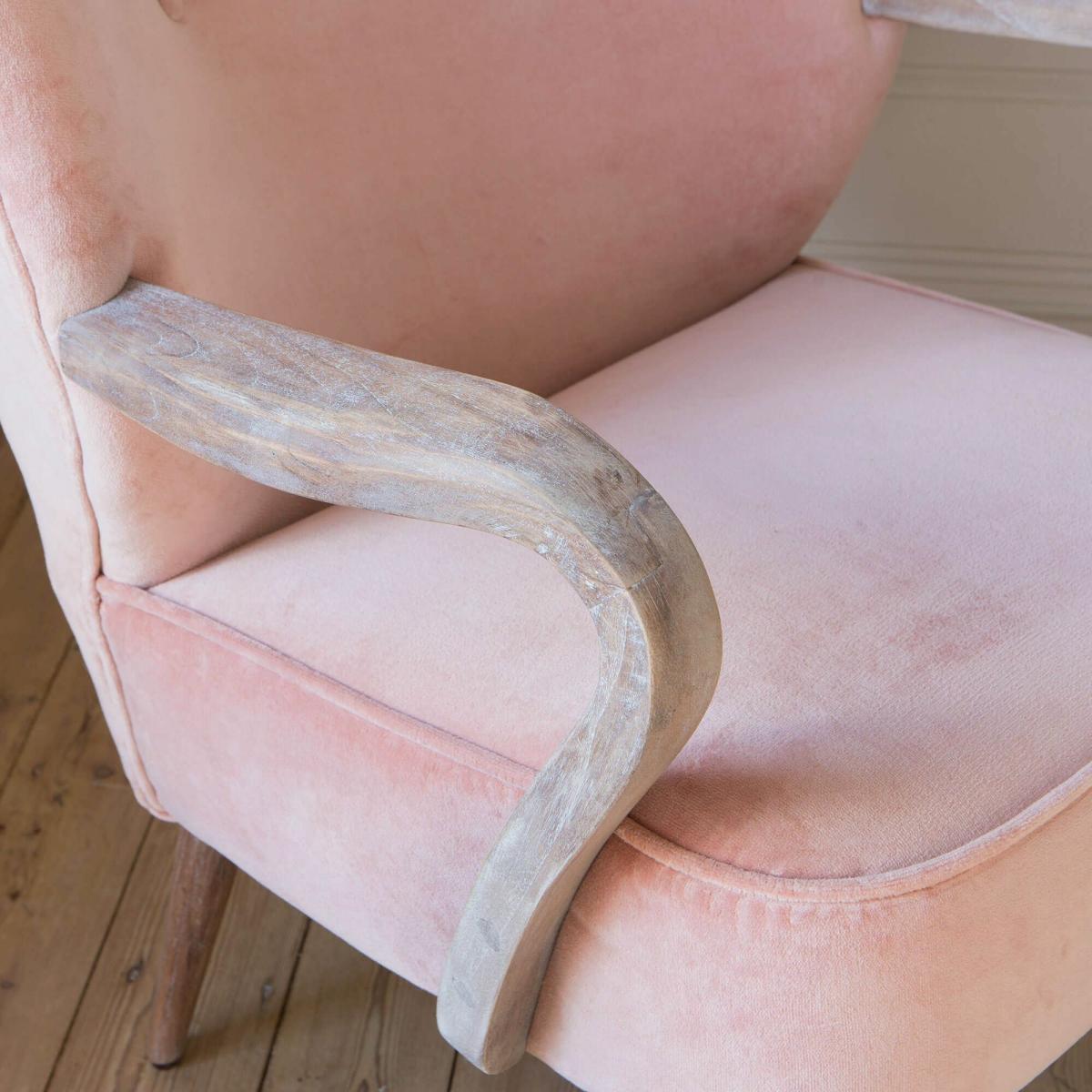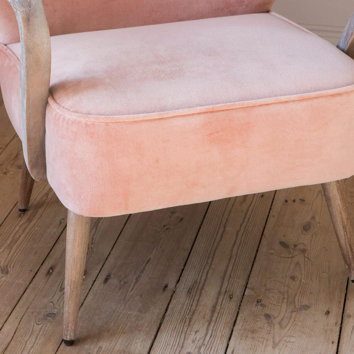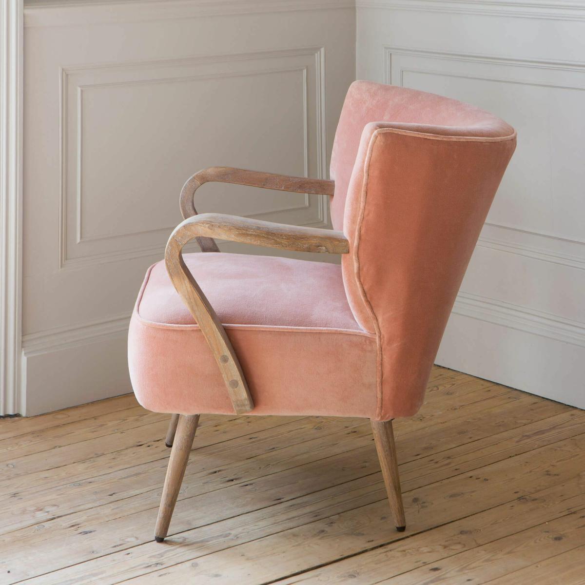 Our Lina Rose Velvet Armchair is a feminine masterpiece perfect for your bedroom or dressing room. Tapered blonde wooden legs and sculpted arms give this cocktail chair a distinctive mid-century feel, whilst the luxe rose velvet oozes modern style.