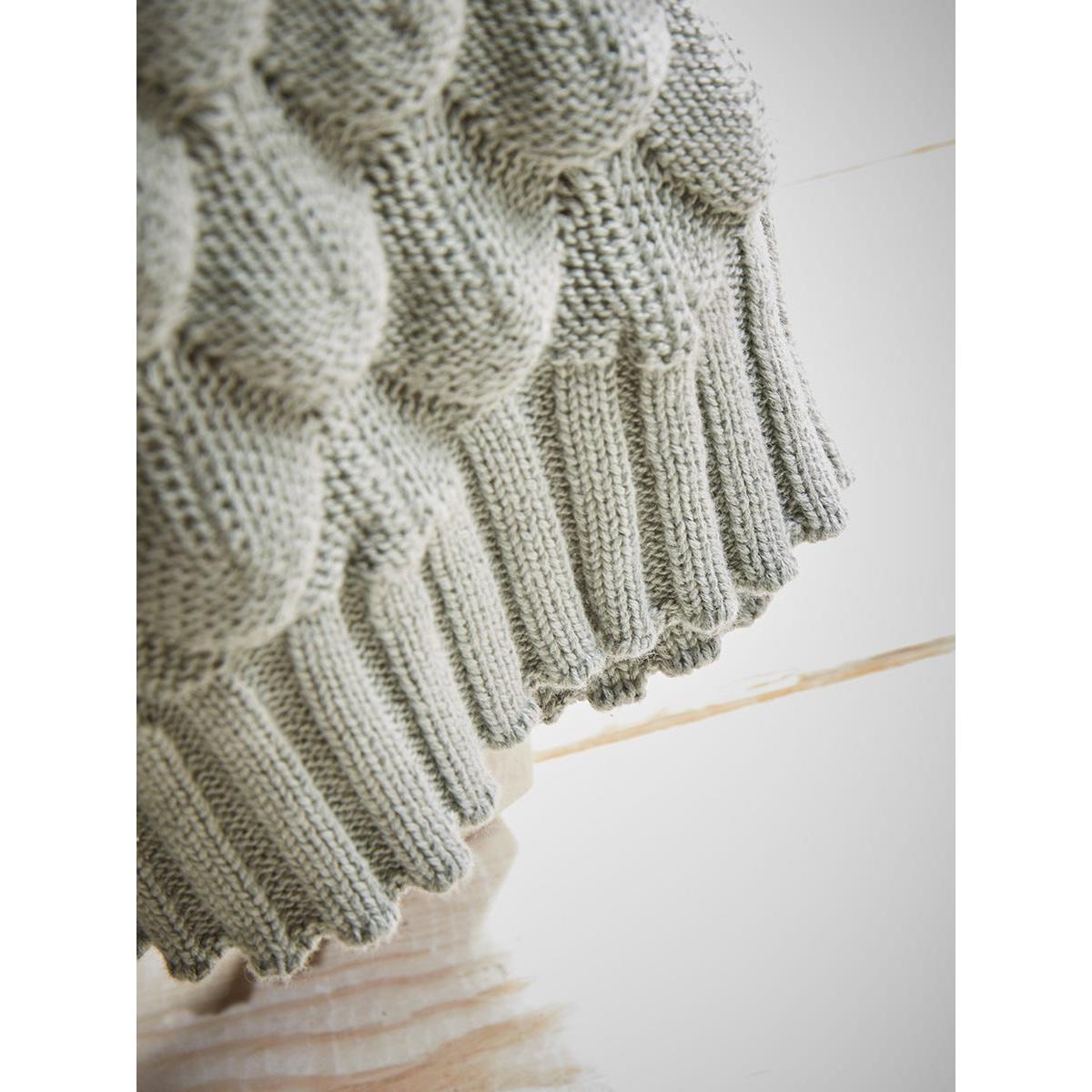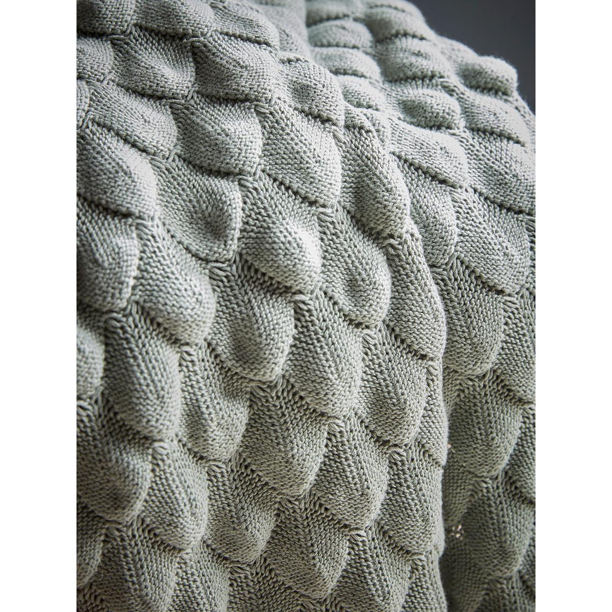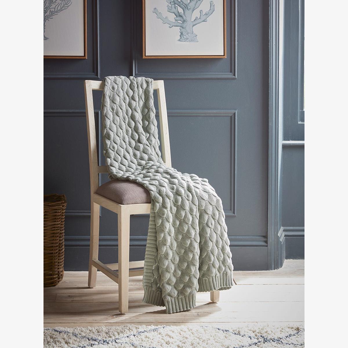 Cosy up in our Lina Throw. This grey knitted blanket with a bubble effect pattern adds a feeling of calm and serenity to your space.  Contrasting the circular texture, lines finish the edges of this blanket, giving it a plethora of textural detailing and adding personality to an armchair or the end of your bed.