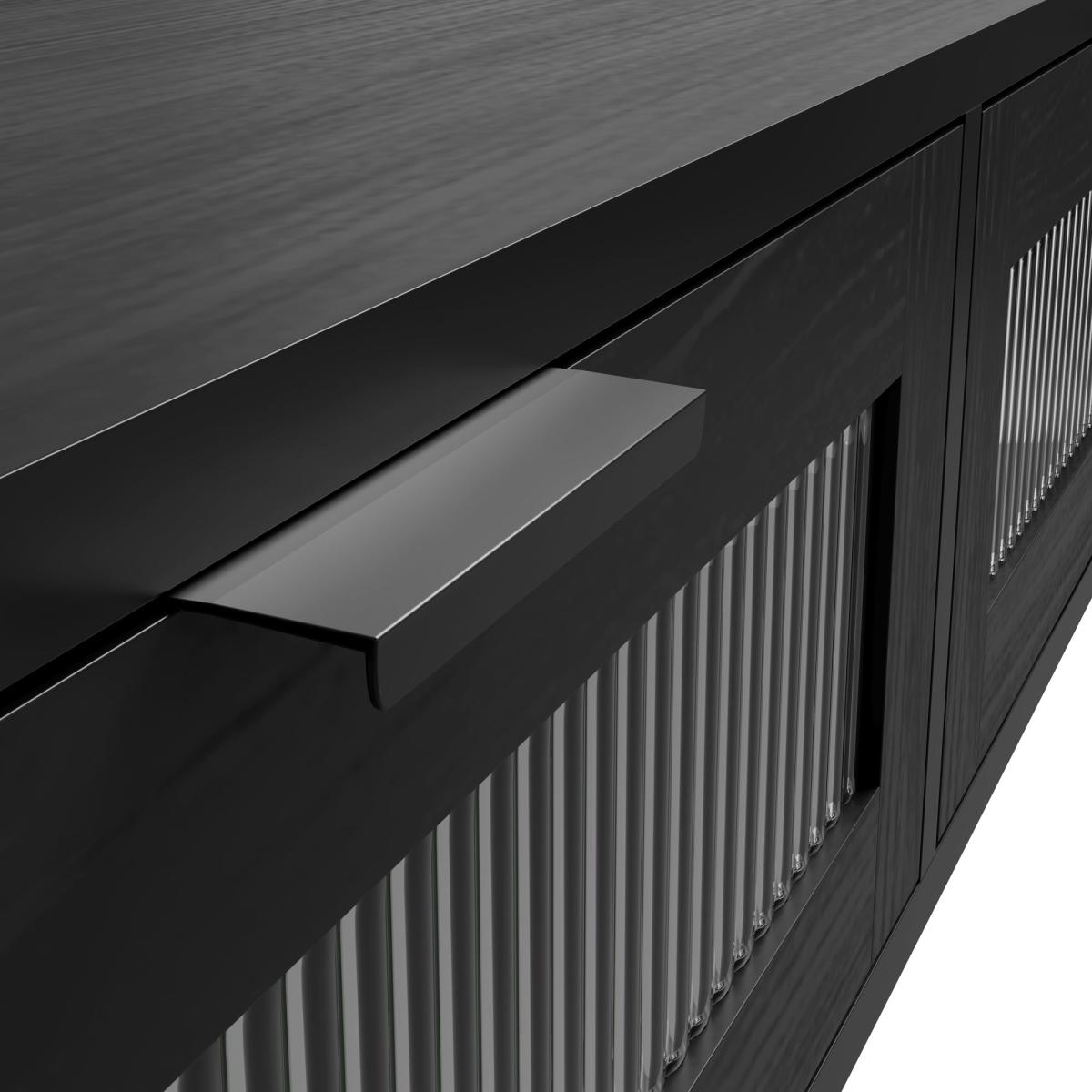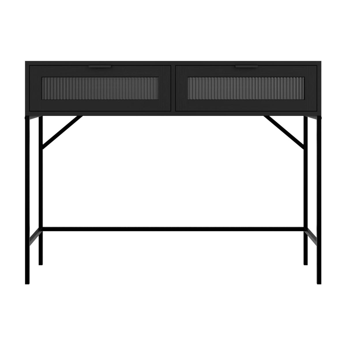 * Matt finish* Reeded glass* 2 Drawers Featuring a matt black finish and clear reeded glass panels, this console table exudes contemporary charm and sophistication. Its neutral color palette ensures it blends seamlessly into any design scheme, making it perfect for use in the hallway, living room, or bedroom. With two drawers for storage, it offers both style and practicality for your home.