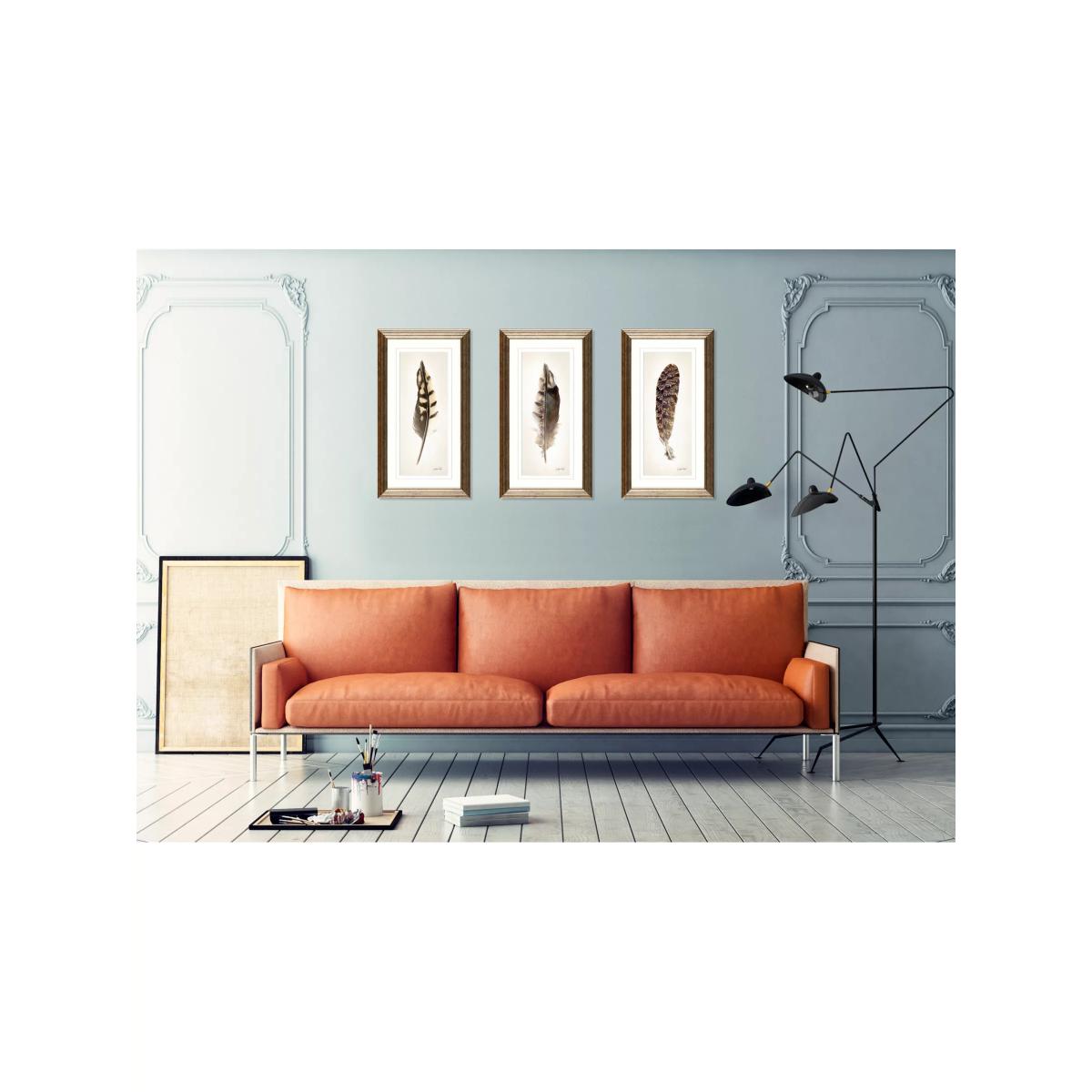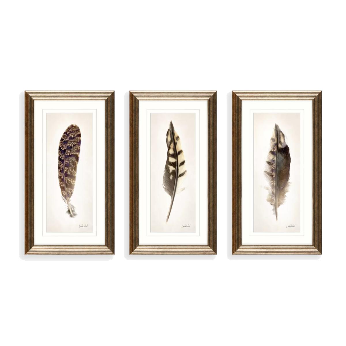 A trio of still life prints of feathers. These three mounted prints have MDF frames in a champagne finish and are ready to wall mount. Have you thought about wall hooks and fittings?