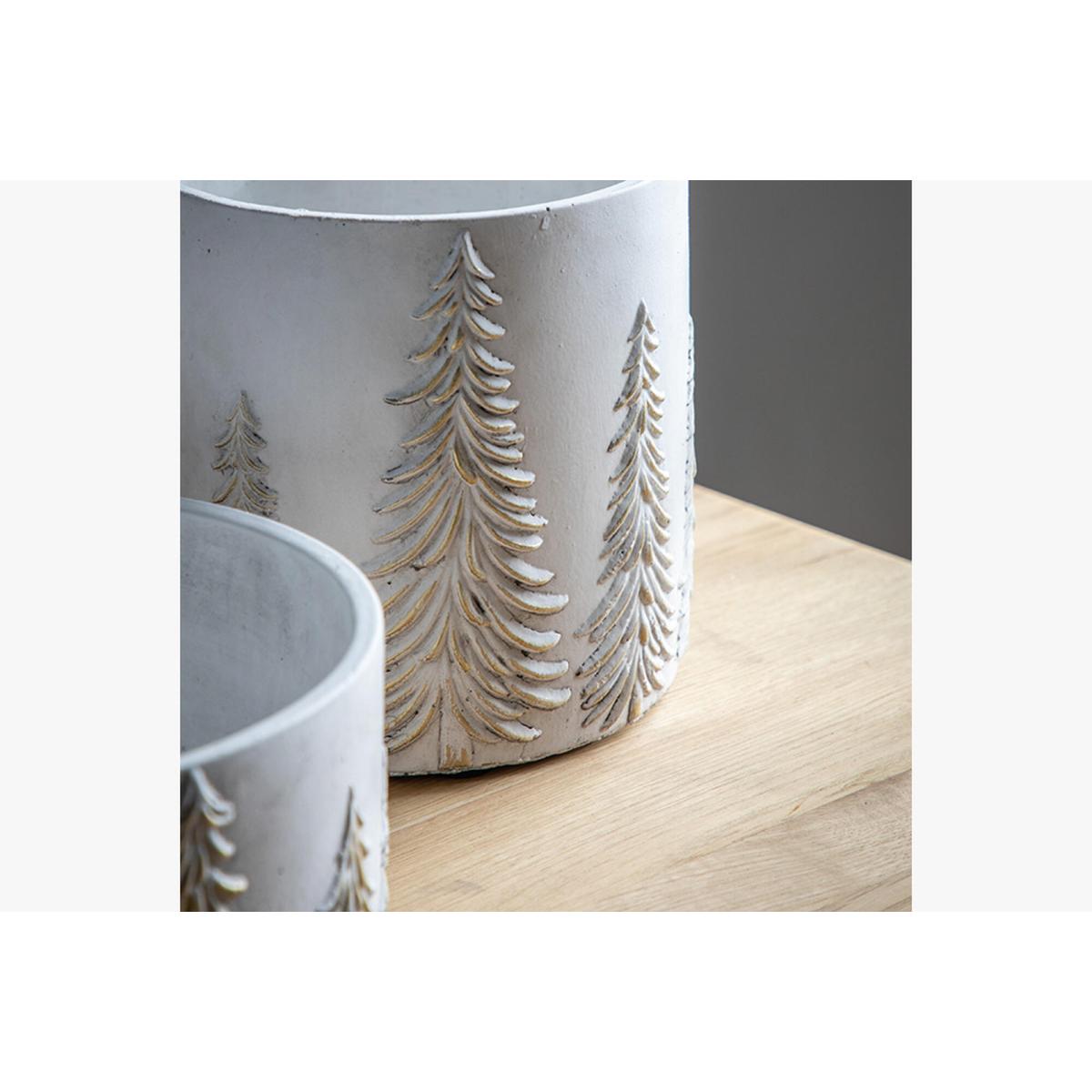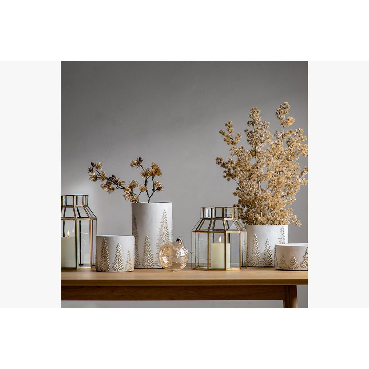 The perfect place for your festive florals. On snowy rustic white terracotta backdrop each tree is picked out in glimmering gold, highlighting the stunning detail and adding a little shine. Perfect for a festive floral displays or faux plants.