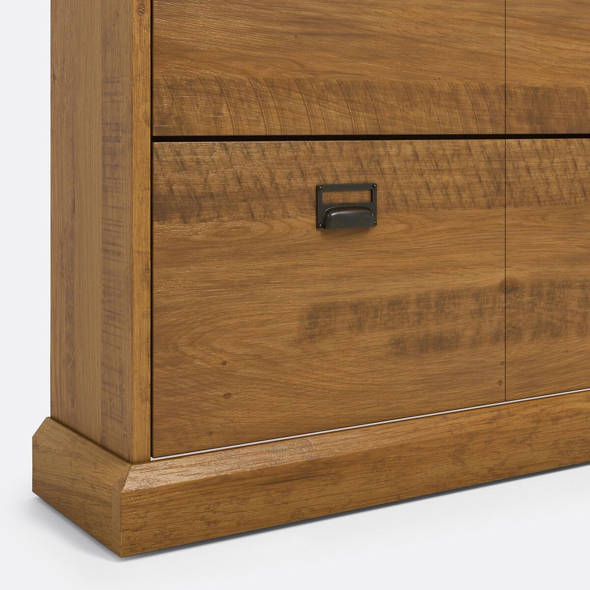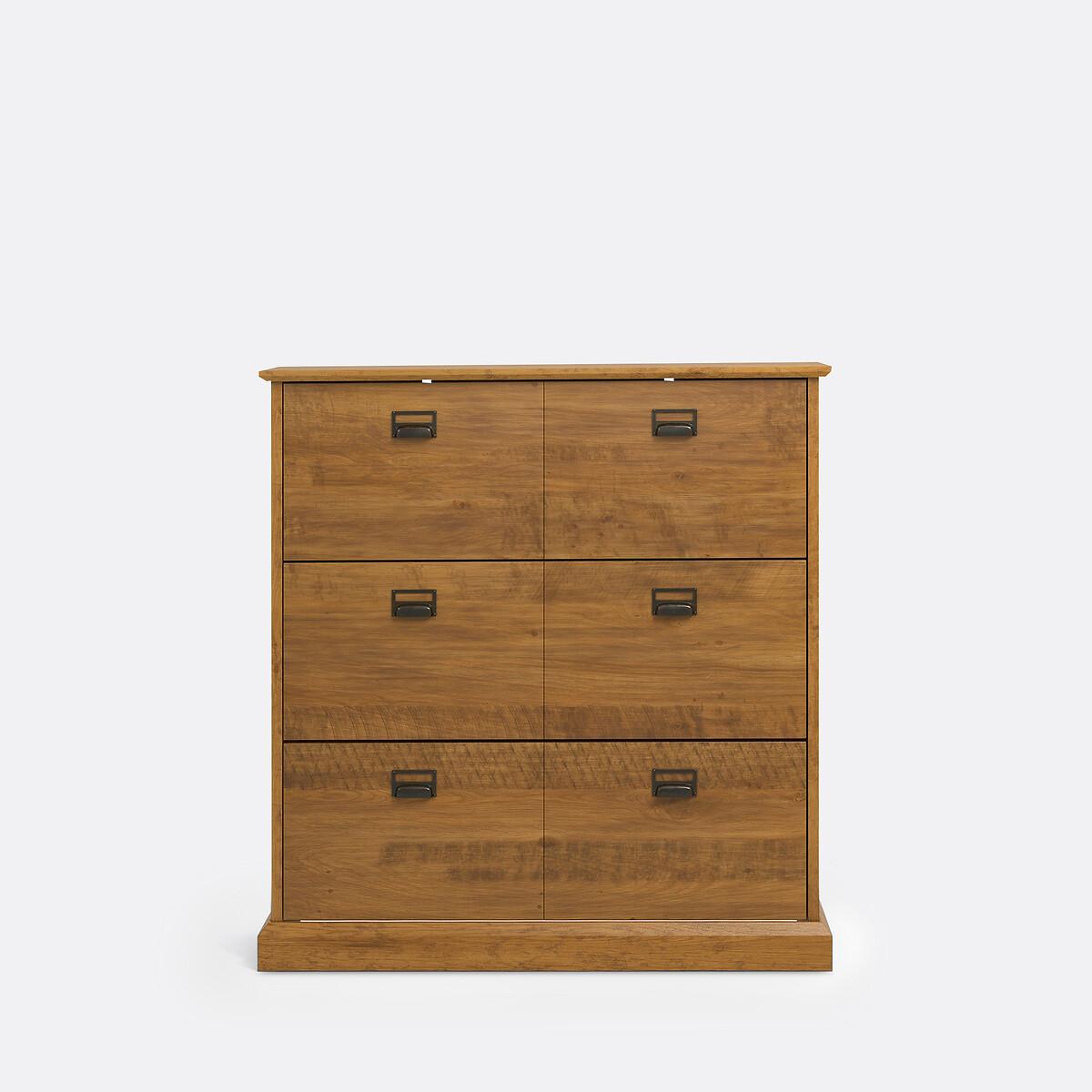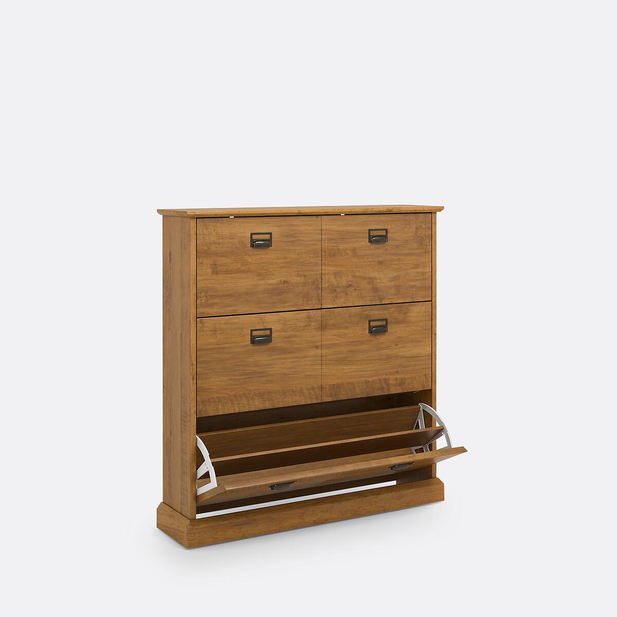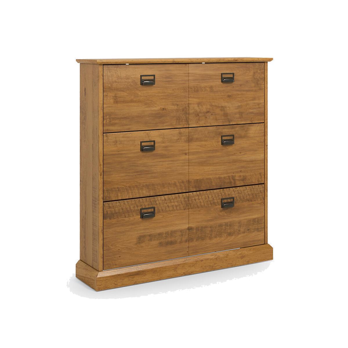 Lindley shoe cabinet. Small and compact, yet lots of room for storage. 3 pull-down doors to store all the family's shoes. Product Details • 3 pull-down doors • Holds 30 pairs of shoes • Solid aged oak-stained pine. • Nitrocellulose varnish finish. • Capacity: 30 pairs of shoes (size 5/38, without heel)Dimensions • Width: 100cm • Height: 105cm • Depth: 25cm. Home Delivery. Your Lindley shoe cupboard with 3 pull-down doors is self-assembly. It will be delivered to your door!Note! Please check that all access points are large enough to accommodate your delivery (doors, stairs, lifts).Parcel Dimensions1 parcel • L132 x H20.1 x D41.7 cm • 31kg