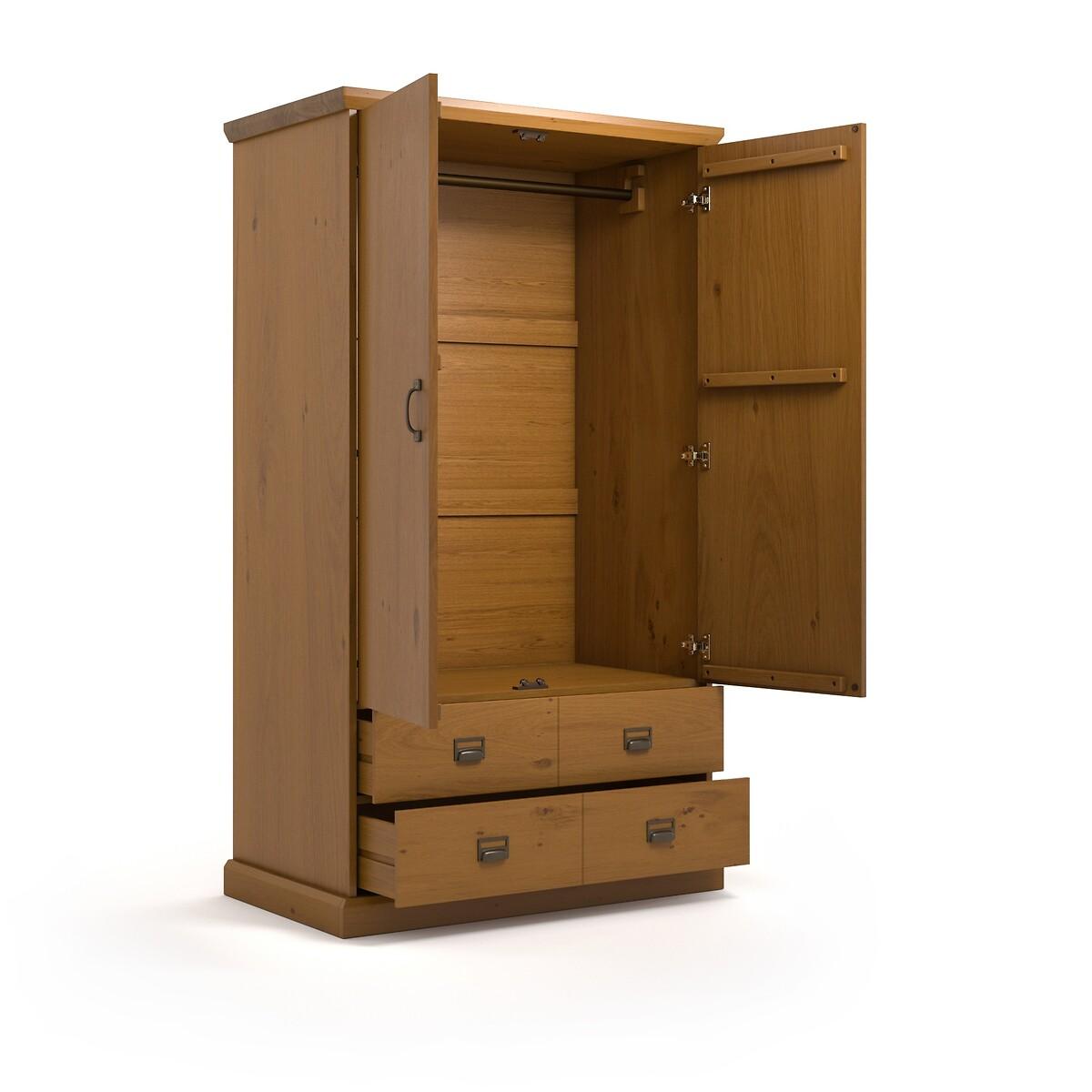 This 2-door wardrobe takes on traditional and modern with its trompe-l'oeil drawer fronts: 4 fronts for 2 large drawers, equipped with an XXL wardrobe, it offers plenty of storage space. Product Details • 2 doors with XXL wardrobe + 2 drawers • Solid pine with nitrocellulose varnish finish • Black metal handles with aged effect epoxy finish. See the matching chests of drawers and other items from the Lindley collection online. Quality • The Lindley wardrobe with 2 doors and 2 drawers represents Quality and Value in terms of its construction and beautiful finish. Dimensions • Width: 104cm • Height: 180cm • Depth: 57cm • Drawer:L90.4 x D45 x H12cm • Hanging space : L96 x D53 x H126cmDelivery:. This product is sold for self-assembly. It will be delivered to your door!Note! Please check that all access points are large enough to accommodate your delivery (doors, stairs, lifts).Dimensions and weight of parcel2 parcels • L188.9 x H13 x D63cm. 33kg • L115.4 x H15 x D66.1cm. 34kg