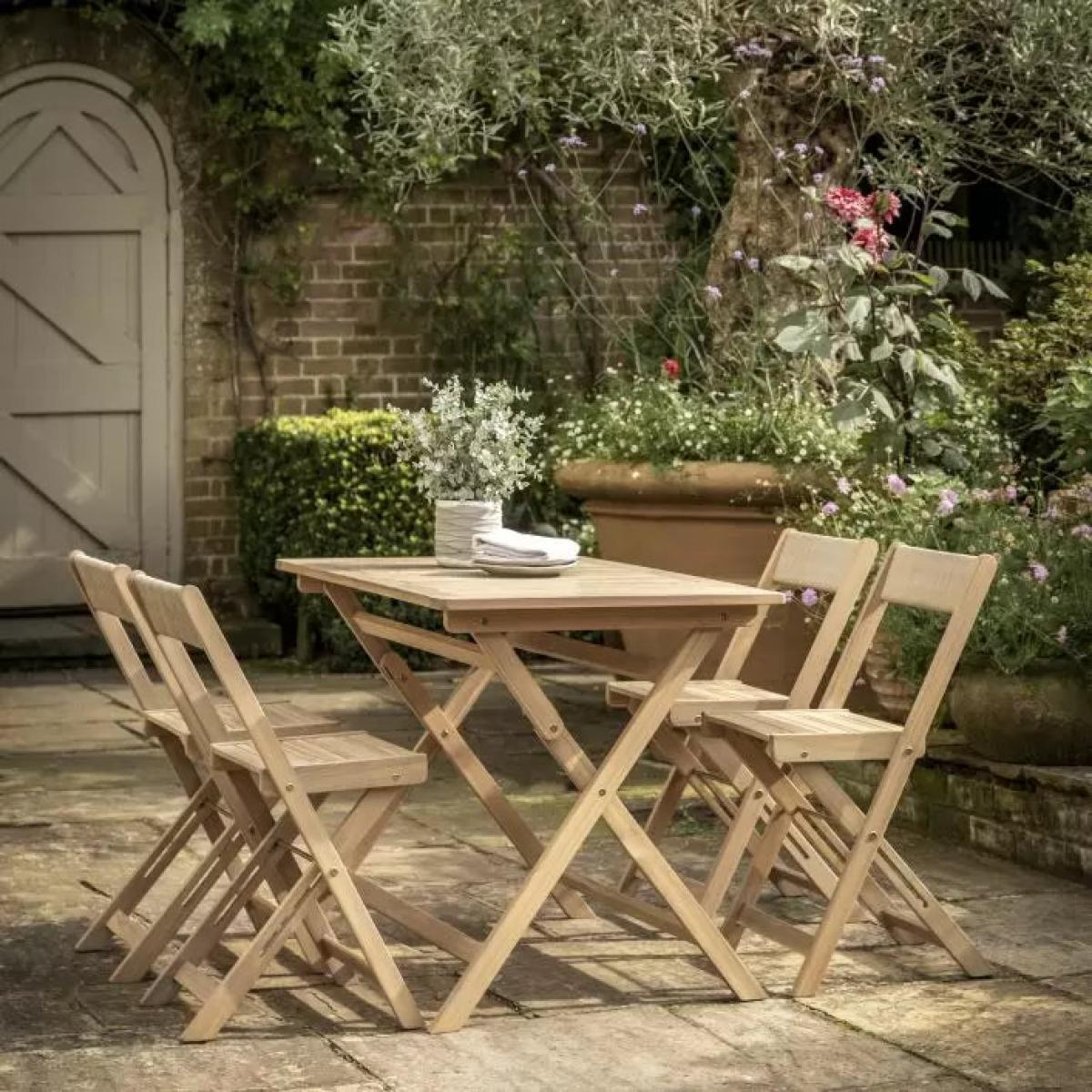 Combining practicality and style this dining set folds away for easy storage or transportation. This elegantly simple set is made with Acacia wood and comes complete with the folding slatted top dining table and folding 4 chairs. Additional coordinating chairs are available separately.