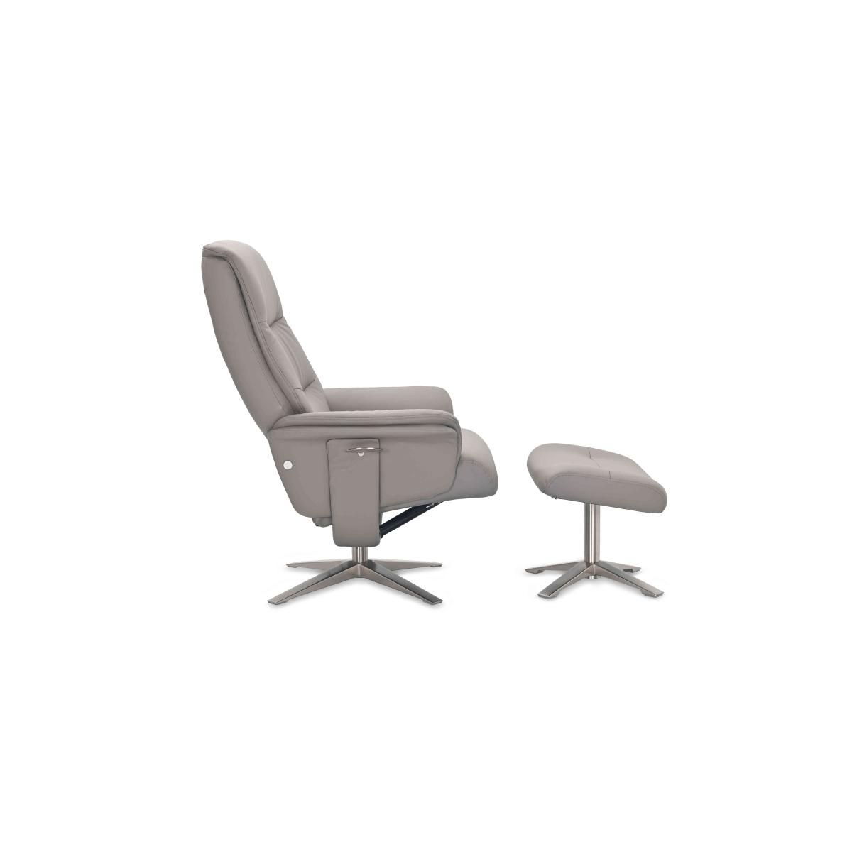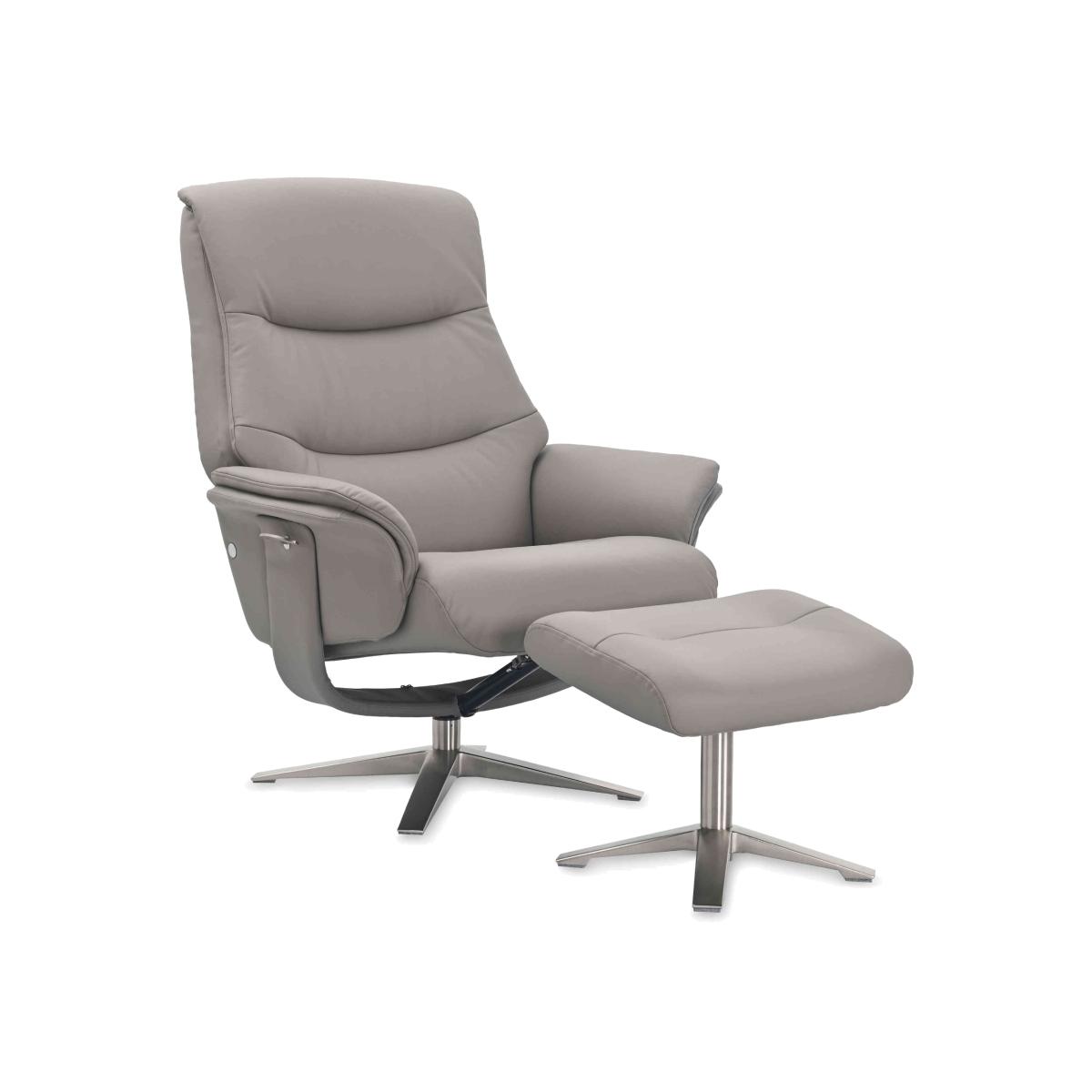 Beautifully upholstered in 100% leather, this generously curved modern swivel recliner chair and footstool makes a style impact and is a fabulous place to relax. Why you'll love it Enjoy generously curved comfort with this modern swivel chair and footstool set. Chair has a 360-degree swivel for all-round comfort. The manual recliner mechanism has an easy-to-use lever operation. High-quality cushioning for superb support. 100% leather upholstery in a choice of colours. Chair and footstool have chrome-finished metal bases. Find this leather swivel armchair and footstool at Furniture Village. What you need to know Medium comfort level. Seat suspension: S-shape springs. Seat cushioning: foam. Seat cushion is fixed. Back suspension: foam core, fibre top. Back cushioning: foam. Back cushion is fixed. Arm cushioning: cutting. Chair arms and chair and footstool bases are removable for ease of access. Please allow time for the recliner mechanism to ease. Minor gaps are necessary to ensure ease of motion and may be exaggerated depending on floor type. Leather softens with use. Smoothing the tops of leather cushions prevents signs of visual comfort. Fixed seat and back cushions require smoothing and straightening regularly. To smooth and straighten fixed cushions, punch the back cushion’s top two corners and the seat cushion’s outer two corners, and pinch outwards. Please read our upholstery care guide for more advice.