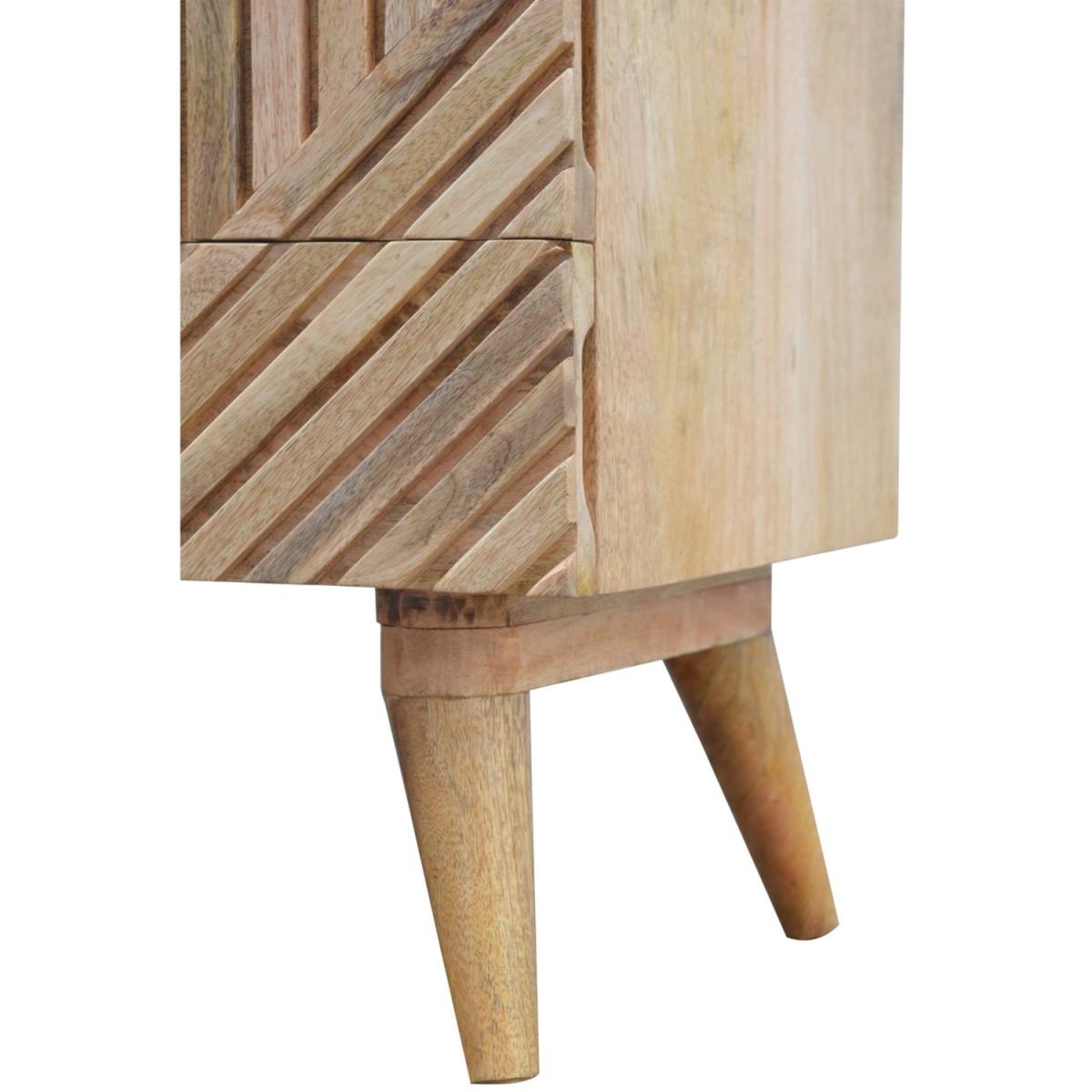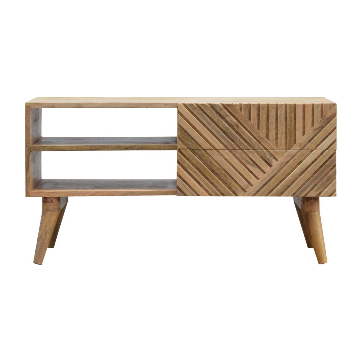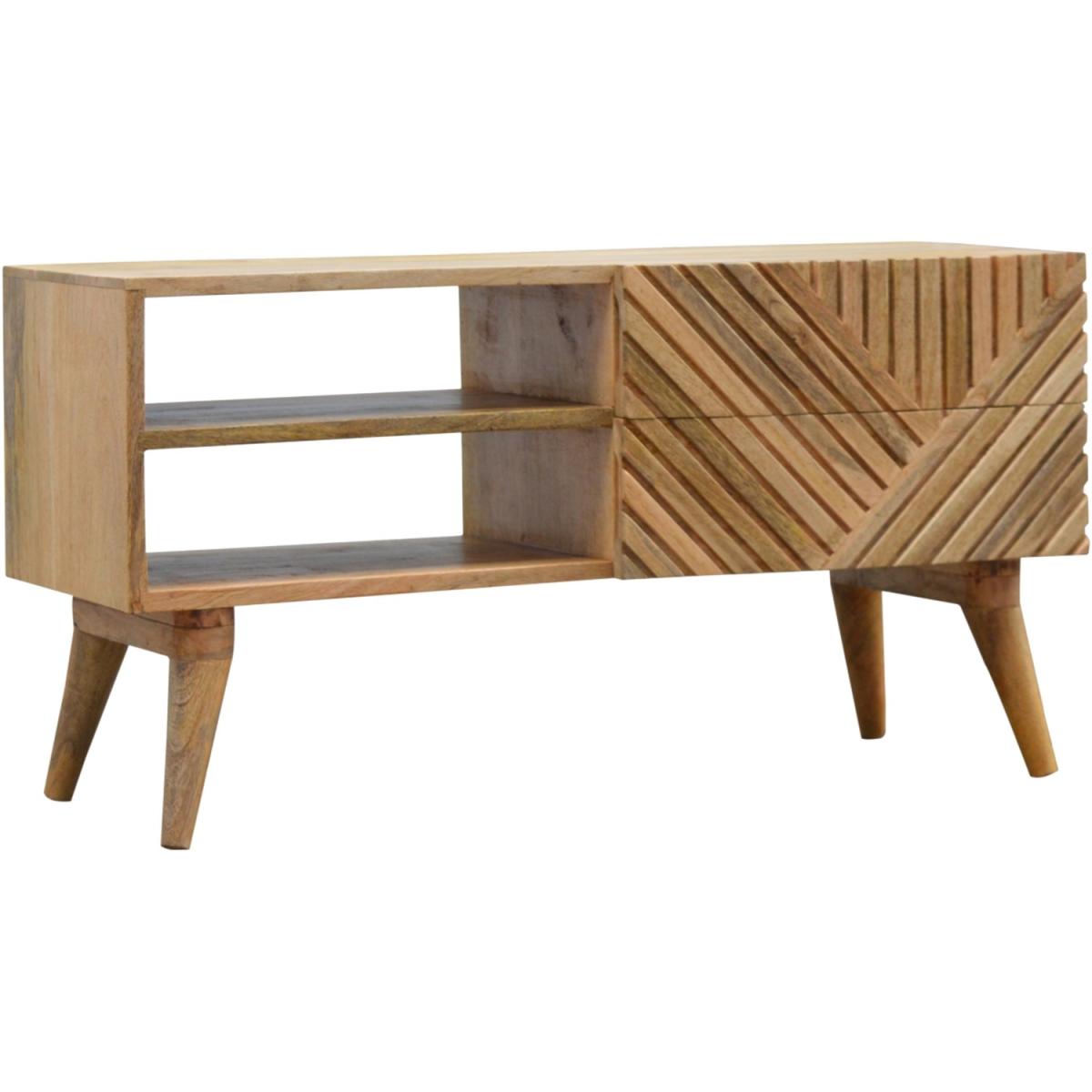 Add this unique solid wood media unit to your living room, constructed from 100% solid mango wood in an oak-ish finish, this piece features 2 open slots and a very unique carved design on the drawer fronts with a clean finish meaning easy access into the drawers without any knobs. It features 4 Nordic-style legs which complement the body nicely and gives the entire piece a contemporary look. The perfect addition to the home.