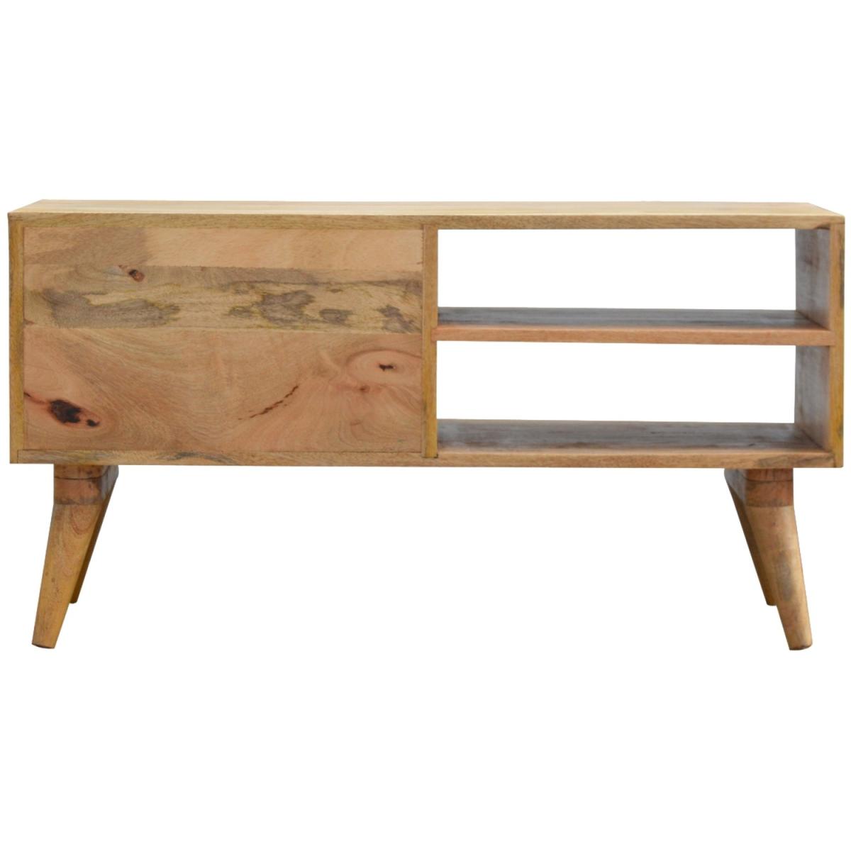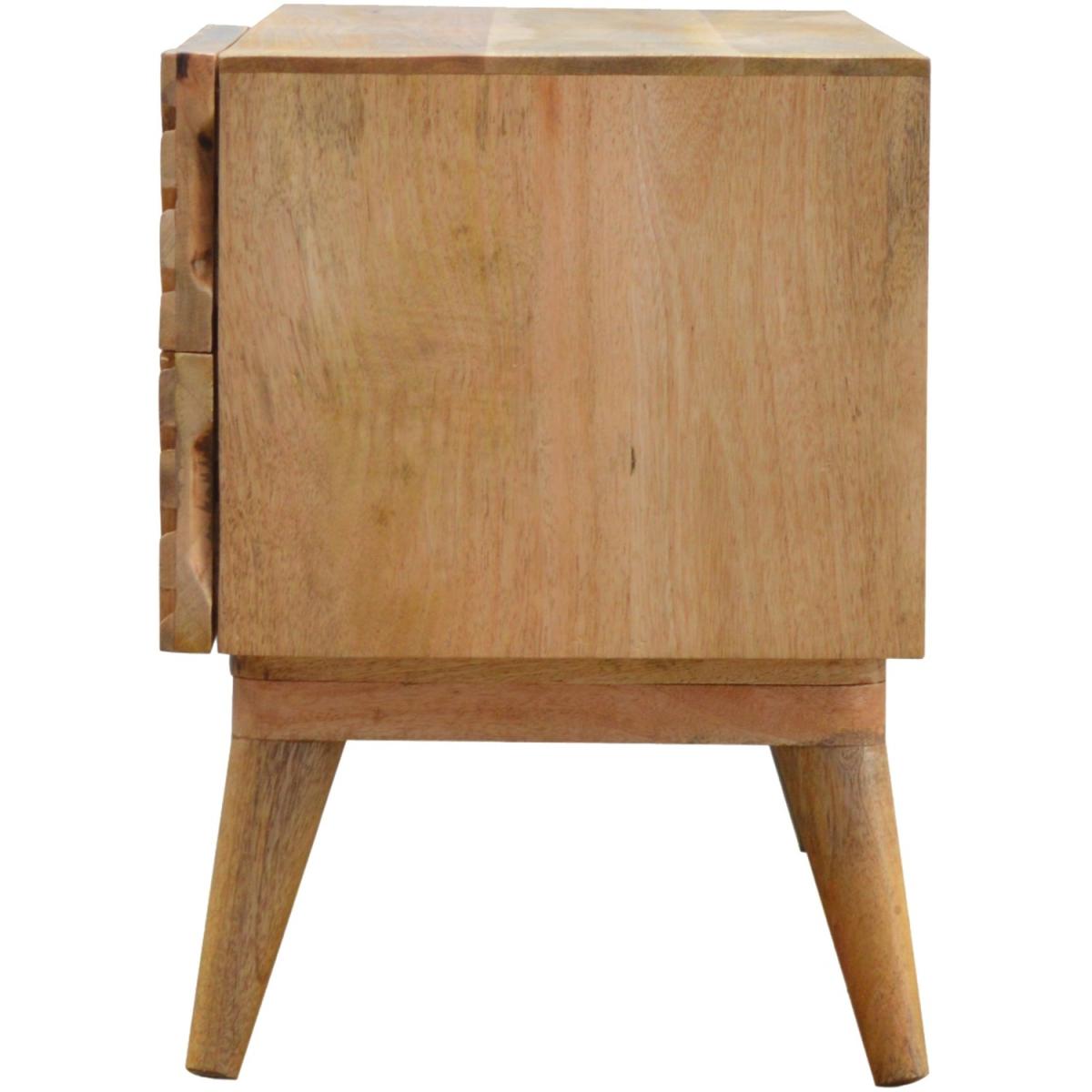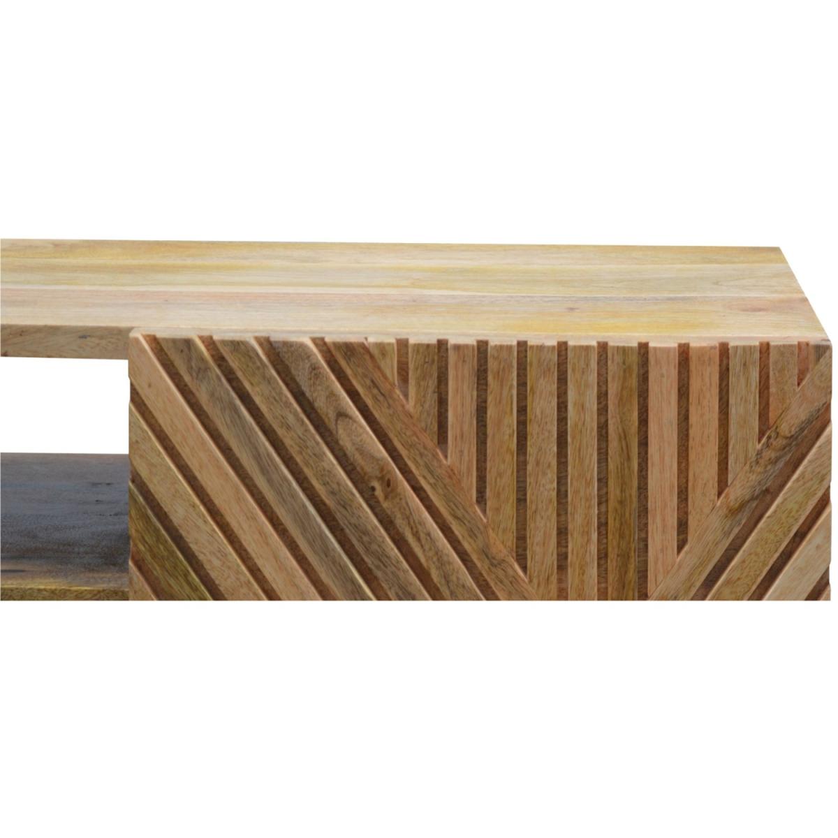 Add this unique solid wood media unit to your living room, constructed from 100% solid mango wood in an oak-ish finish, this piece features 2 open slots and a very unique carved design on the drawer fronts with a clean finish meaning easy access into the drawers without any knobs. It features 4 Nordic-style legs which complement the body nicely and gives the entire piece a contemporary look. The perfect addition to the home.
