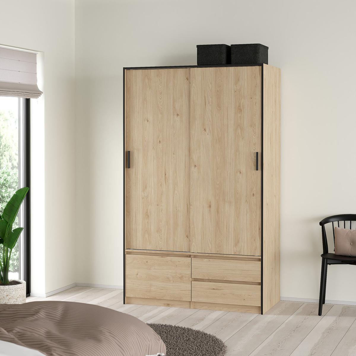 I’m a fan of this hickory oak sliding wardrobe for its clean lines, muted grain and slim black frame - it slots right into Scandi, modern farmhouse or pared-back contemporary bedrooms. The sliding doors save floor space, while the two lower drawers are perfect for rolled knitwear or bedtime bits. For styling, keep the top surface clear or add low-profile woven baskets to store out-of-season linens. Inside, use slim velvet hangers for a cohesive look and tuck shoes or boxes into the base. Pair with light-grey walls and natural-fibre rugs to enhance the warm oak tone.