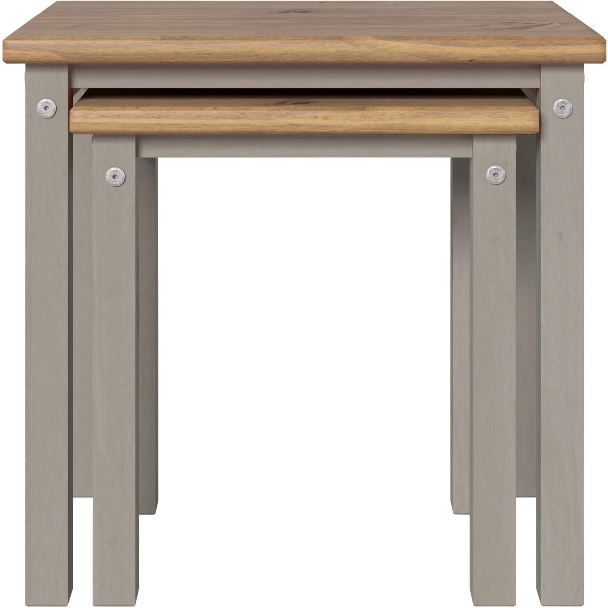 The Linea grey nest of 2 tables is a useful set for your living or dining room. The tables can be used independently or nested to save space. The underframe is finished in a grey washed wax with antique waxed pine tops which have a plank effect. The tables are constructed using steel assembly bolts for strength and stability using an allen key, which is supplied.