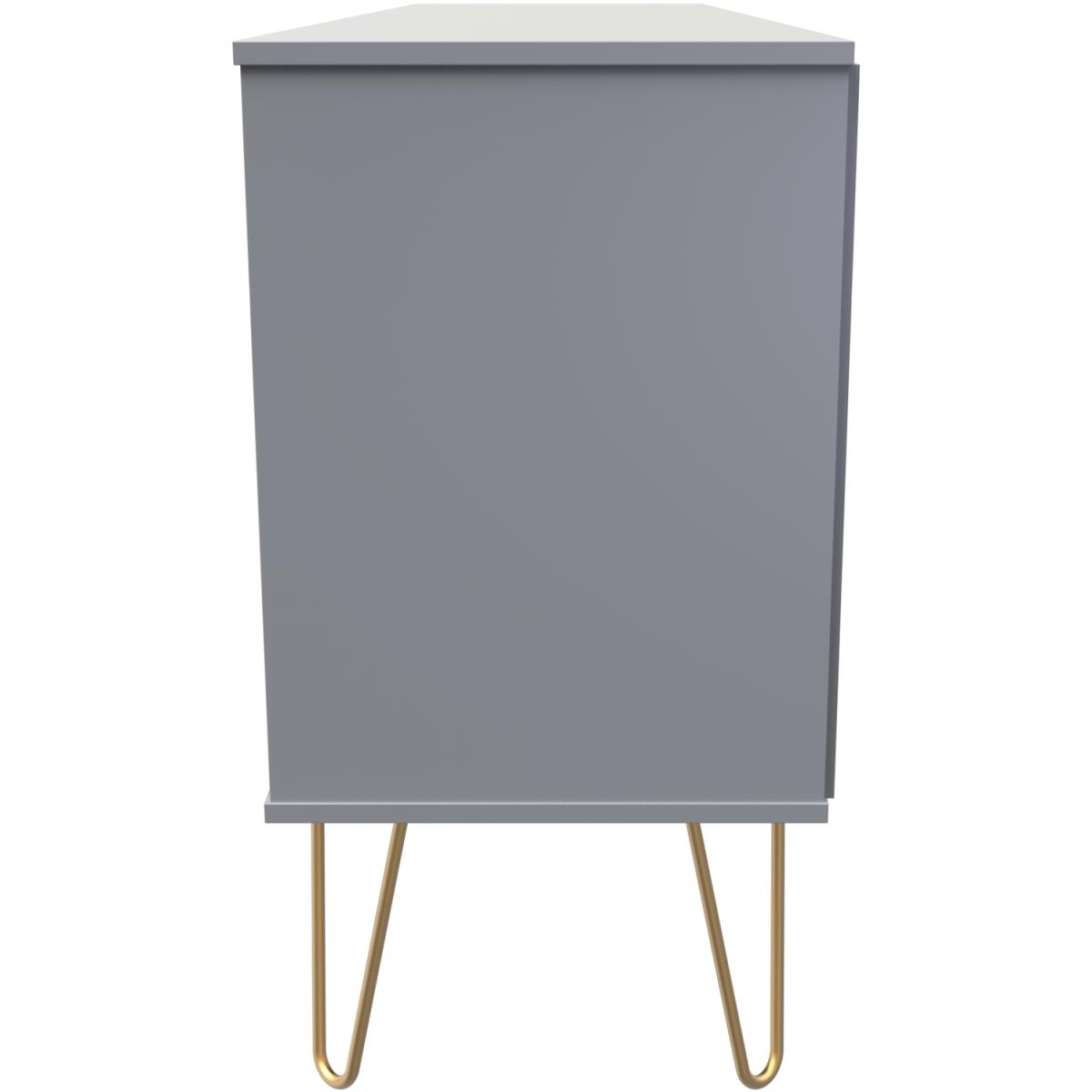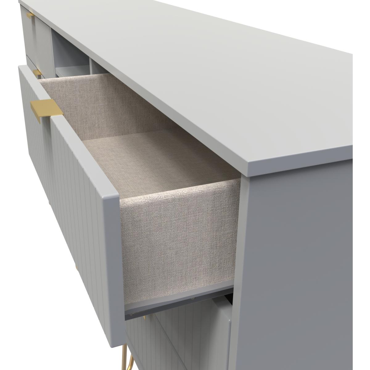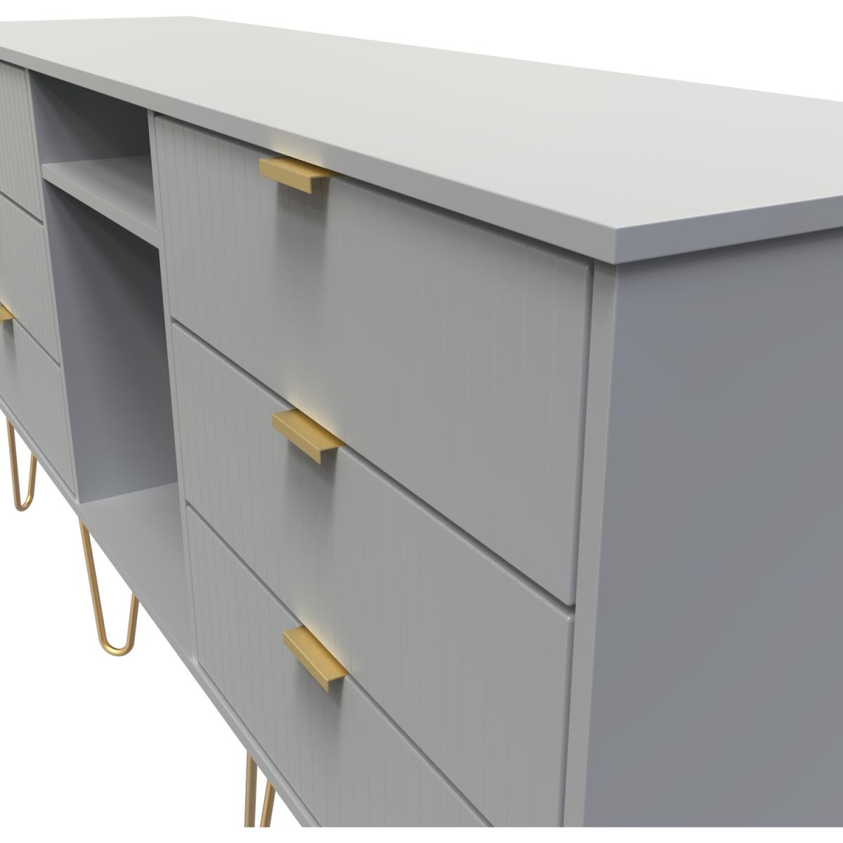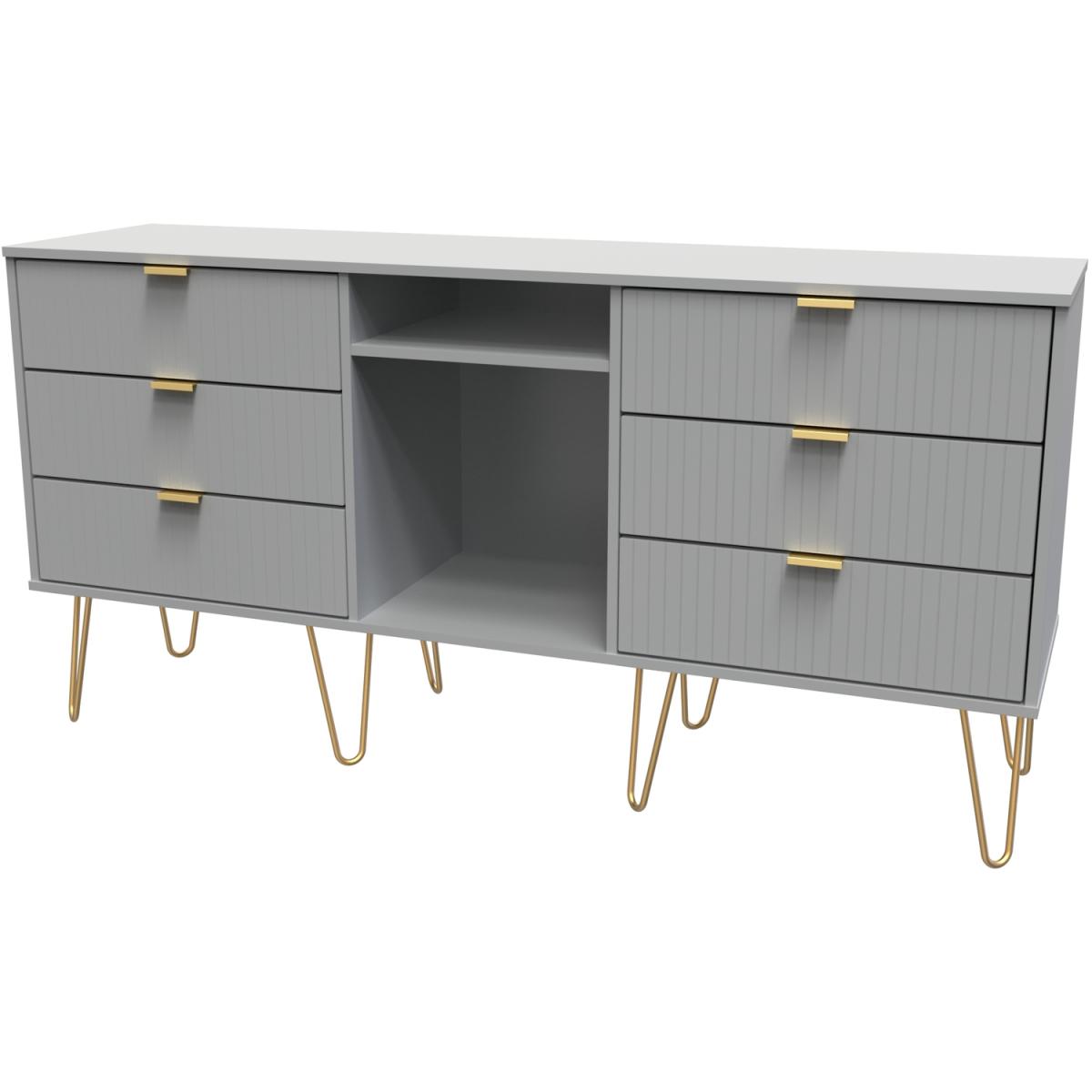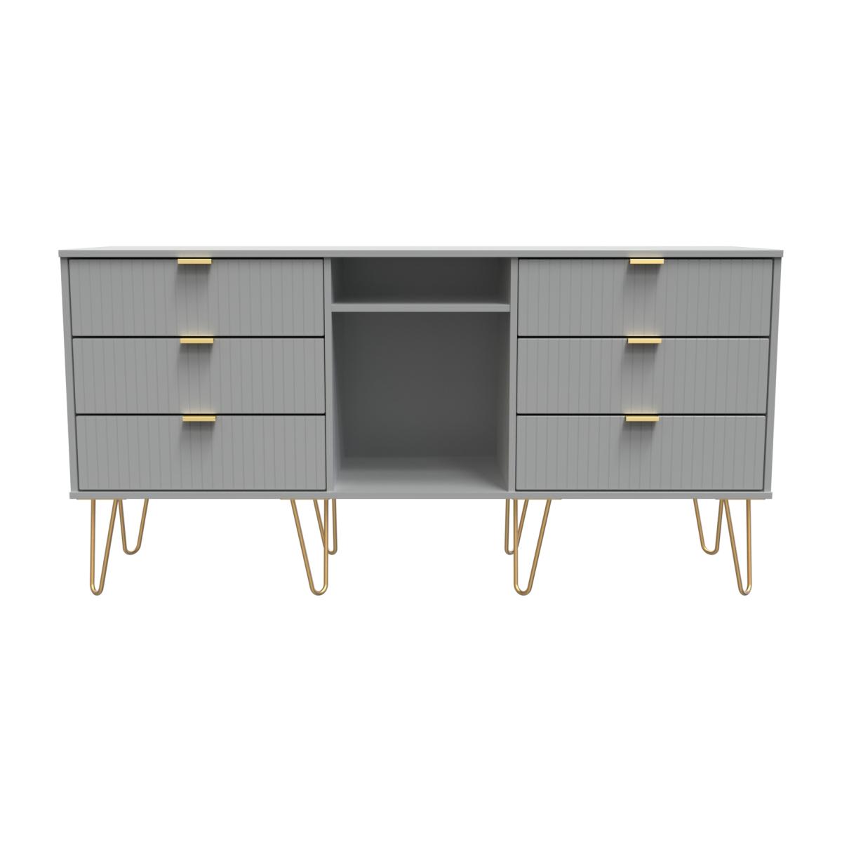 This wide storage unit features 6 storage drawers with a central shelf. Suitable for use as a TVMedia unit or sideboard. A modern and distinctive range. Named for the unique "Linear" patten of the drawer and door fronts. Also features Gold Metal Handles and Gold Hairpin Legs. Comes in a wide range of colours including eye cathching two tone colour combinations. All our furniture is made in the United Kingdom, to the highest quality. It is delivered direct to your location of choice by one of our two man delivery teams, and come full assembled (although legs may be removed to prevent damage in transit).