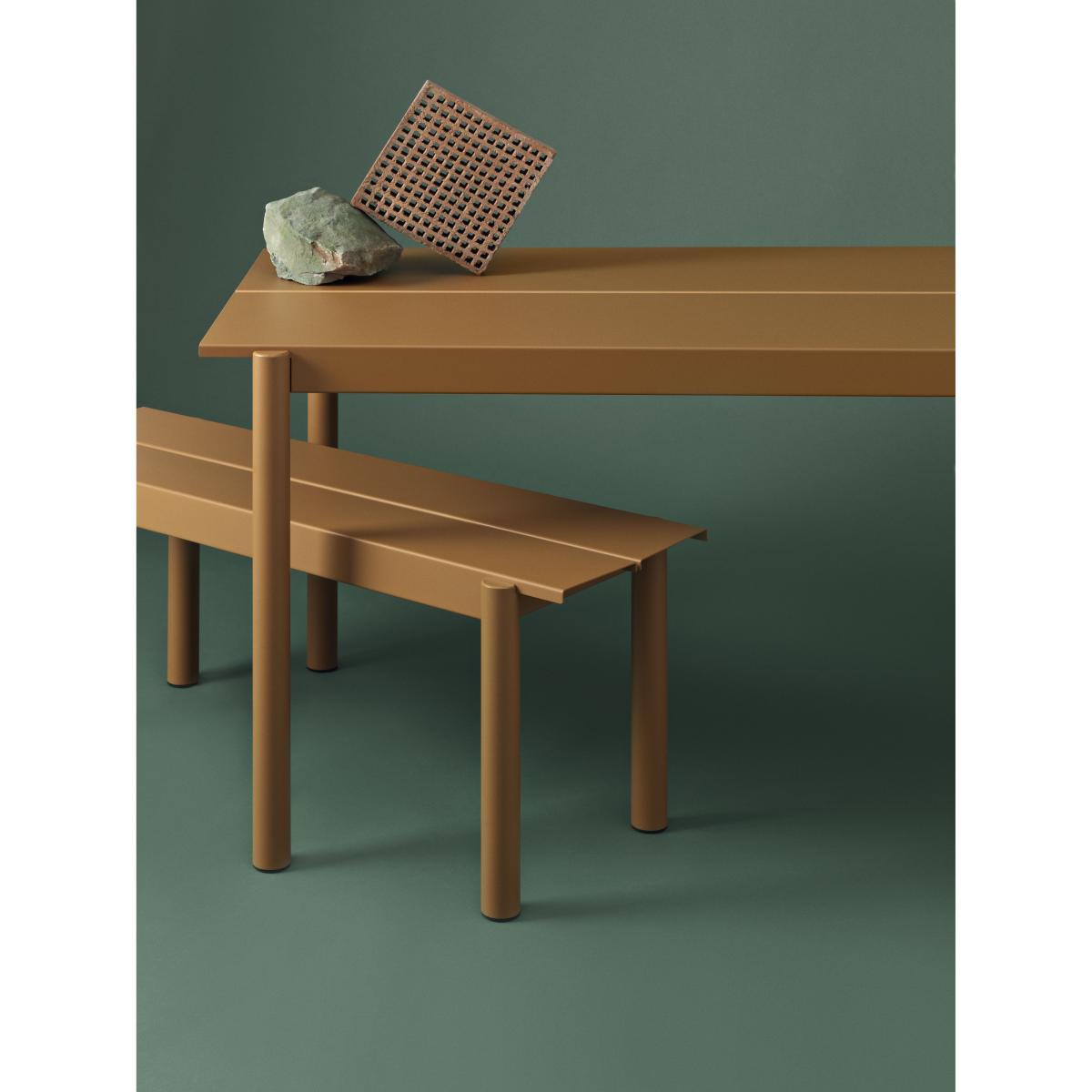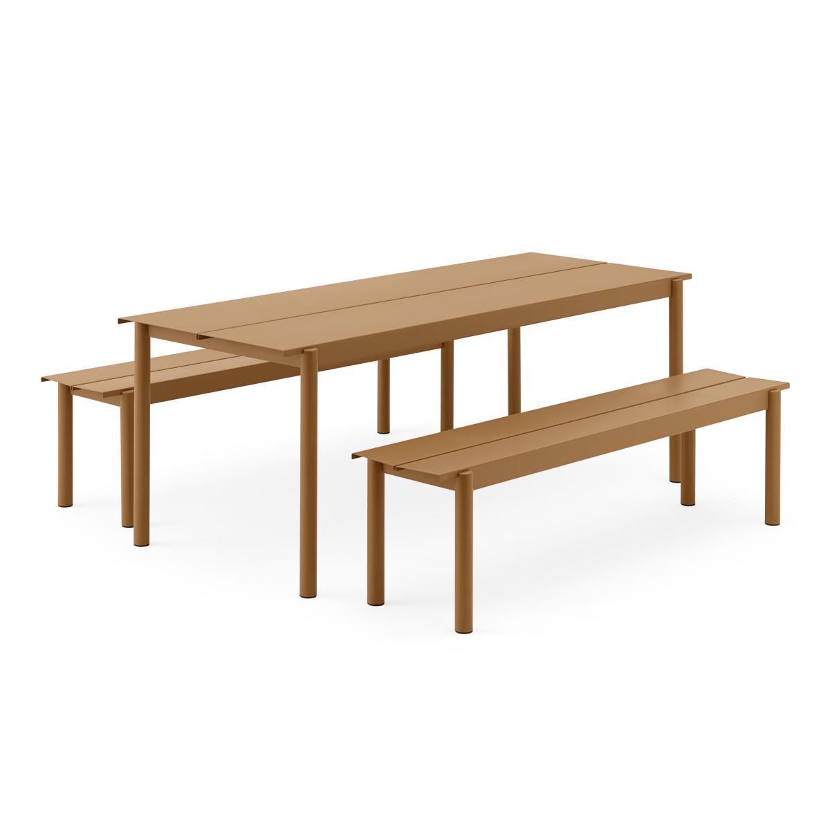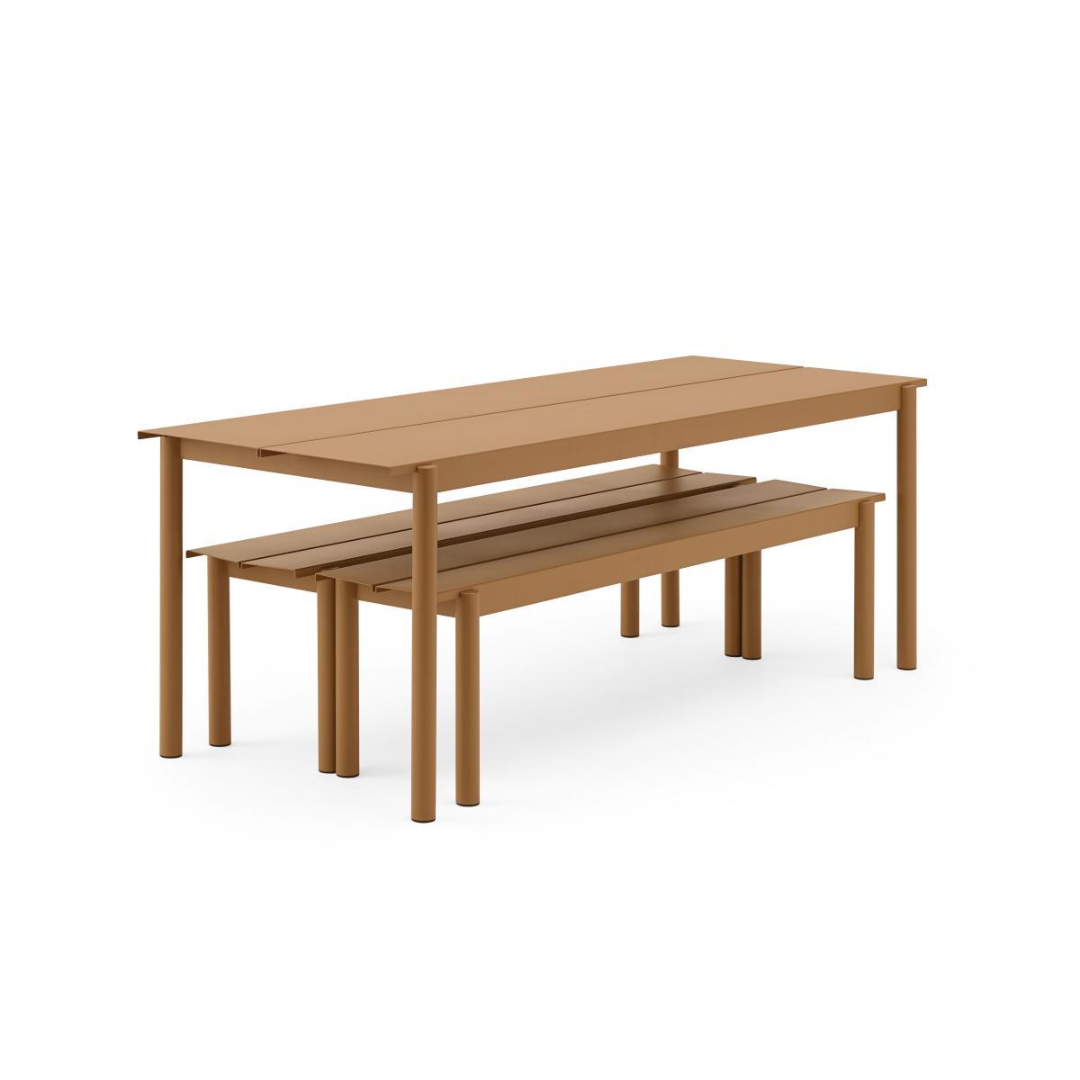 The new Scandinavian style by Muuto for your gardens and terraces! The Linear collection from the Danish designer, Thomas Bentzen is characterised by straight and rigorous lines and a pure, sophisticated and modern design. Robust and durable, this steel furniture has undergone specific treatments so that it perfectly resists bad weather and UV rays. All the sophistication of Linear is focussed on the care taken over the details: the edges folded away, the fine slit in the middle of the seat allowing the water to run off, the semi-circular legs. Linear has an elegant contrast of shapes. The rigorous and linear forms of the seat are combined with the roundness of the semi-circular legs. The four legs are fixed on the outer edge of the seat: this graphical sign affirms the identity of the collection and softens the outline. The Linear collection consists of tables with matching benches.