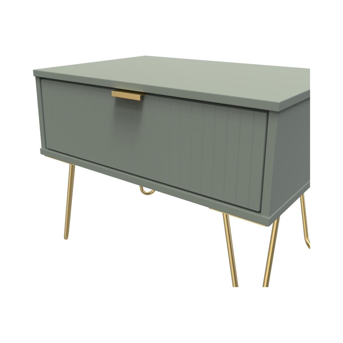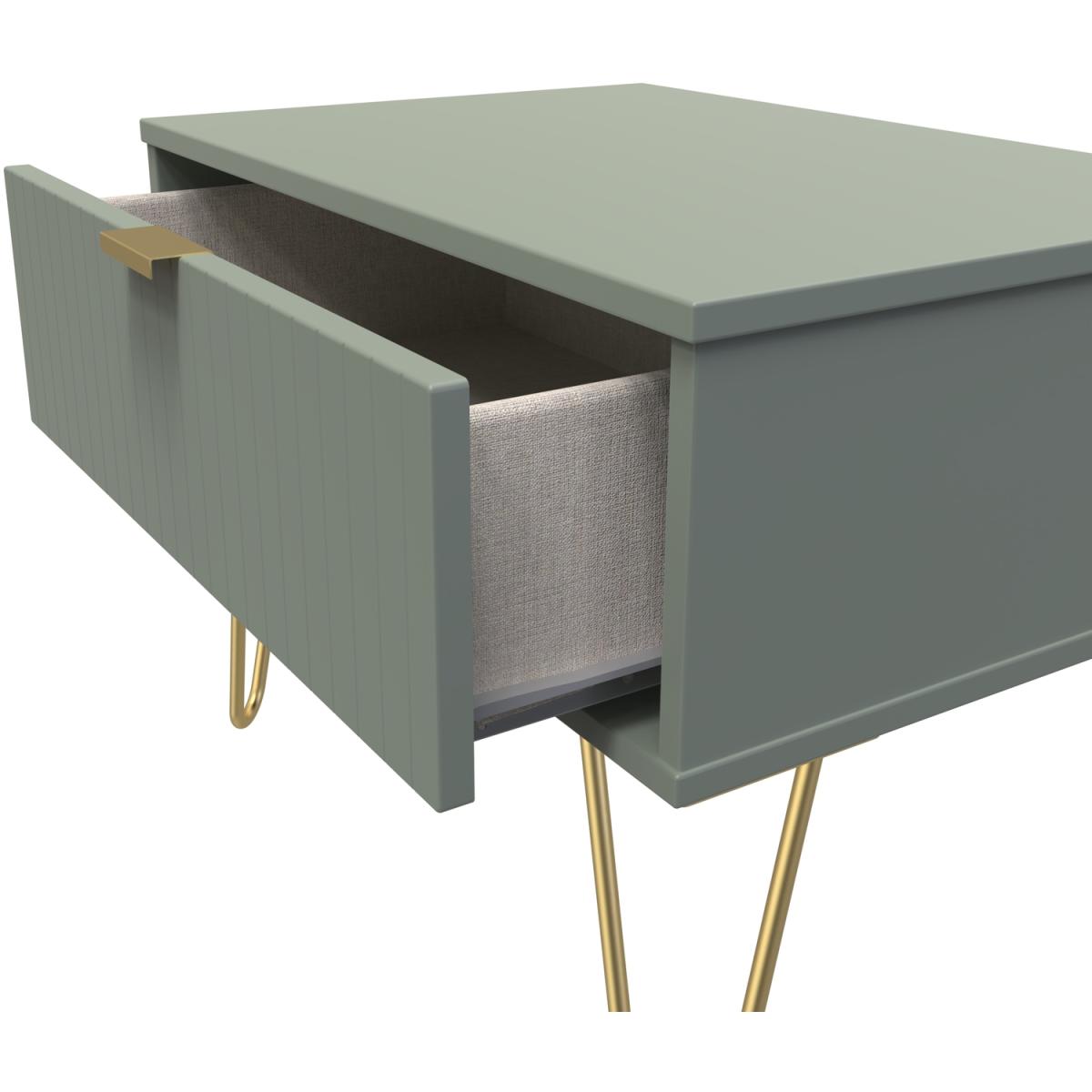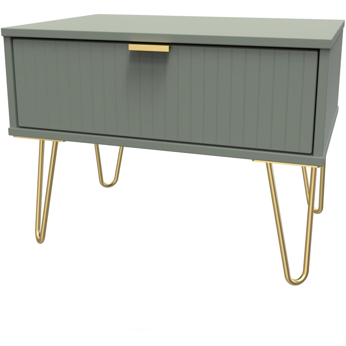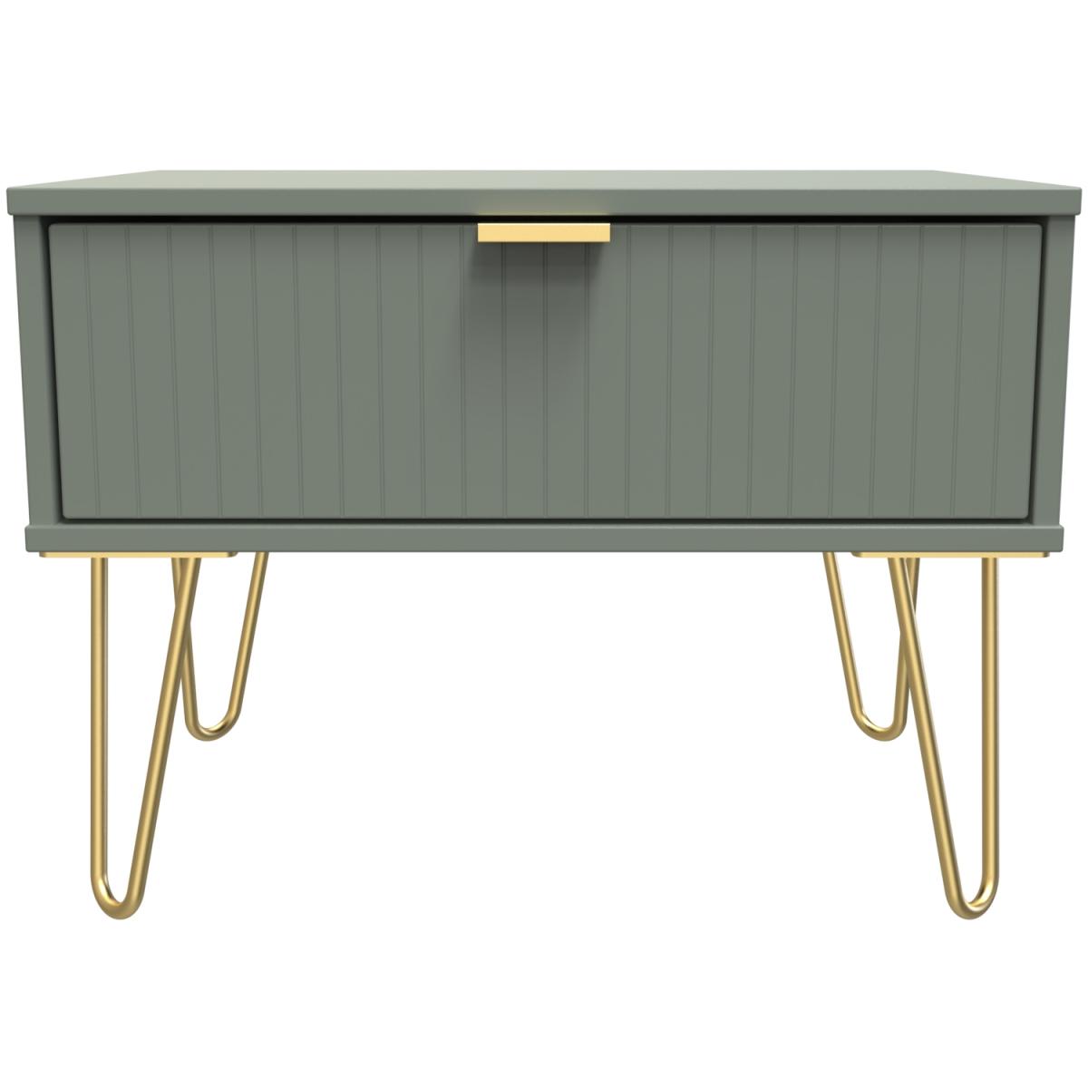 This single drawer bedside cabinet is wider than normal for added practicality. Perfect for any bedside or as a free standing storage unit. A modern and distinctive range. Named for the unique "Linear" patten of the drawer and door fronts. Also features Gold Metal Handles and Gold Hairpin Legs. Comes in a wide range of colours including eye cathching two tone colour combinations. All our furniture is made in the United Kingdom, to the highest quality. It is delivered direct to your location of choice by one of our two man delivery teams, and come full assembled (although legs may be removed to prevent damage in transit).