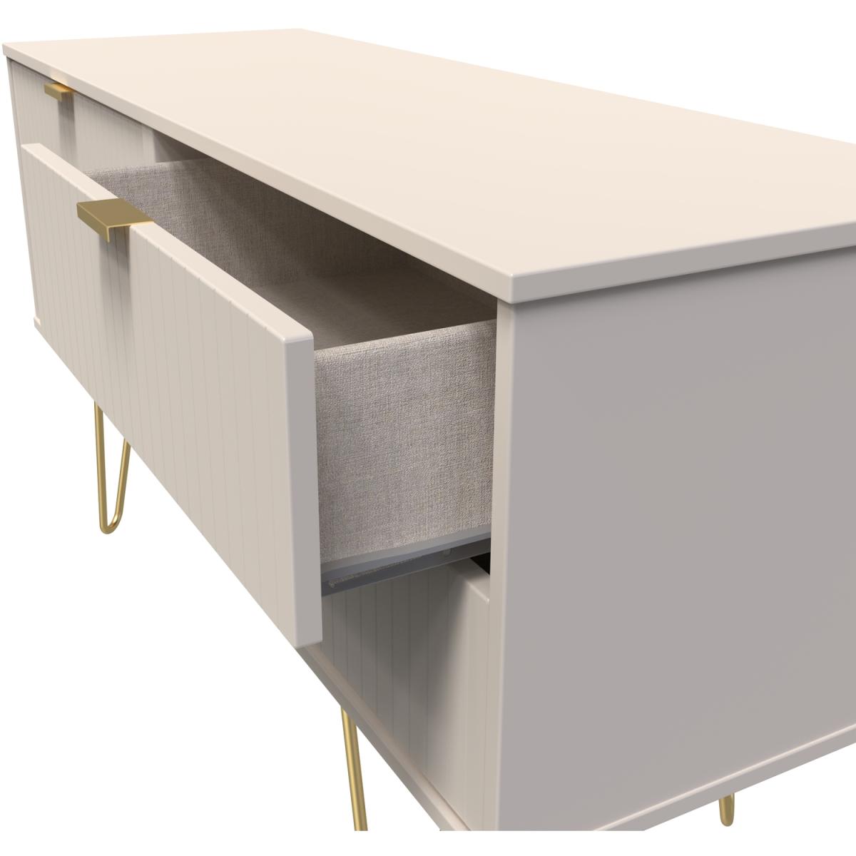 A large 4 drawer bed box. A Perfect storage solution for any room (not just the end of your bed). Could also be used as a low level TVMedia stand. A modern and distinctive range. Named for the unique "Linear" patten of the drawer and door fronts. Also features Gold Metal Handles and Gold Hairpin Legs. Comes in a wide range of colours including eye cathching two tone colour combinations. All our furniture is made in the United Kingdom, to the highest quality. It is delivered direct to your location of choice by one of our two man delivery teams, and come full assembled (although legs may be removed to prevent damage in transit).