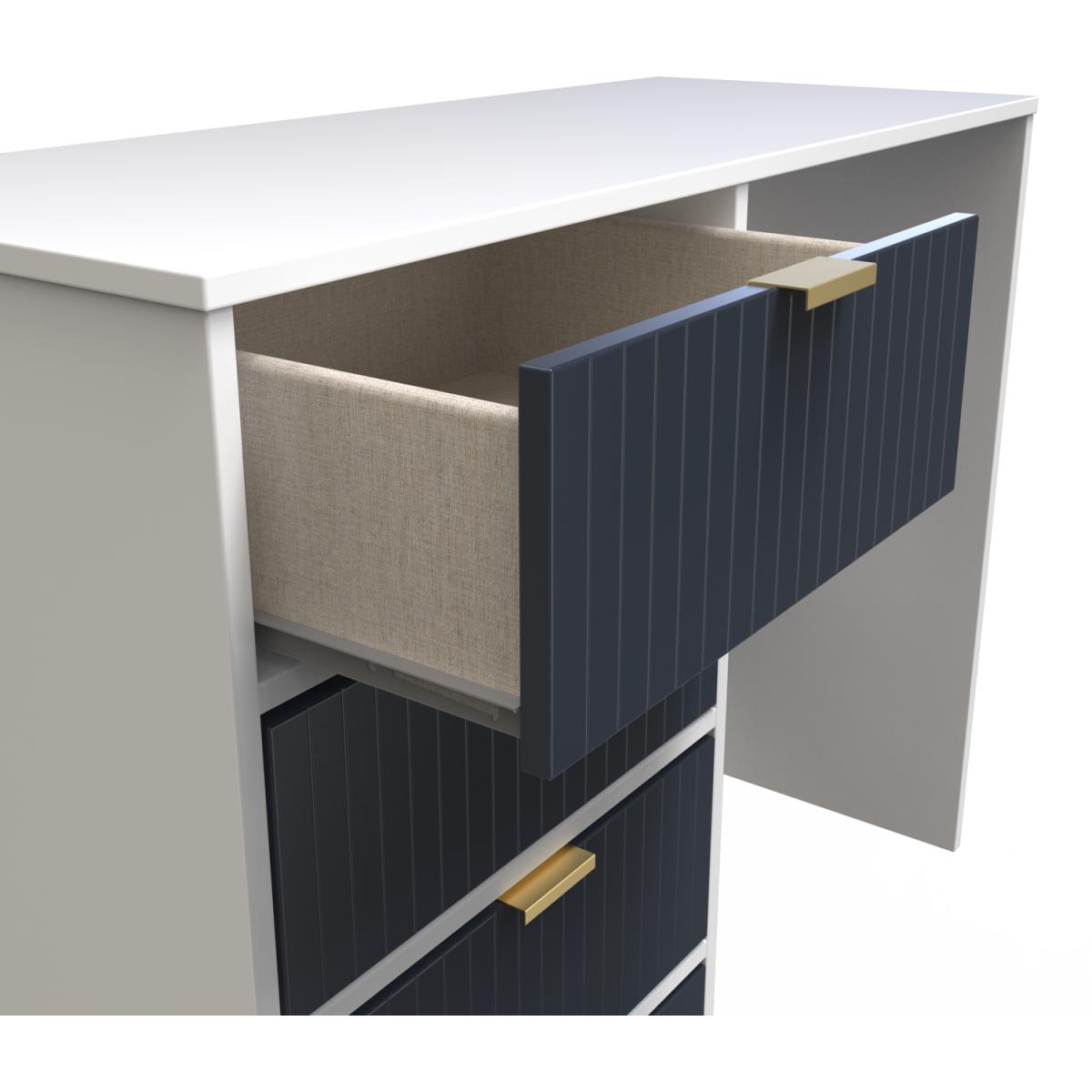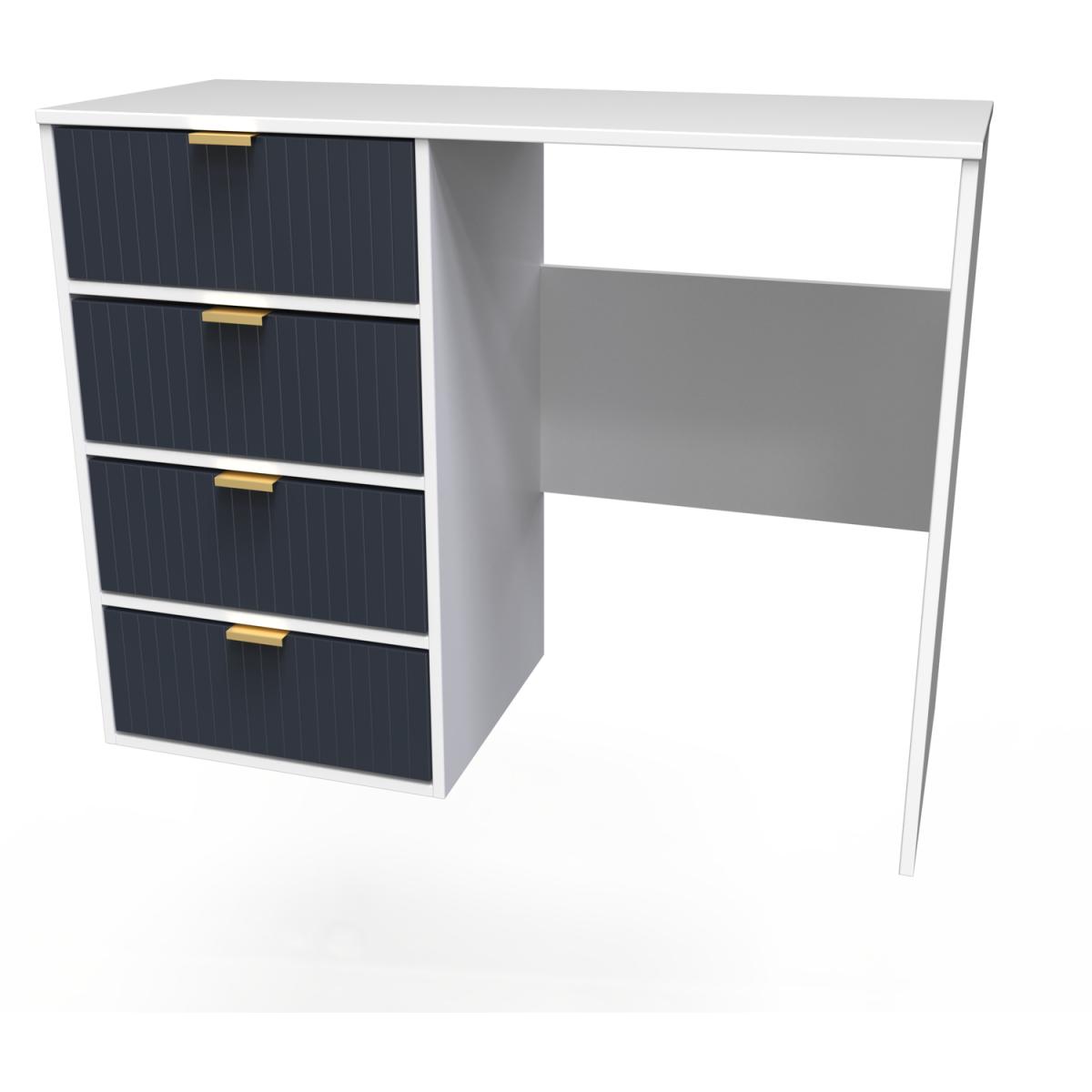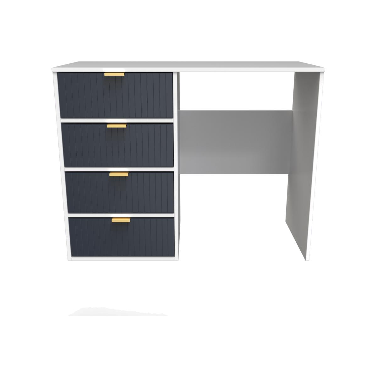 This 4 Drawer Vanity Desk is equally at home in the bedroom or the office. A modern and distinctive range. Named for the unique "Linear" patten of the drawer and door fronts. Also features Gold Metal Handles and Gold Hairpin Legs. Comes in a wide range of colours including eye cathching two tone colour combinations. All our furniture is made in the United Kingdom, to the highest quality. It is delivered direct to your location of choice by one of our two man delivery teams, and come full assembled (although legs may be removed to prevent damage in transit).