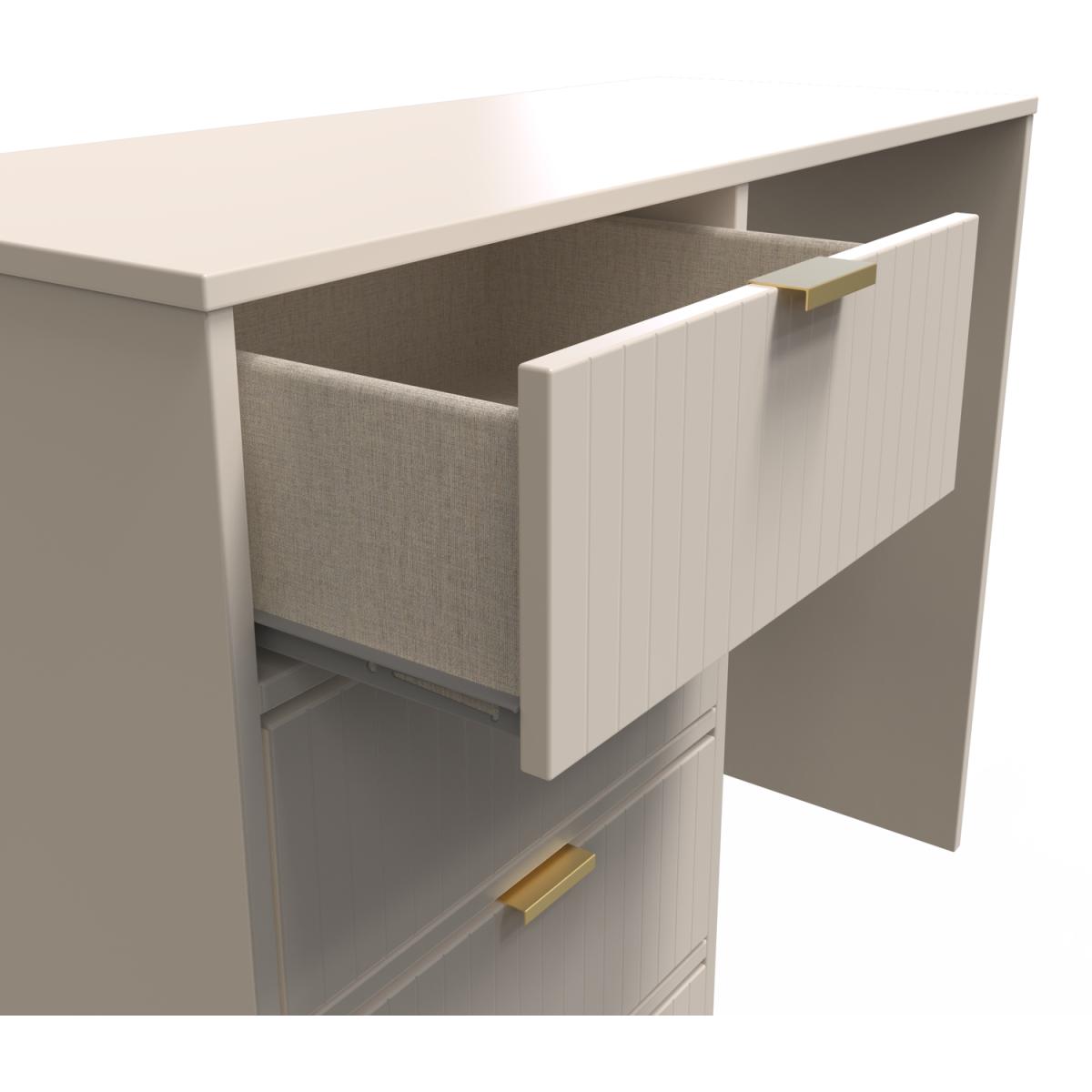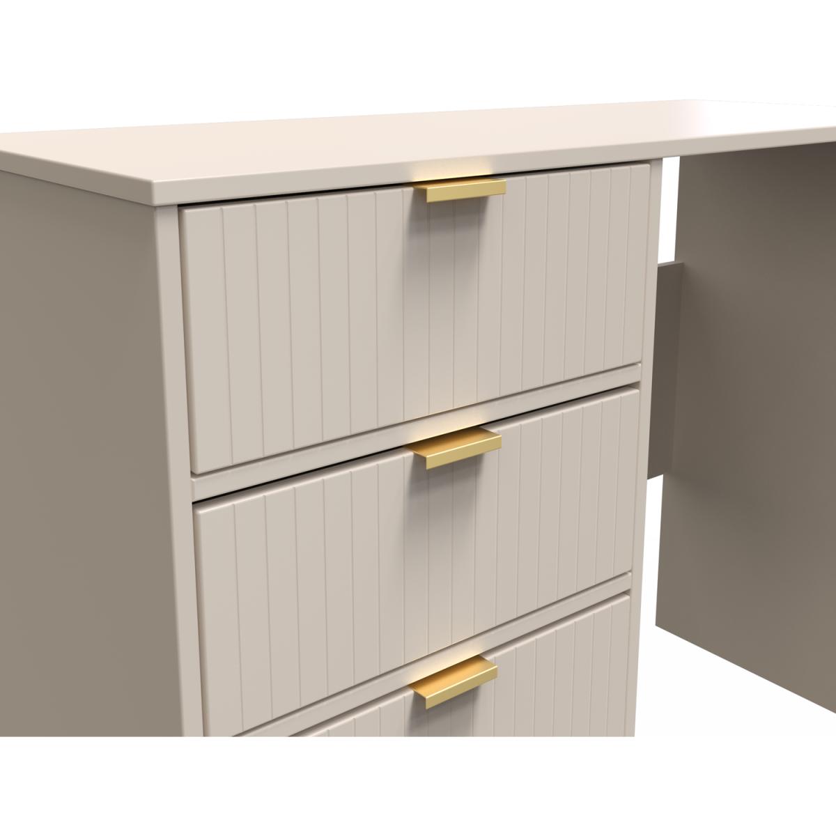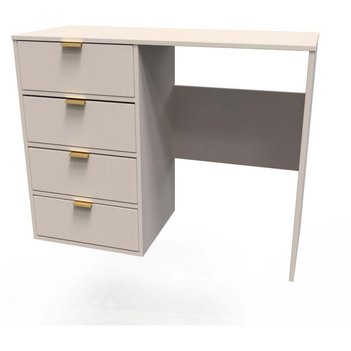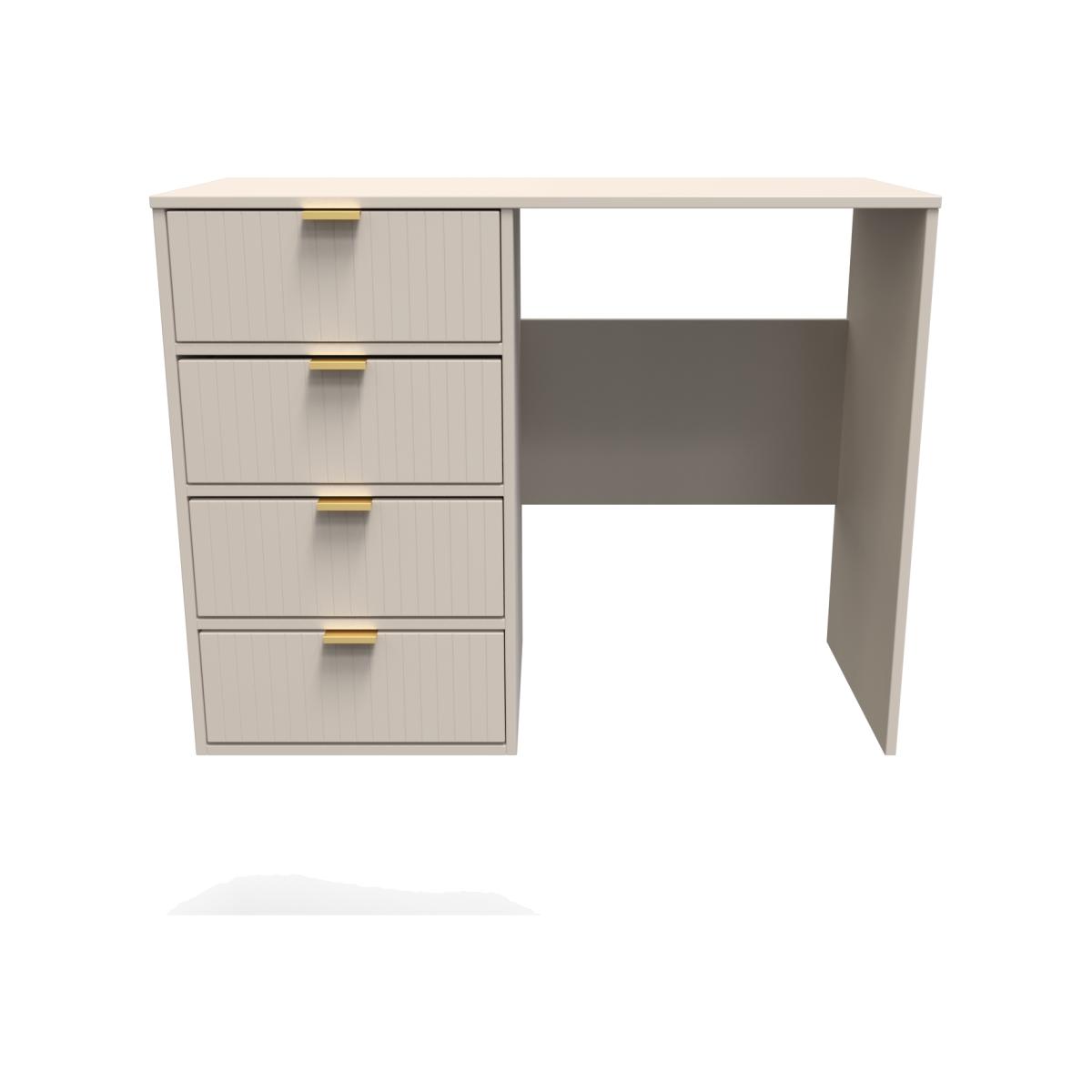 This 4 Drawer Vanity Desk is equally at home in the bedroom or the office. A modern and distinctive range. Named for the unique "Linear" patten of the drawer and door fronts. Also features Gold Metal Handles and Gold Hairpin Legs. Comes in a wide range of colours including eye cathching two tone colour combinations. All our furniture is made in the United Kingdom, to the highest quality. It is delivered direct to your location of choice by one of our two man delivery teams, and come full assembled (although legs may be removed to prevent damage in transit).