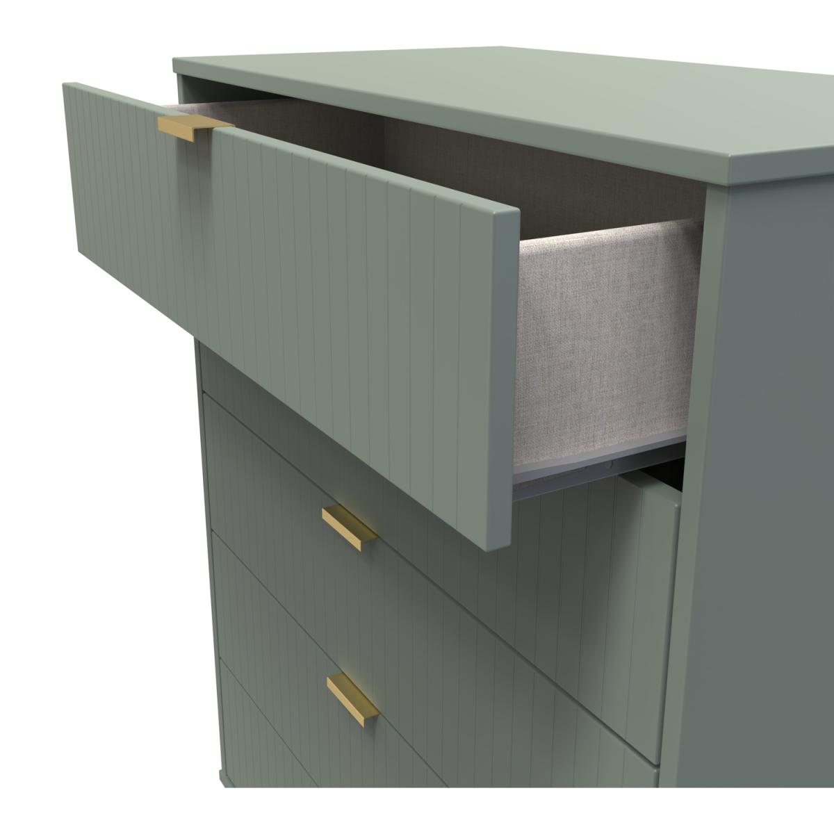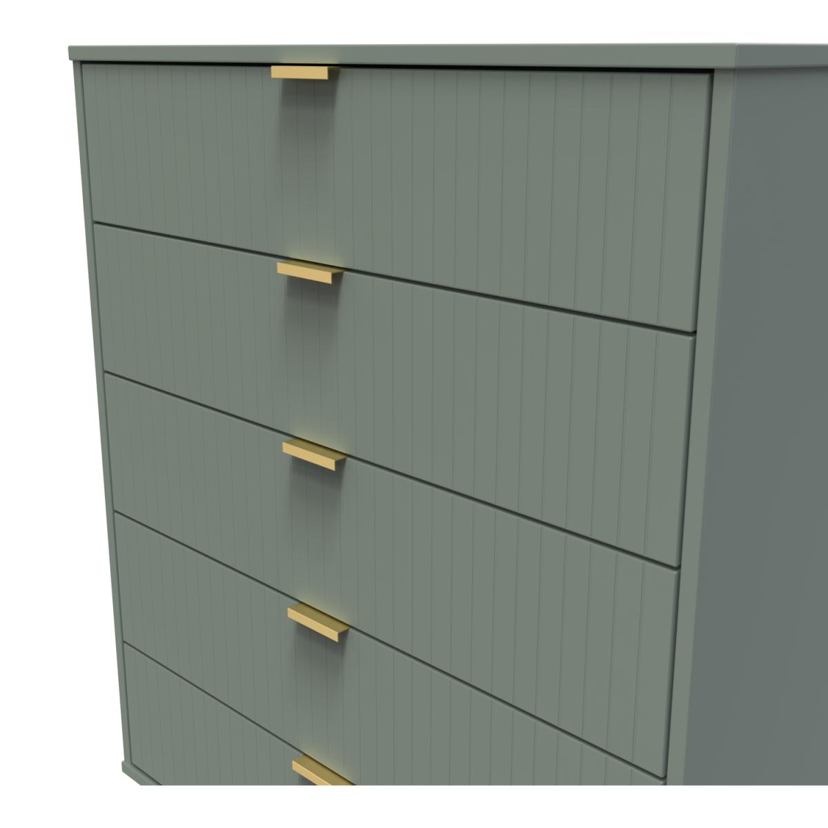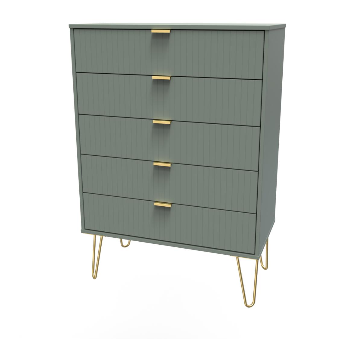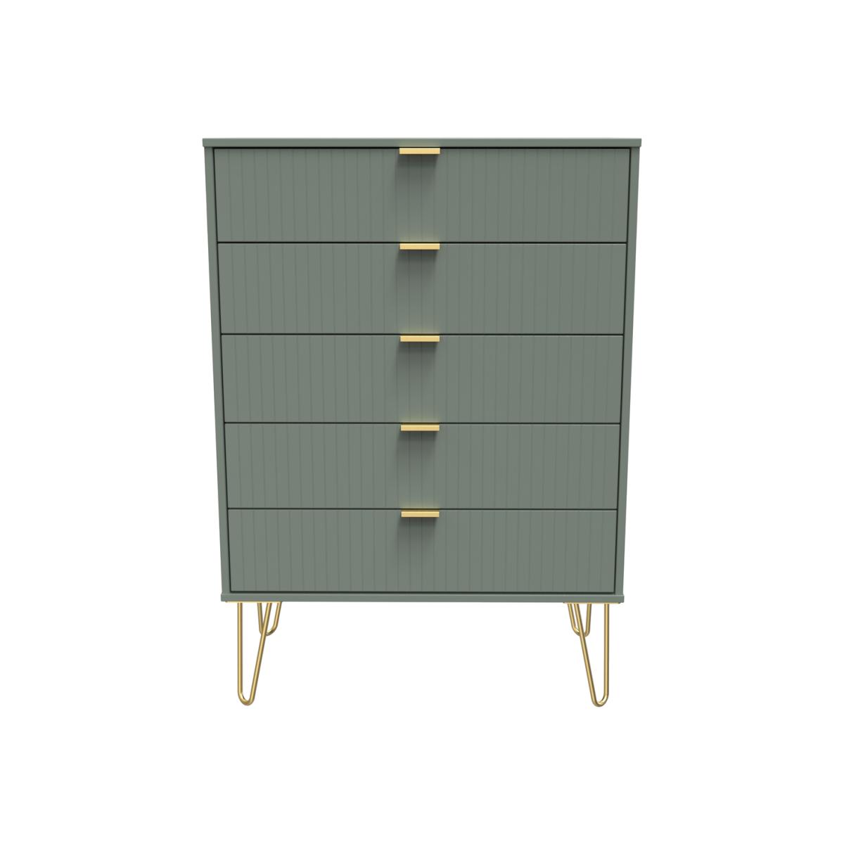 This wide 5 drawer chest of drawers is practical and stylish. Perfect for any home as a free standing storage unit. A modern and distinctive range. Named for the unique "Linear" patten of the drawer and door fronts. Also features Gold Metal Handles and Gold Hairpin Legs. Comes in a wide range of colours including eye cathching two tone colour combinations. All our furniture is made in the United Kingdom, to the highest quality. It is delivered direct to your location of choice by one of our two man delivery teams, and come full assembled (although legs may be removed to prevent damage in transit).