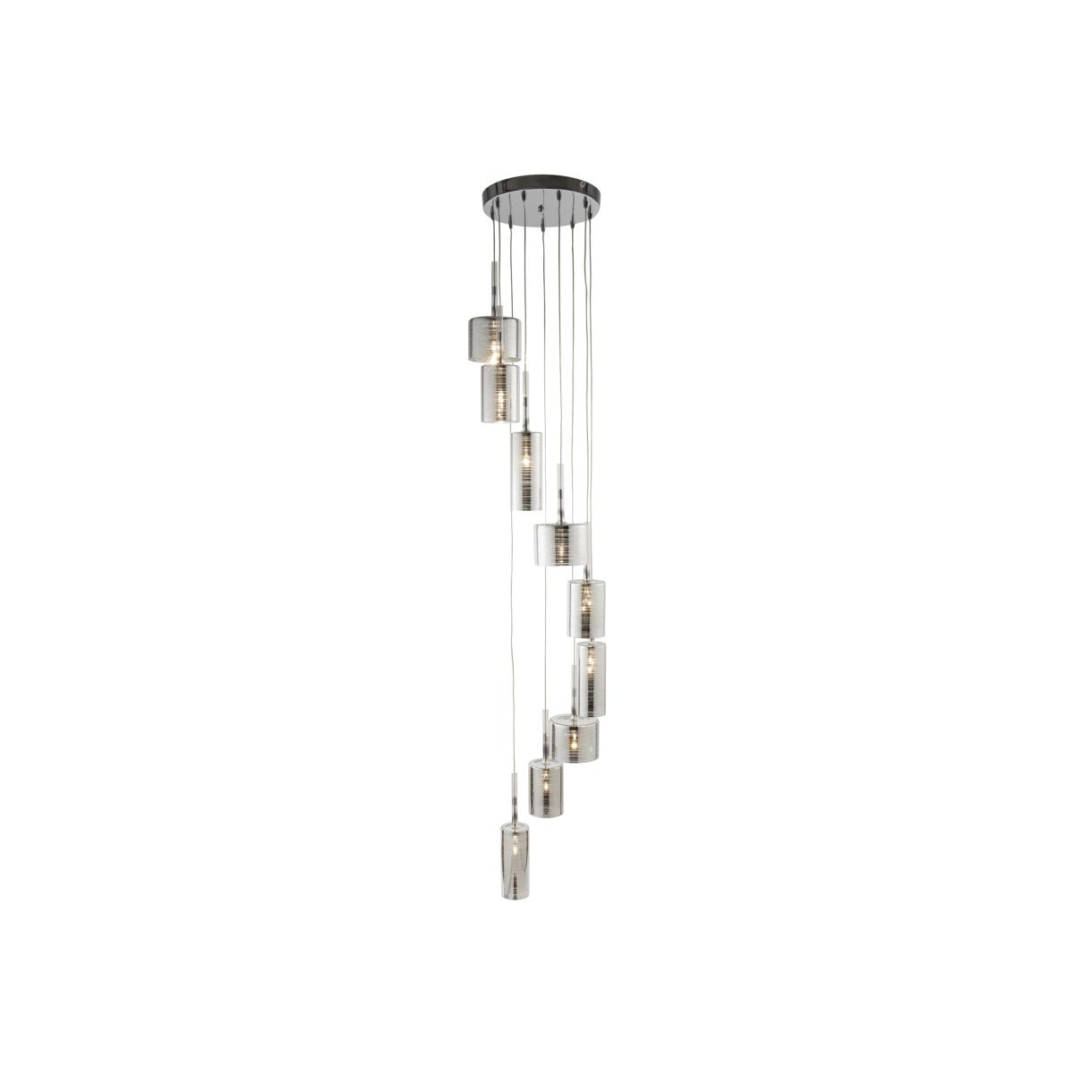 Create a Centre piece fit for any contemporary home with this Linen chrome multi-drop pendant. 9 lights hang at different lengths and will provide a generous glow. The varying in size heads contain a ribbed effect inside of the shade. Match with the 1936-6C. C 9 light multi-drop pendant