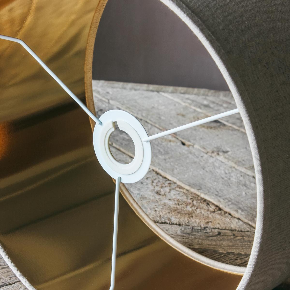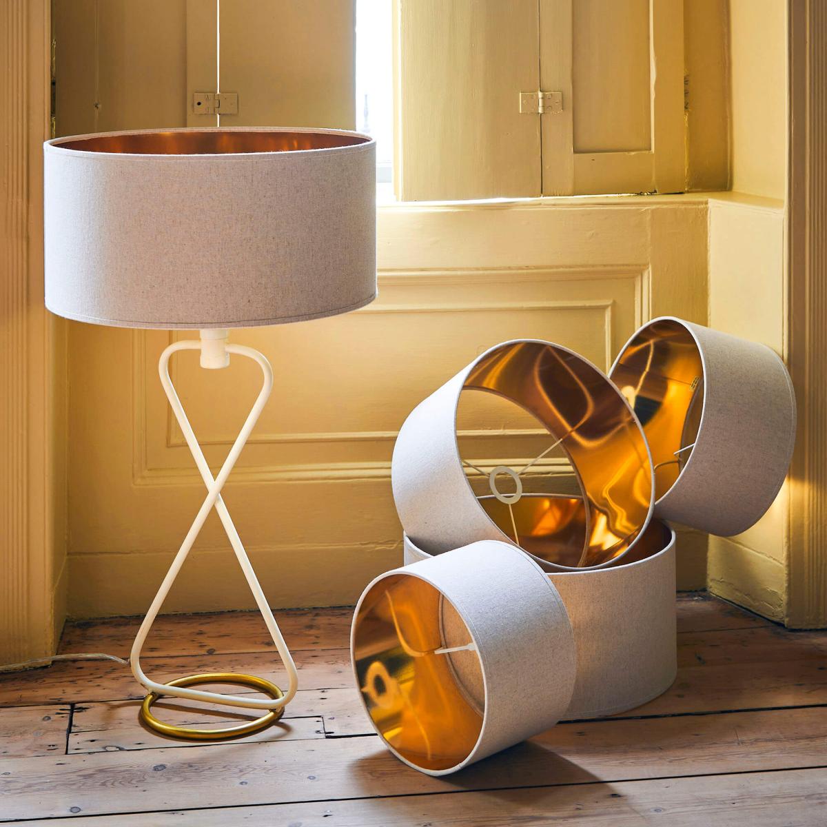 A collection of classic drum-shaped shades in a subtle natural linen with hand-rolled edges and a metallic gold inner. The perfect finishing touch to your interior styling.