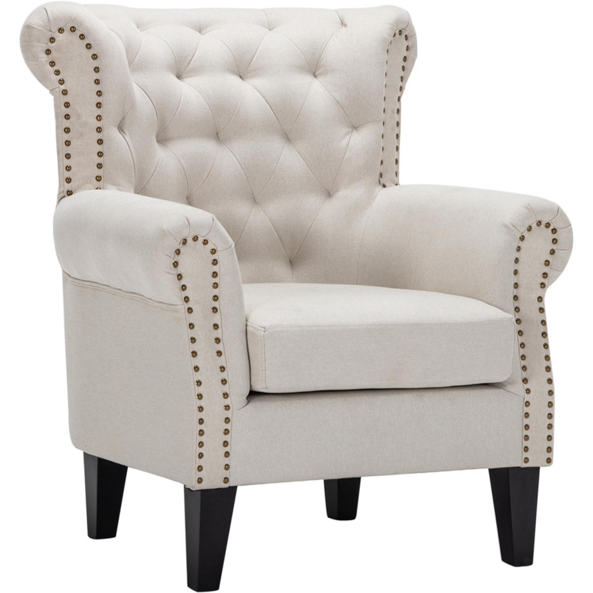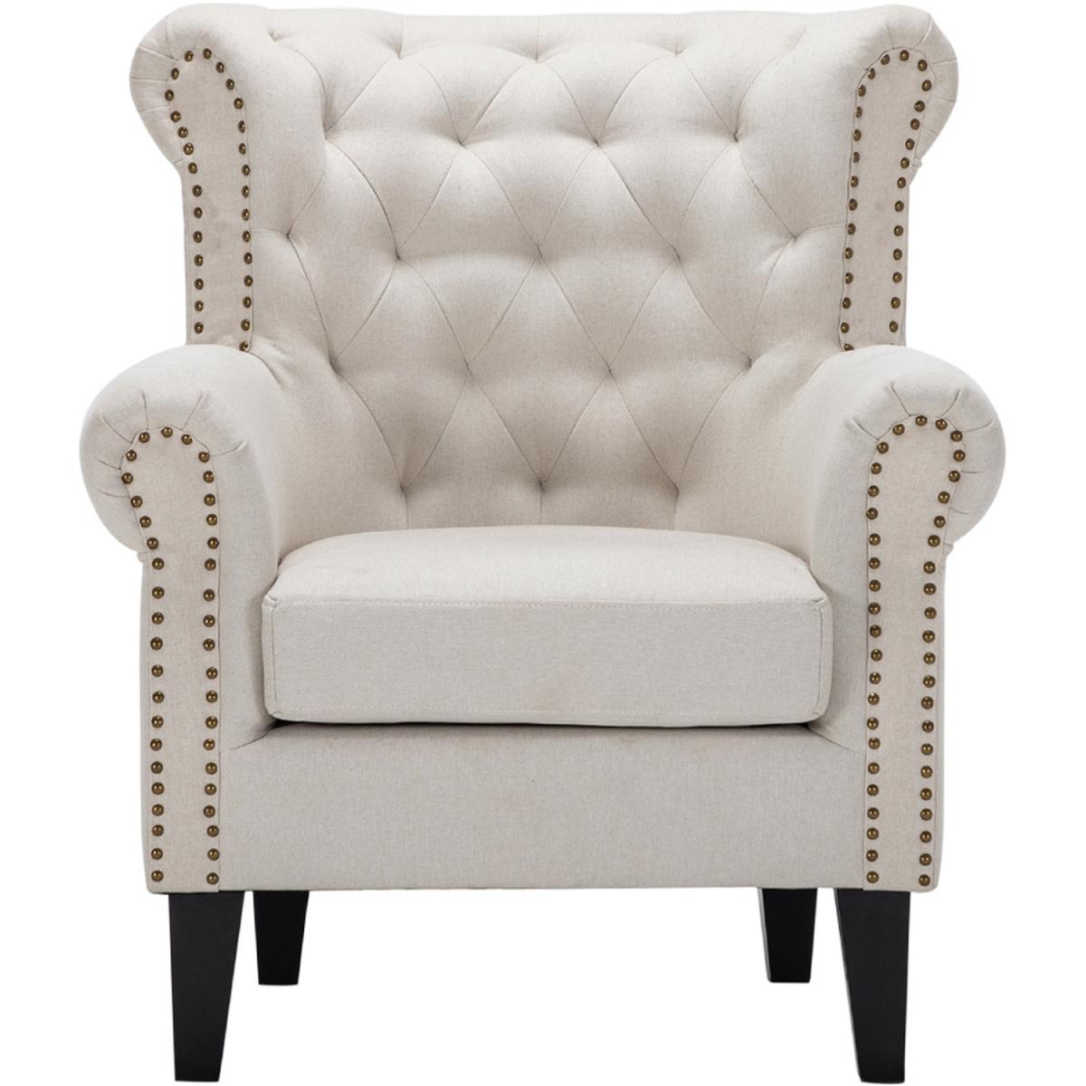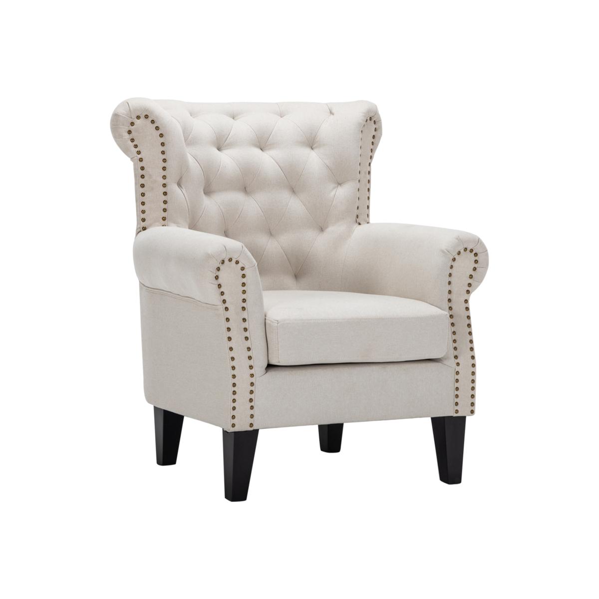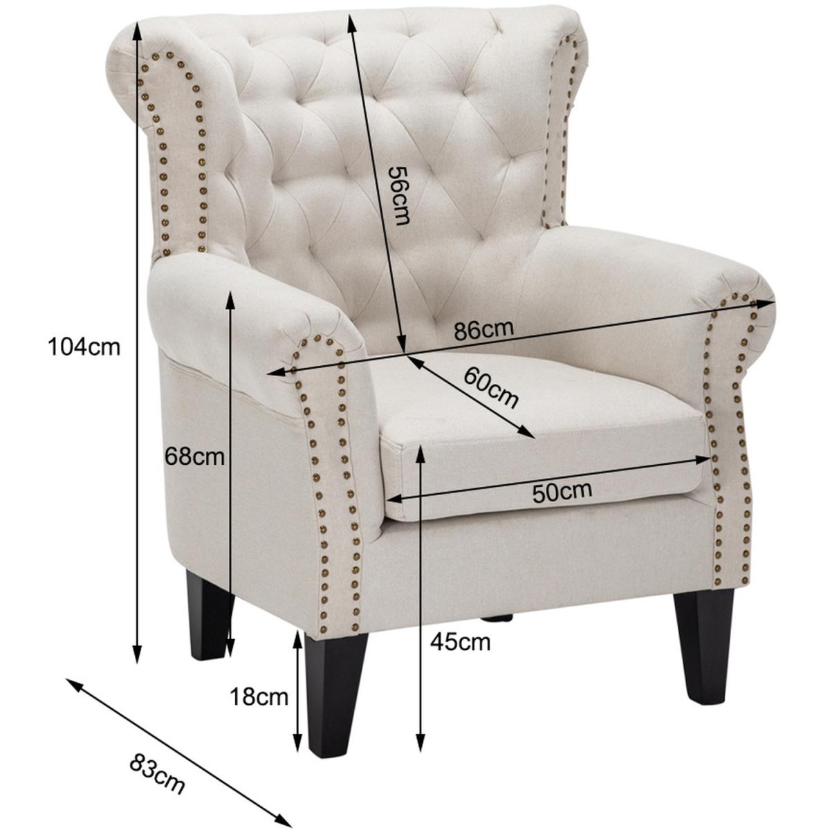 I love this beige armchair for its timeless, versatile appeal and classic design. Its neutral tone makes it easy to incorporate into various interiors, from traditional to contemporary schemes. It's particularly well-suited for cosy living rooms or reading nooks, where it can serve as a statement piece or a subtle complement to patterned cushions or throws. Practical styling tips include pairing it with contrasting textures-think a velvet cushion or a soft throw-to add visual interest, and placing it near a side table with a lamp for a functional, inviting setup. The statement studded detailing and sturdy wooden legs also provide a touch of sophistication that elevates any space.