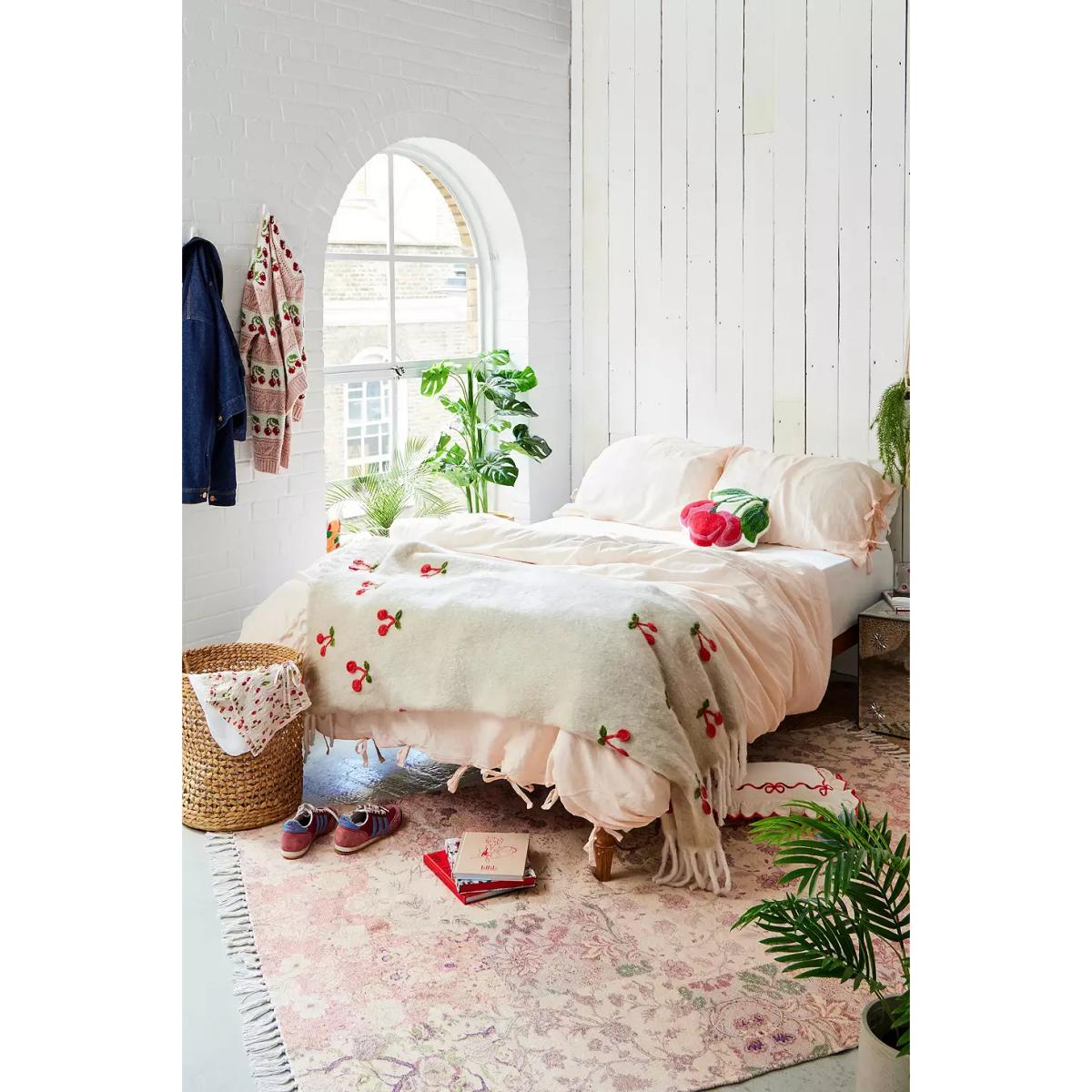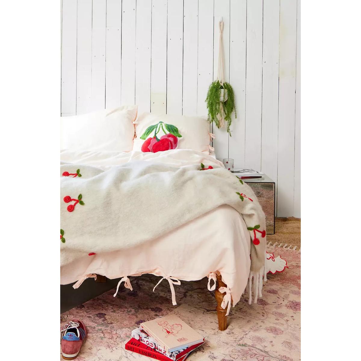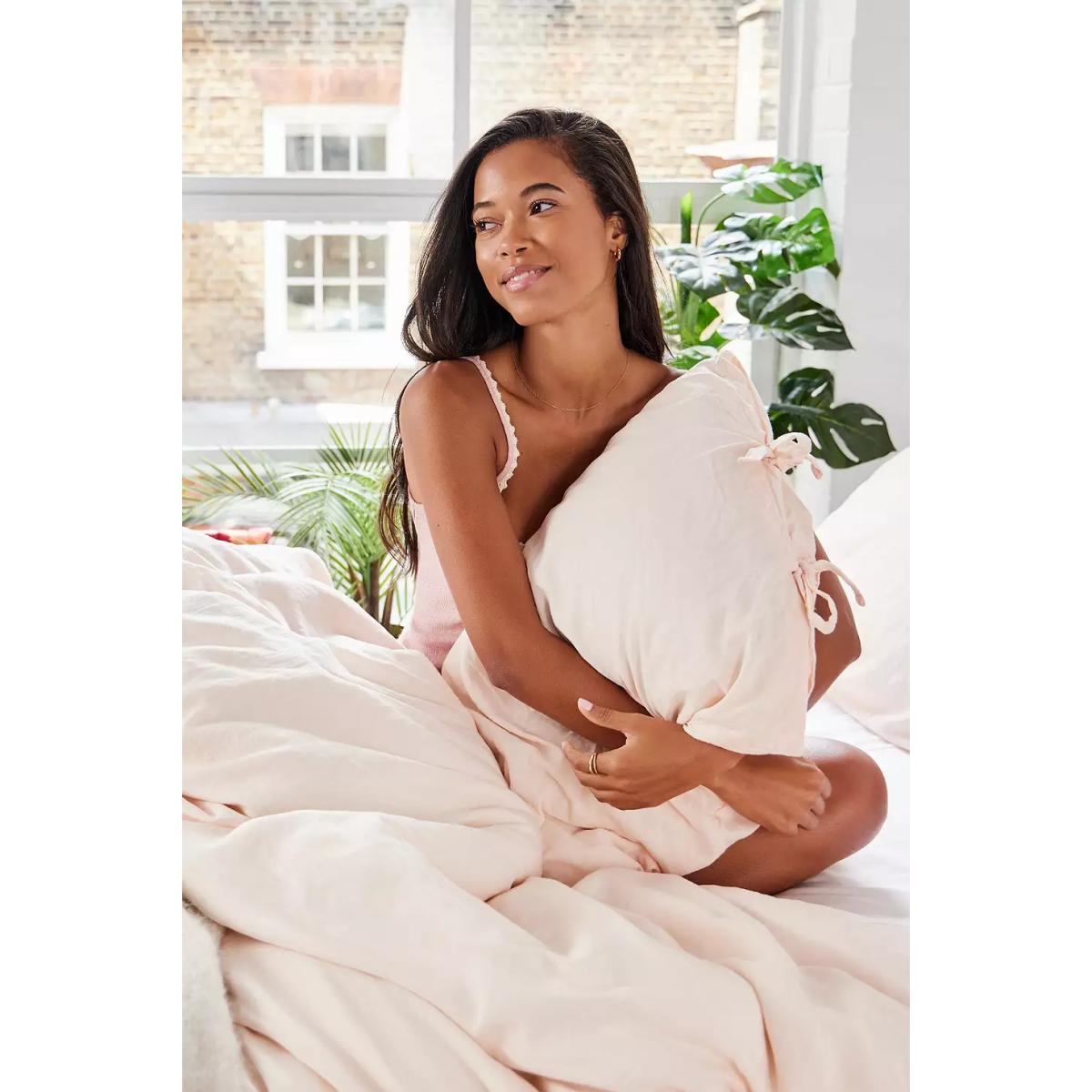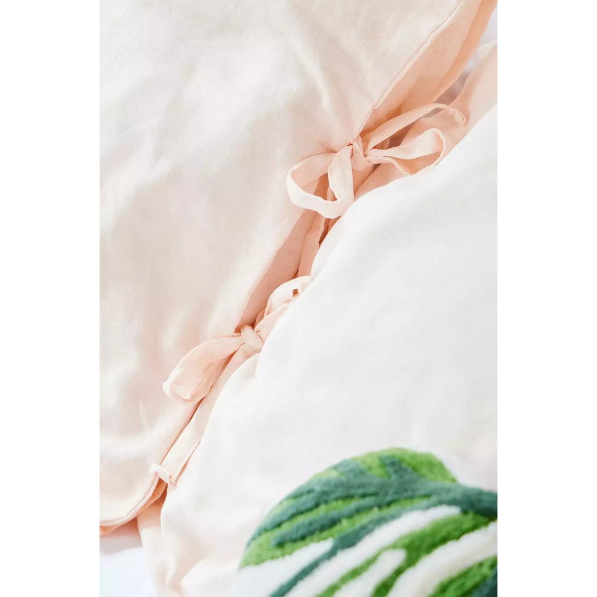Create a kitsch sleeping space with this bow-topped duvet set. The duvet set and patching pillowcases are woven from a super-soft cotton and linen blend, complete with a plain colour design and tied ribbon seams. **About Better Cotton** \- By choosing our cotton products, you’re supporting our investment in Better Cotton’s mission \- This product is sourced via a system of mass balance and therefore may not contain Better Cotton \- Bettercotton.org/massbalance **Content + Care** \- 50% Cotton, 50% Linen \- Machine wash **Size** \- Double (includes 2 pillowcases): 200cm (W) x 200cm (H) \- King (includes 2 pillowcases): 230cm (W) x 220cm (H) \- Pillowcase: 75cm x 50cm