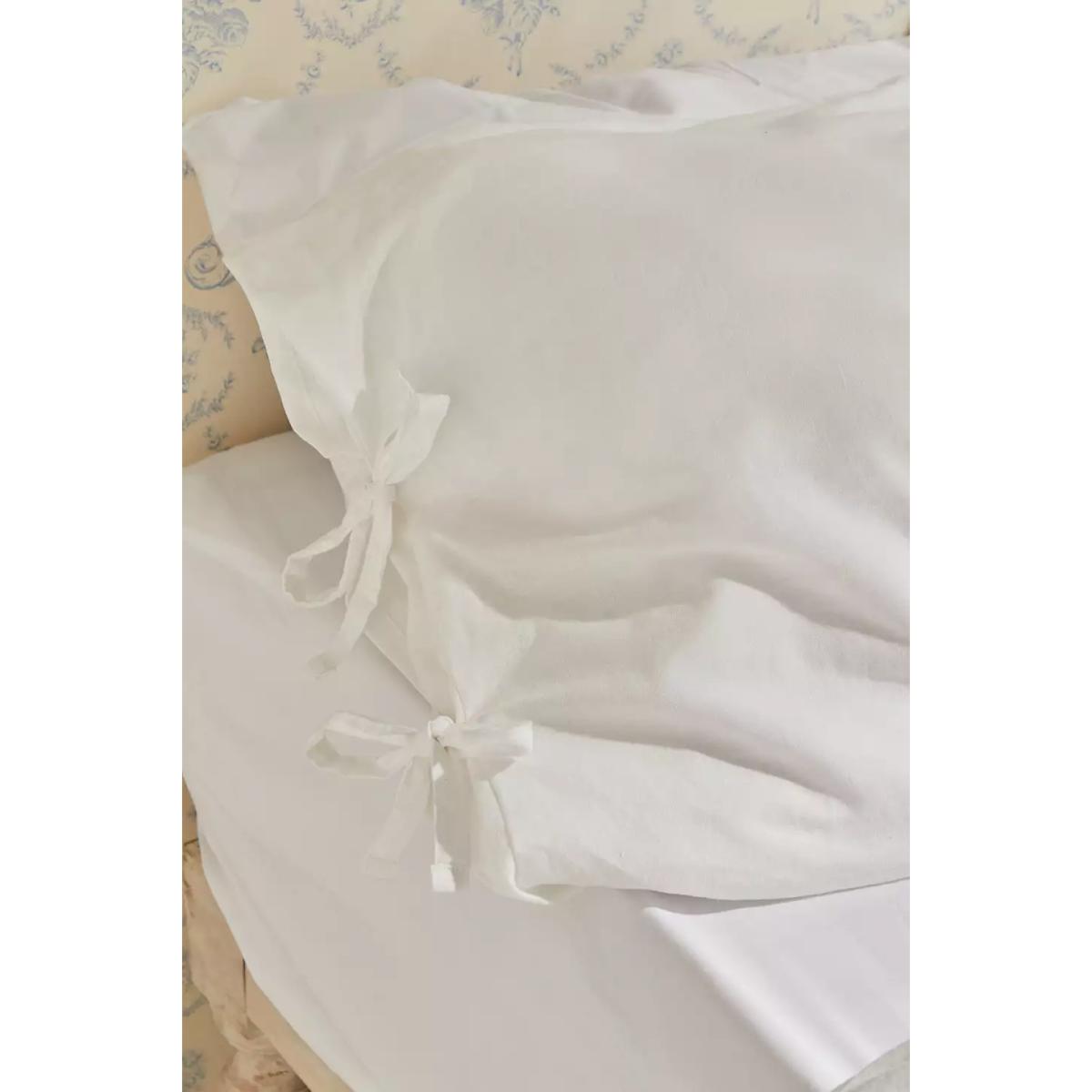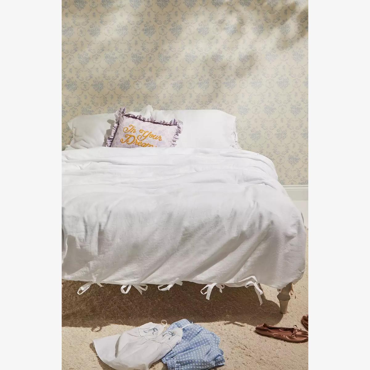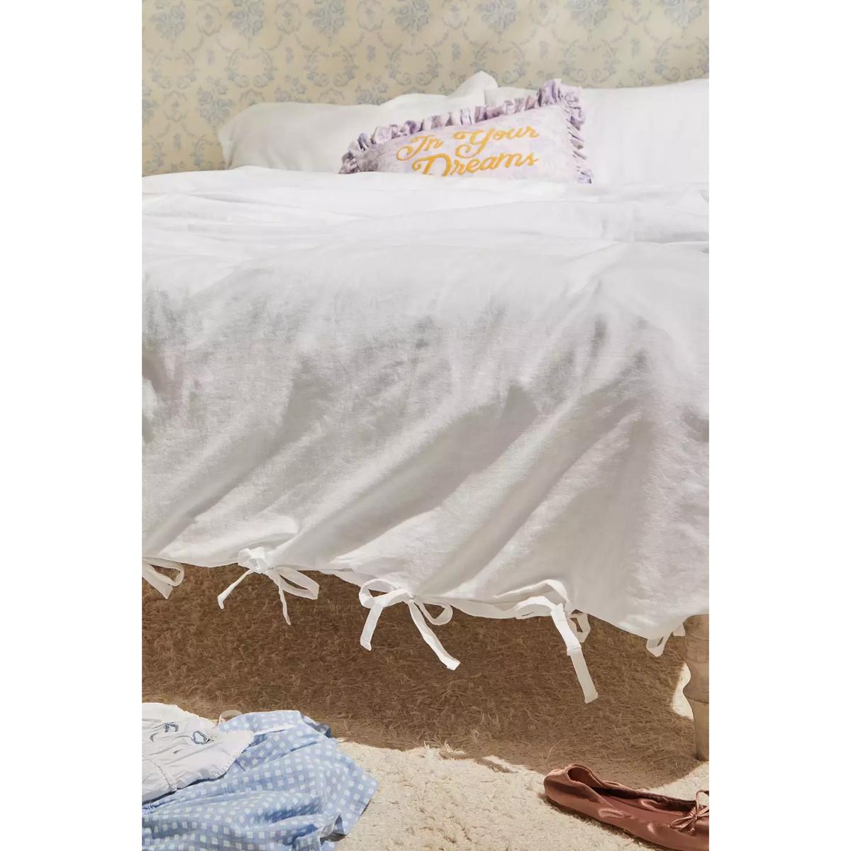 Create a kitsch sleeping space with this bow-topped duvet set. The duvet set and patching pillowcases are woven from a super-soft cotton and linen blend, complete with a plain colour design and tied ribbon seams. **Content + Care** \- 50% Cotton, 50% Linen \- Machine wash **Size** \- Double (includes 2 pillowcases): 200cm (W) x 200cm (H) \- King (includes 2 pillowcases): 230cm (W) x 220cm (H) \- Pillowcase: 75cm x 50cm