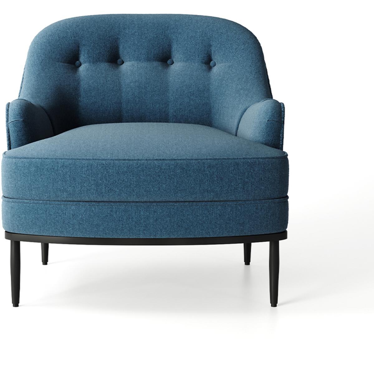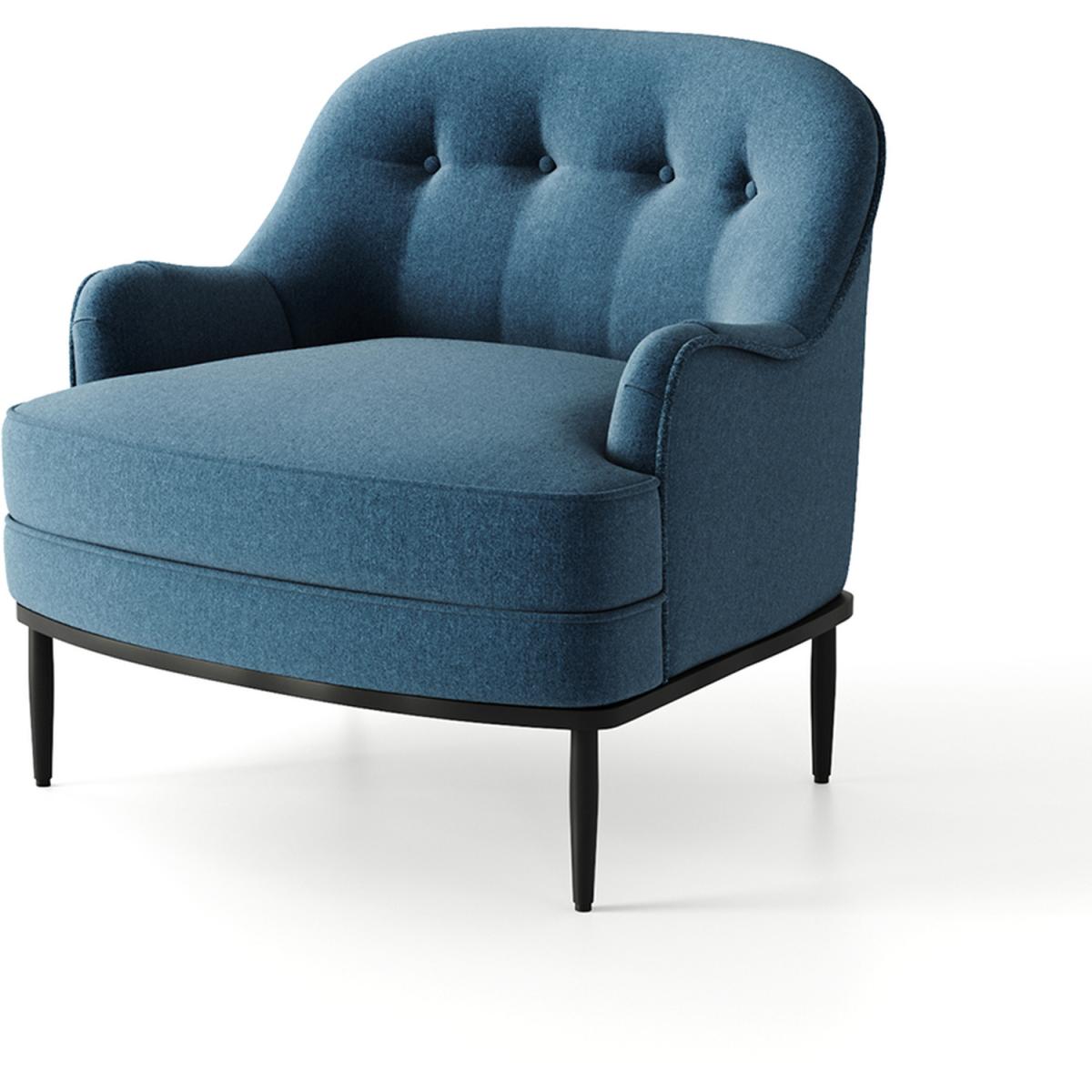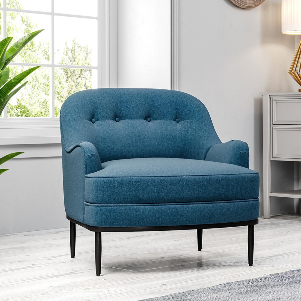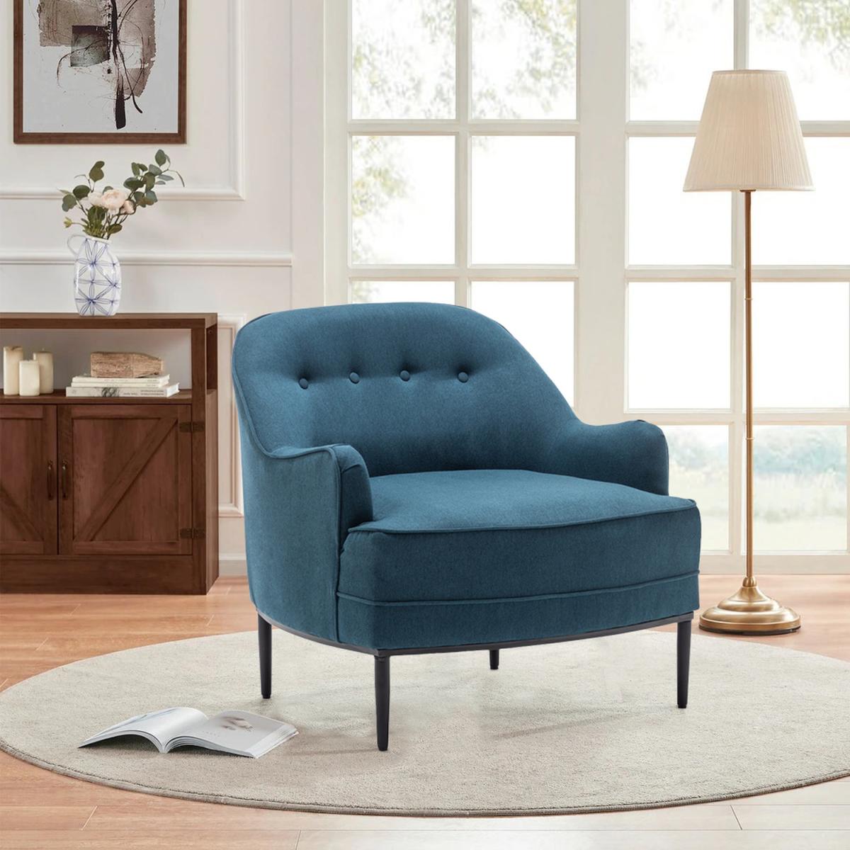 I really like this armchair for its cosy, inviting feel and the vibrant blue shade that adds a pop of colour to any space. It works particularly well in modern or mid-century inspired interiors, where its clean lines and understated elegance can shine. The padded seat and button details give it a touch of sophistication, making it versatile enough to pair with both neutral and patterned schemes. For styling tips, consider placing it alongside Brass or wooden accents, and add cushions or throws in contrasting or complementary colours to personalise your look. Its compact size also makes it ideal for smaller living rooms or reading nooks, where it can serve as a statement piece without overwhelming the space.