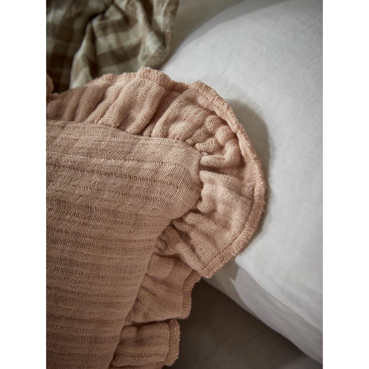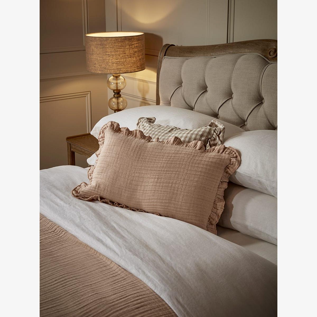 Add some gentle elegance to your space with this cushion cover. In a dusky pink, it is crafted from a luxurious linen for a supersoft and relaxed finish. Ruffle detailing graces the edge of this cushion cover, inviting delicacy and a romantic quality to you space.  Pair with our luxury linen bedspread to complete the look.  This cushion cover is suitable for a 40 x 60cm cushion pad which is available separately.