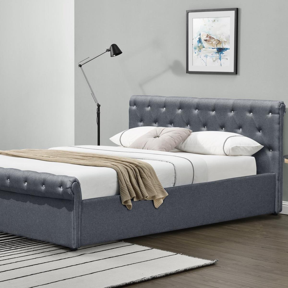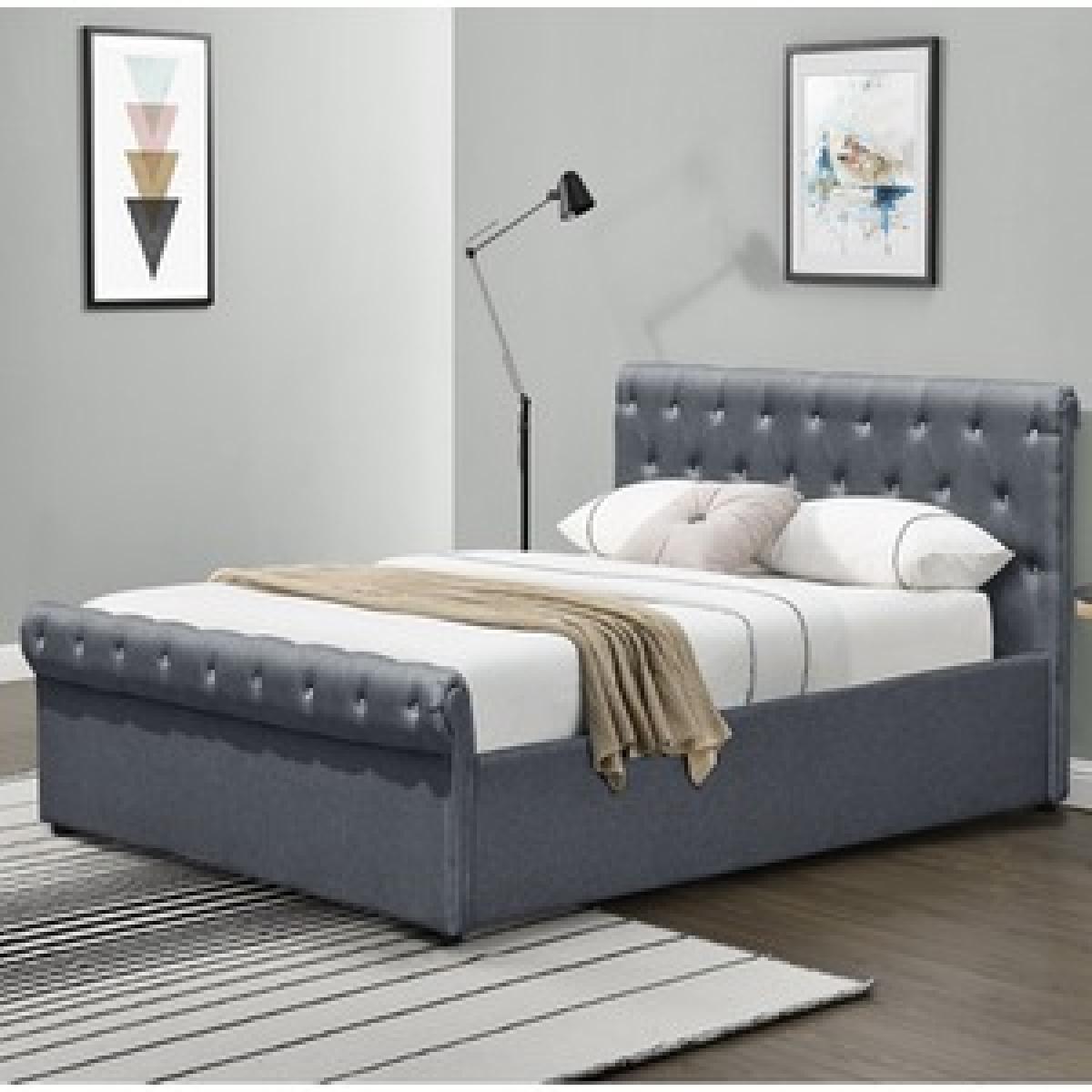 Linen Fabric Diamante Chesterfield Sleigh Bed Frame - King
