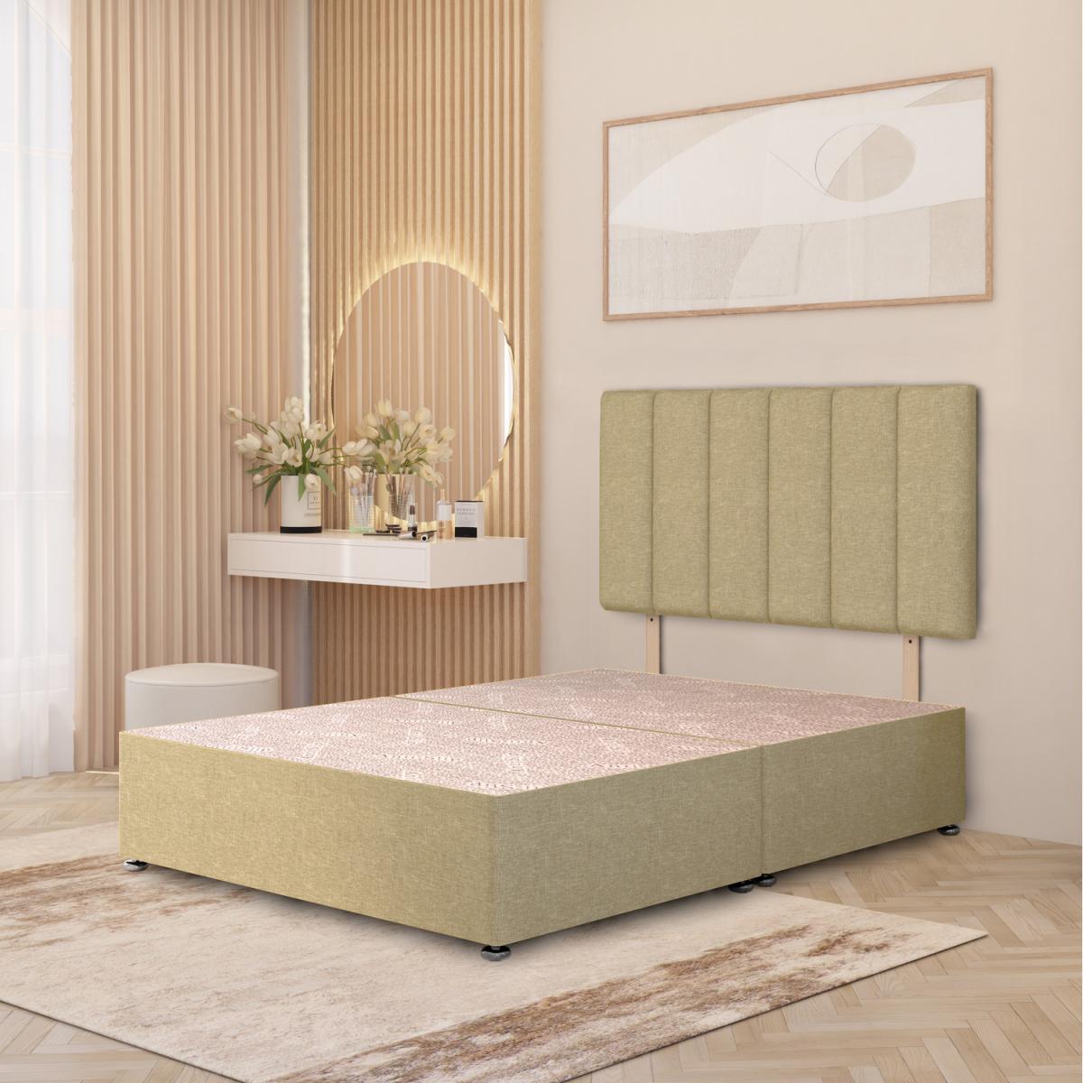 The Linen Fabric Austin Divan Bed Base with Upholstered Headboard combines classic style with lasting support. Its solid platform top offers a firm, stable surface to enhance your mattress performance and comfort. Crafted from quality timber and finished in linen fabric, it brings a refined touch to any bedroom. The matching headboard features soft, vertical cushioned panels, perfect for sitting up in bed and adding a statement of luxury and comfort. Base Height 34.5cm with gliders attached. Headboard face is 32" and adjustable overall height depending on strut placement. 2FT. 6 Small Single W 79 cm x L 193 cm, 3FT Single W 92 cm x L 193 cm, 4FT Small Double W 123 cm x L 193 cm, 4FT. 6 Double W 137 cm x L 193 cm, 5FT King W 153 cm x L 203 cm, 6FT Super King W 183 cm x L 203 cm