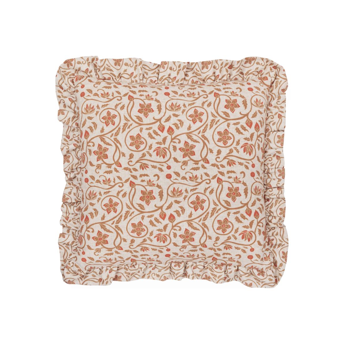 Linen Filigree Printed Ruffle Cushion Cover - Linen/Ochre