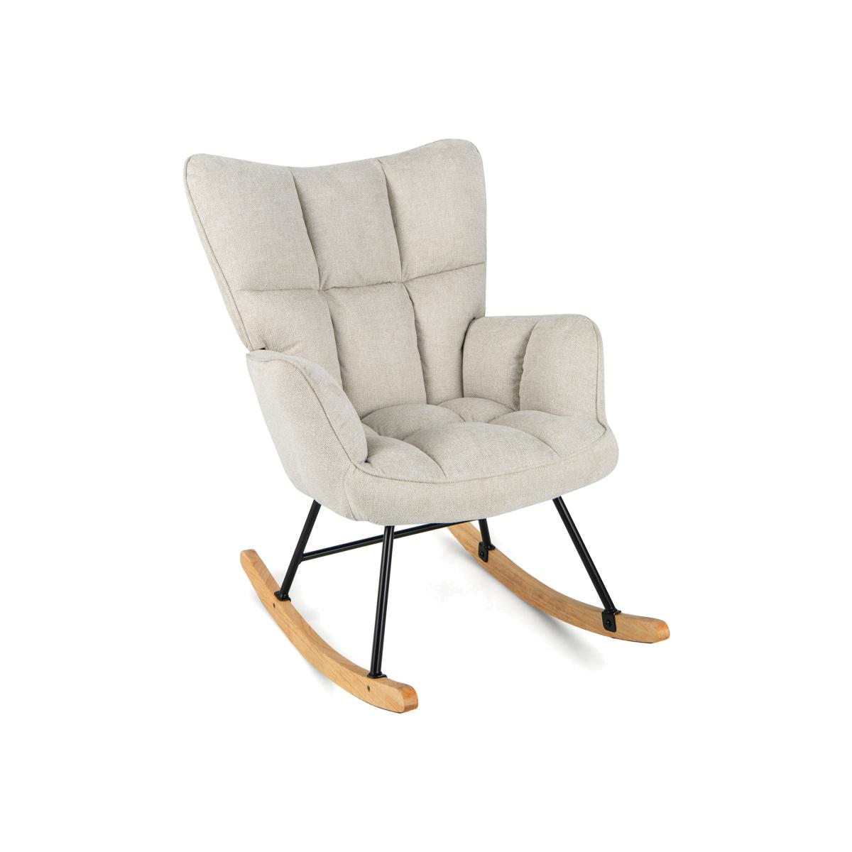 Featuring an ergonomic backrest, humanized armrests and spacious sitting area, this upholstered rocker offers ultimate comfort. Moreover, you can rock for more relaxation. Upholstered in breathable linen fabric with a high-density sponge filling, the rocker glider chair is comfortable to sit on. Additionally, the sturdy metal legs and a solid rubber wood base contribute to overall stability, allowing the rocking accent chair to support up to 160 kg.