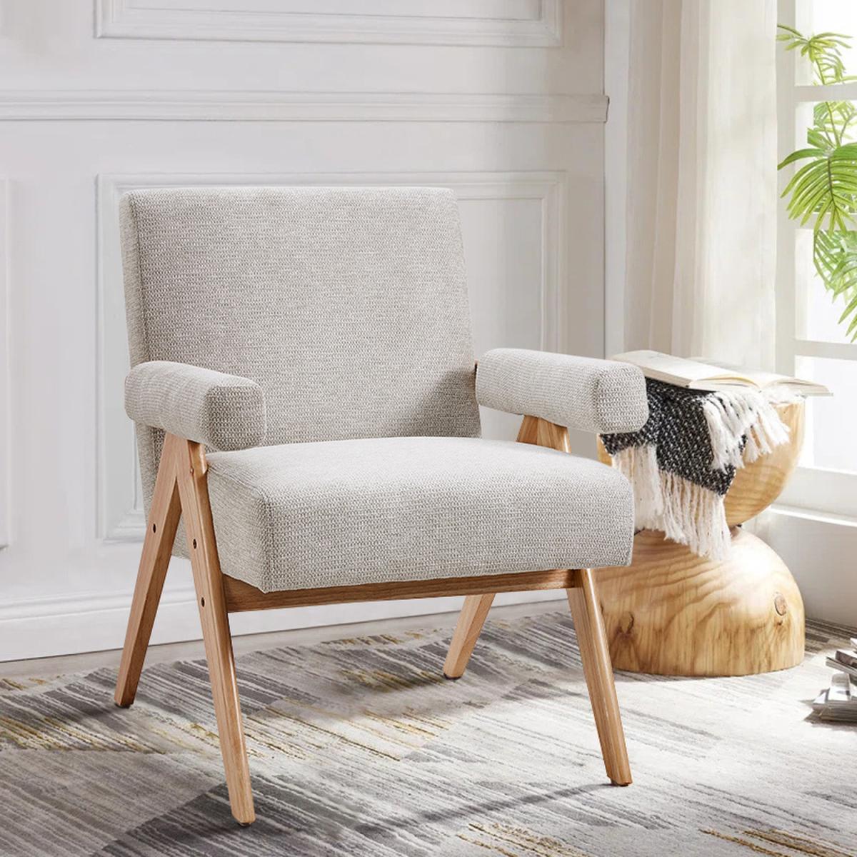 I’m a fan of this linen-upholstered armchair for its clean lines, neutral tone and the way its light oak legs lift a room visually. It works equally well in Scandi-inspired living areas, modern country schemes or pared-back minimal spaces. To style, add a textured cushion in a muted contrast shade (think slate grey or dusky pink) and drape a knitted throw over one arm for extra comfort. Position it beside a slim console or a small side table topped with a ceramic lamp to create a cosy reading nook, and anchor the look with a jute or low-pile rug.