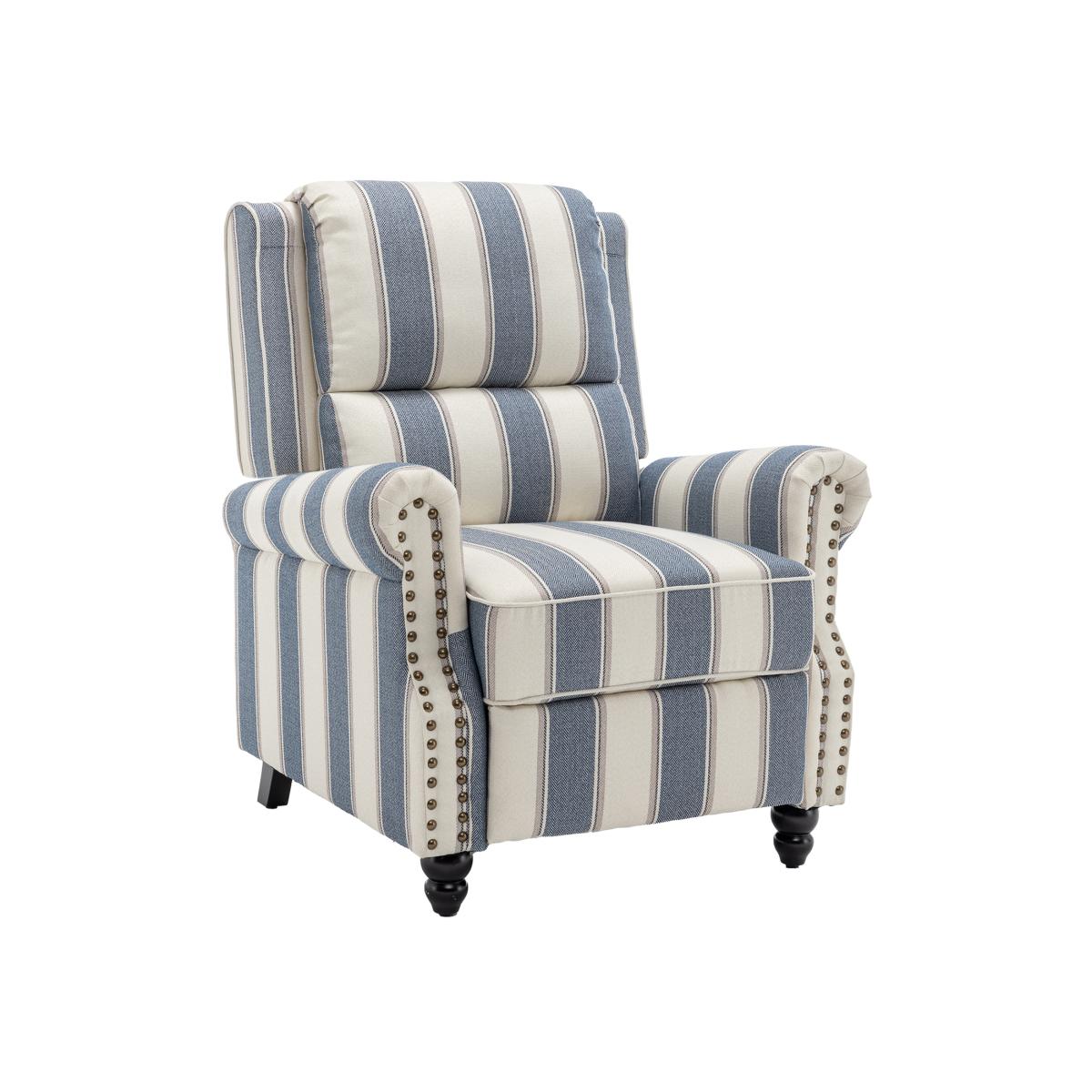 This recliner armchair blends modern style with everyday comfort Its blue and white striped design brings a fresh coastal feel that brightens any room Made from high quality linen fabric it offers excellent breathability and a naturally cool seating experience The integrated backrest and armrests follow the natural shape of the body providing firm support to the waist back and arms and helping to reduce discomfort from long periods of sitting Decorative rivet detailing along the edges adds a subtle vintage touch while the strong wooden legs offer reliable support and a refined finish that suits modern interiors.