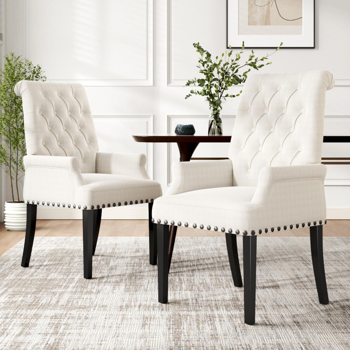 I love this beige-white linen armchair for its timeless elegance and versatility. Its neutral colour and classic tufted design make it a great addition to both traditional and contemporary interiors, providing a sophisticated yet cosy feel. It works particularly well in dining spaces or as a statement accent in living rooms, especially when paired with neutral or softly coloured accessories. For styling tips, consider contrasting the fabric with darker wood or metal accents to highlight its understated charm, and add cushions in textured fabrics or subtle patterns for extra comfort and visual interest. This armchair is practical too - its upholstery is easy to clean, making it ideal for everyday use.